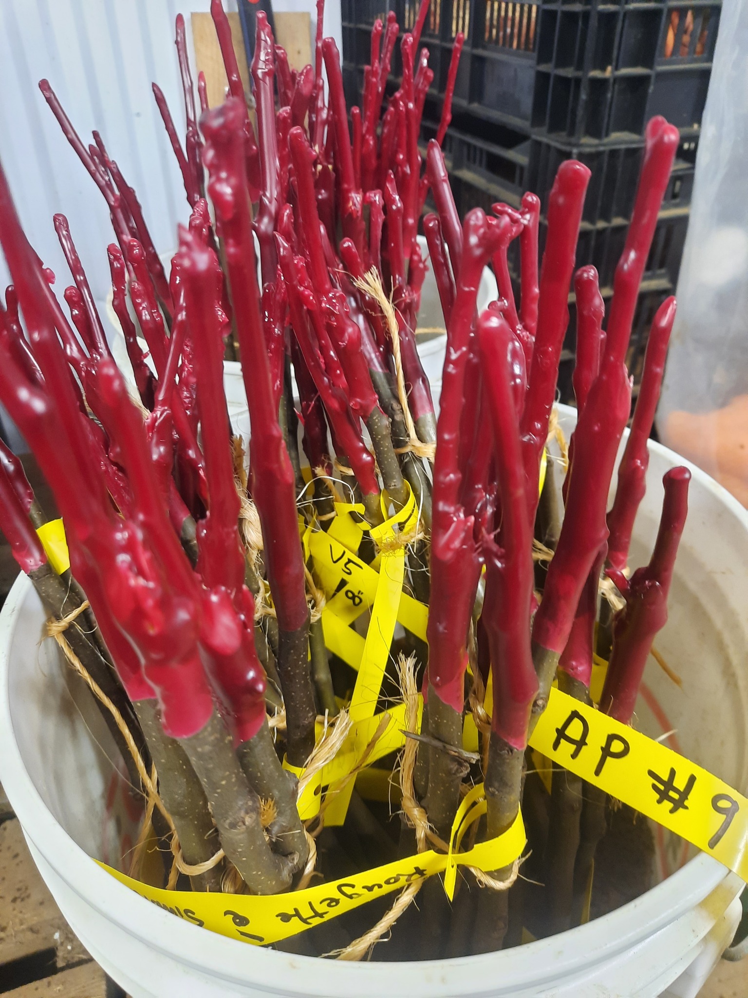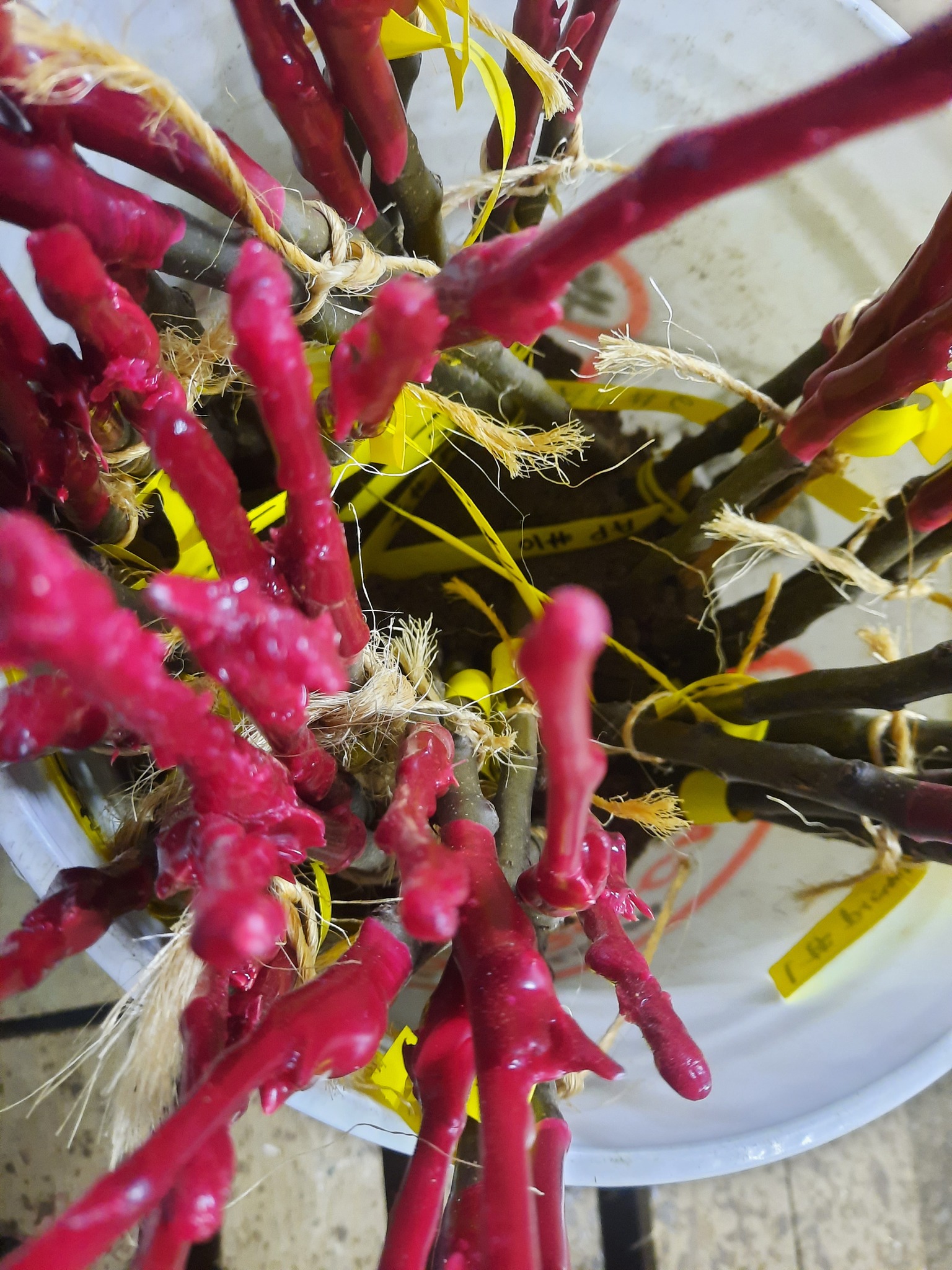 Quelques deux heures durant, triant les meilleurs scions, pour m’aider, l’artisan a oeuvré, avec sa machine à greffer, tandis que j’écrivais mes codes secrets sur les étiquettes, réceptionnait les arbres assemblés, les trempait brièvement dans la cire chaude, et un peu plus longtemps dans l’eau tiède, avant de les ficeler ensemble par variétés pour finalement les mettre dans les chaudières de sable humide qui les attendaient.