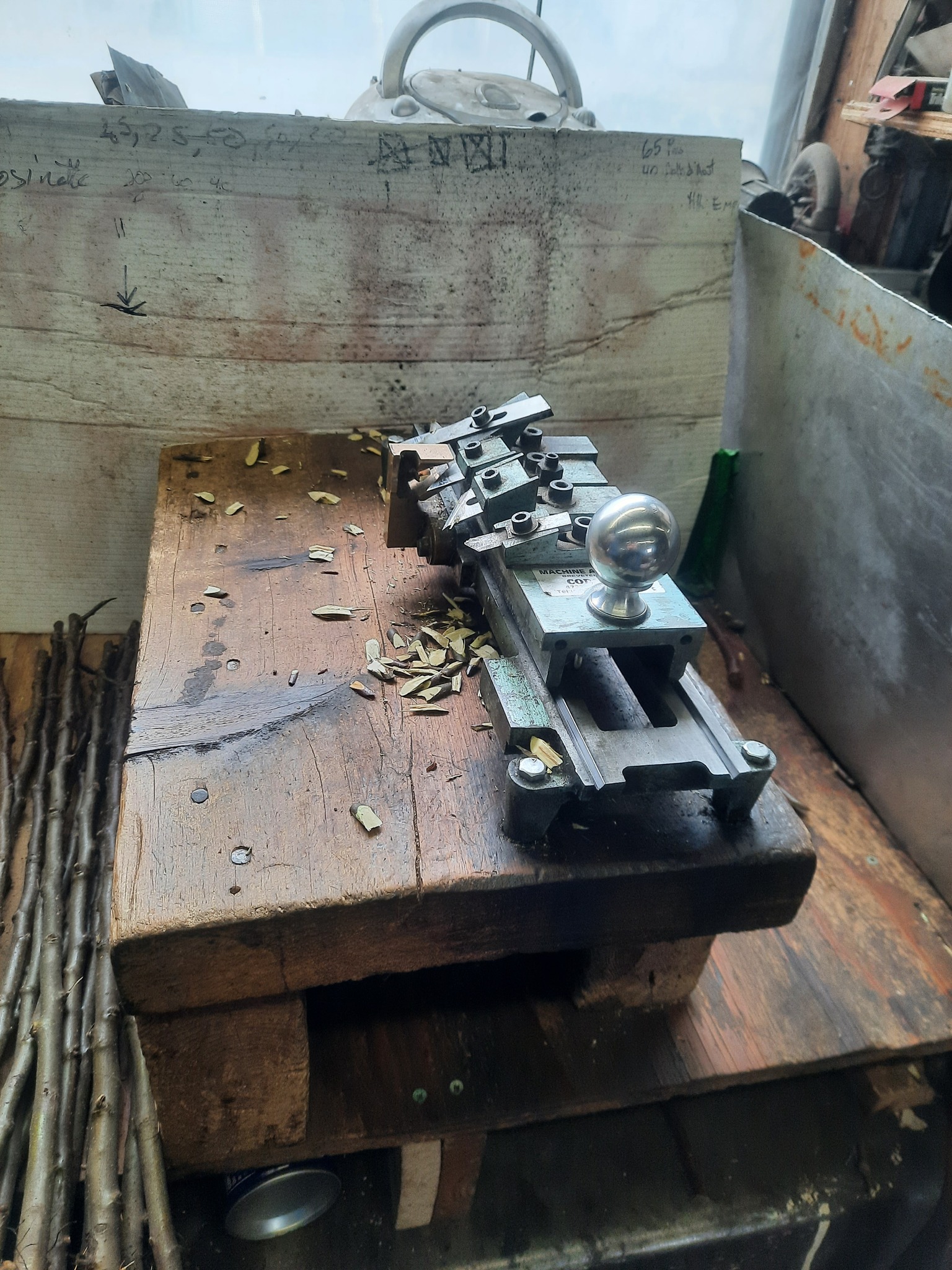 L’activité a eu lieu dans un garage, chez un producteur de pommes, où étaient de passage d’autres producteurs de pommes de la place, et le cueilleur de sauvageonnes que je suis. Je suis débarqué là avec tout mon bois récolté de l’année, provenant d’une presque cinquantaine de pommiers.