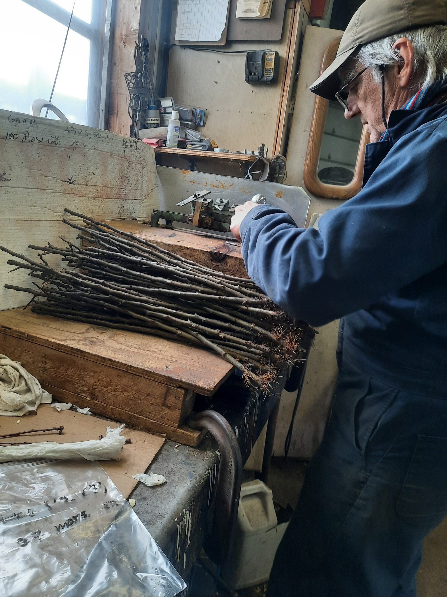 Dans un élan de générosité (donnant au suivant, comme il a reçu de ses mentors à ses débuts), il m’avait invité à le retrouver avec mes scions, collectés en mars et avril sur les spécimens anciens ou sauvages qui se sont mérités cette année ma sélection. L’arboriculteur-hybrideur de renom m’a fait don d’une centaine de porte-greffes, réservés pour mes greffons. À ma demande, il a commandé des MM111. Ceux-ci ont le potentiel d’atteindre près de 80% des dimensions d’un arbre franc (semis), ainsi qu’une perspective de longévité d’un siècle et plus, à la différence de porte-greffes nains ou semi-nains qui, bien que portant à fruits plus rapidement, ne vivent que le temps d’une seule génération.