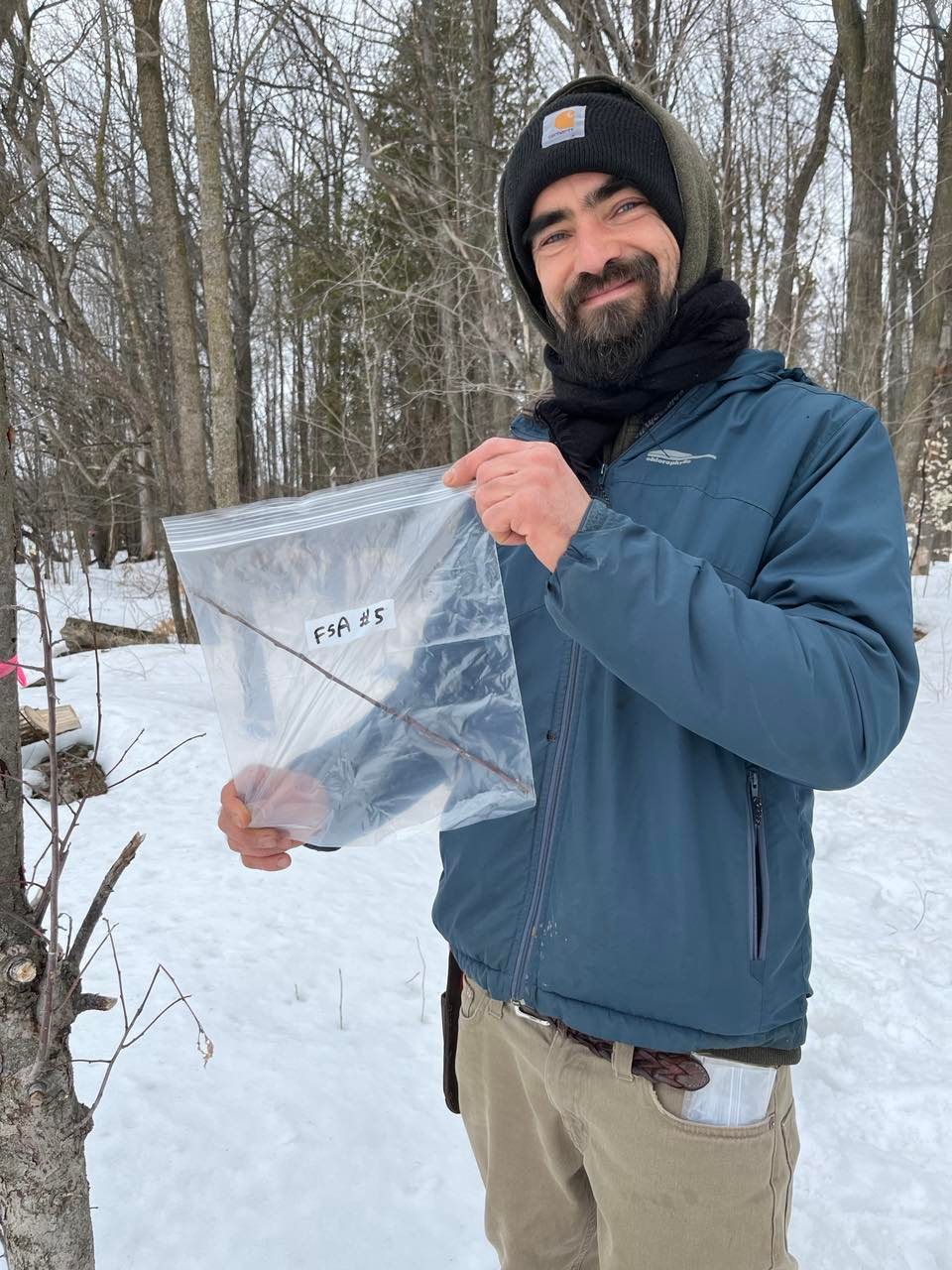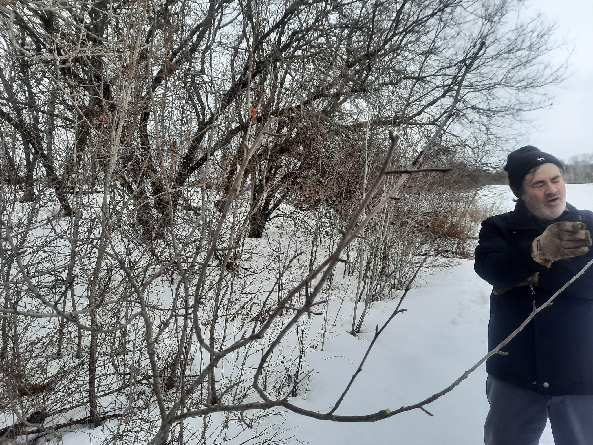 En contrepartie pour son formidable cadeau, et suivant ses voeux, je me suis fait le transporteur du bois de greffe du sauvageon aux pommettes à chair rouge, découvert dans une friche de Saint-Ambroise-de-Kildare. Je lui ai également partagé des scions de pommiers dont les fruits présentent passablement d’amertume, ce qui peut présenter un intérêt en cidrerie.