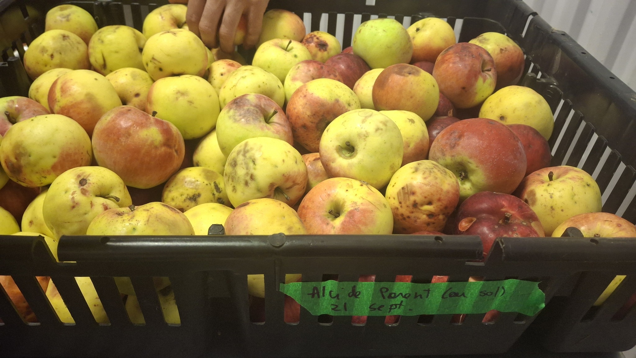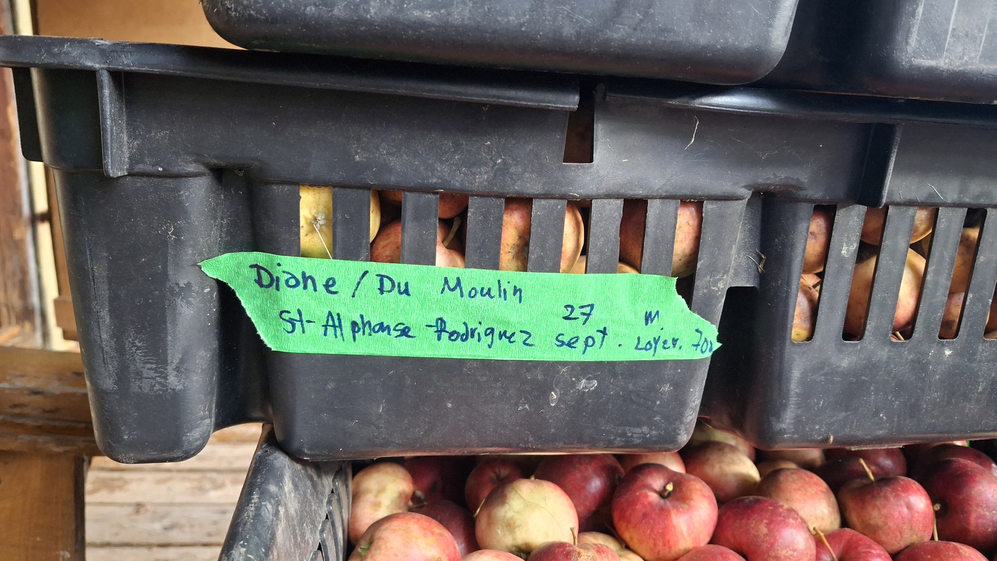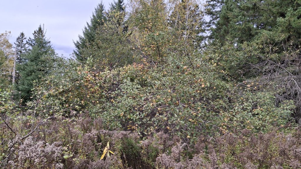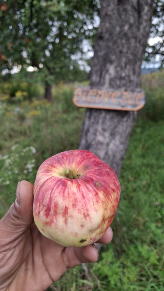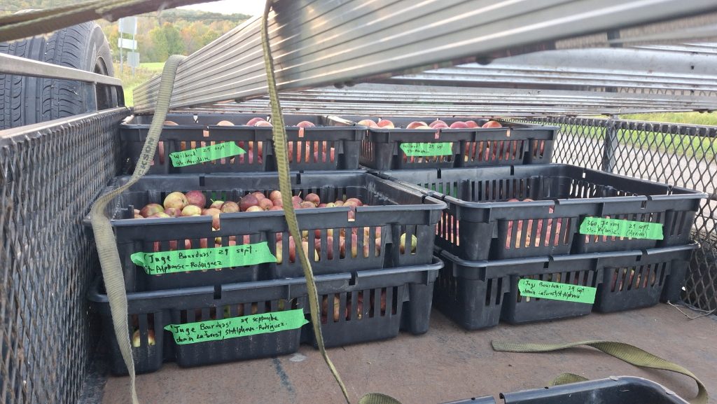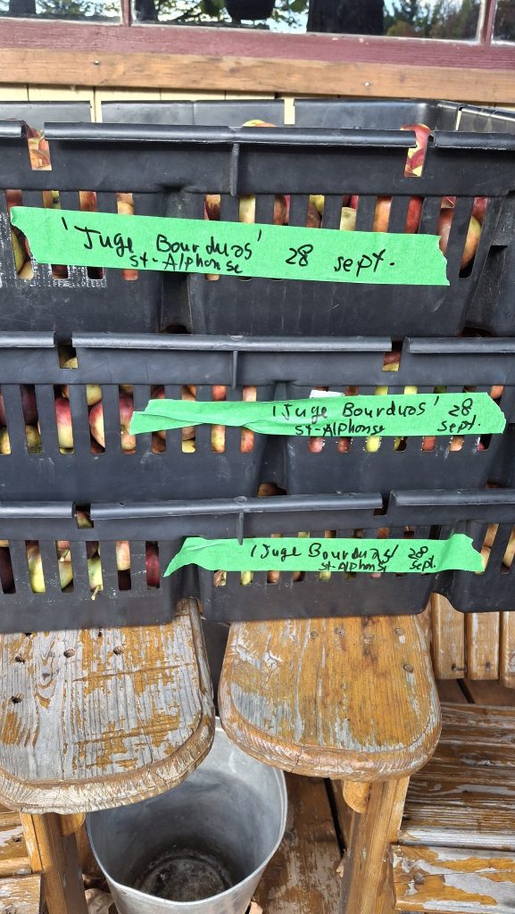 Pomme aux arômes distincts de bananes, ayant également une assez franche amertume. Clin d’oeil à Claude Jolicoeur : je l’appelle pour l’instant ‘Banane amère de Lanaudière’Coloris et formes, mais aussi étiquettes en ruban vert, pour les distinguer, en plus du tableur numérique où tout est consigné.Une première dizaine de caisses remplies, avant la mi-septembreIl y aura une petite histoire de la pomme ‘Juge Bourduas’ à écrire. Et un cidre à expérimenter. Comptez sur moi !Du rang St-Guillaume de St-Jean-de-Matha, riche en pommiers sauvages.Du rang St-Guillaume de St-Jean-de-Matha, riche en pommiers sauvages – bis.