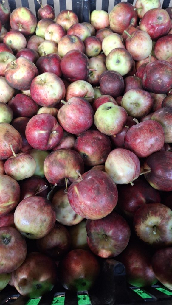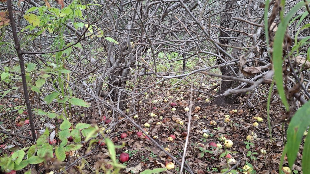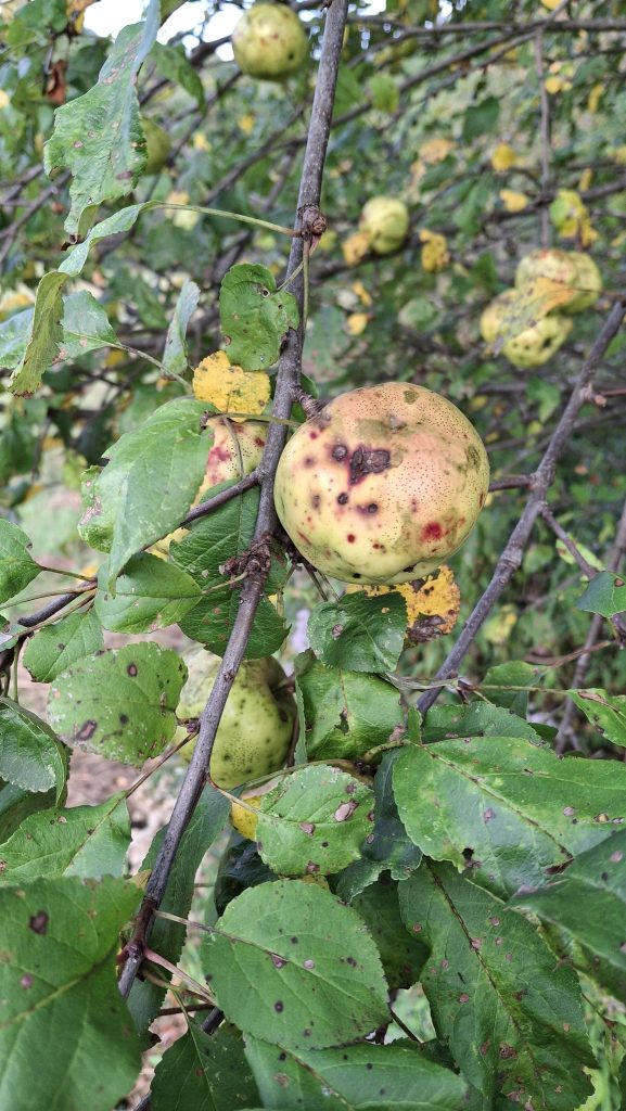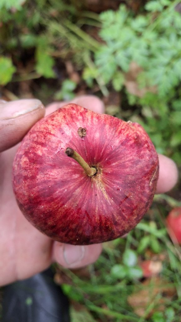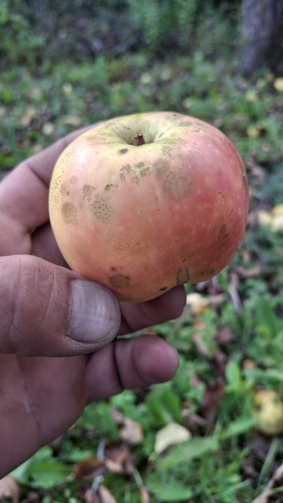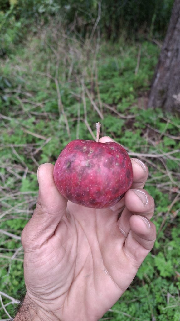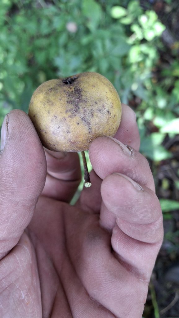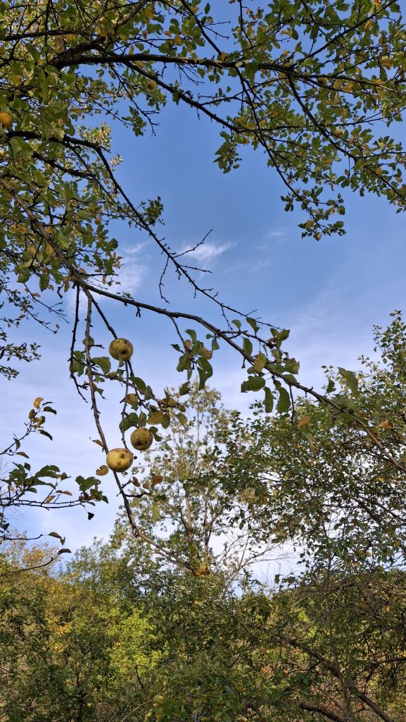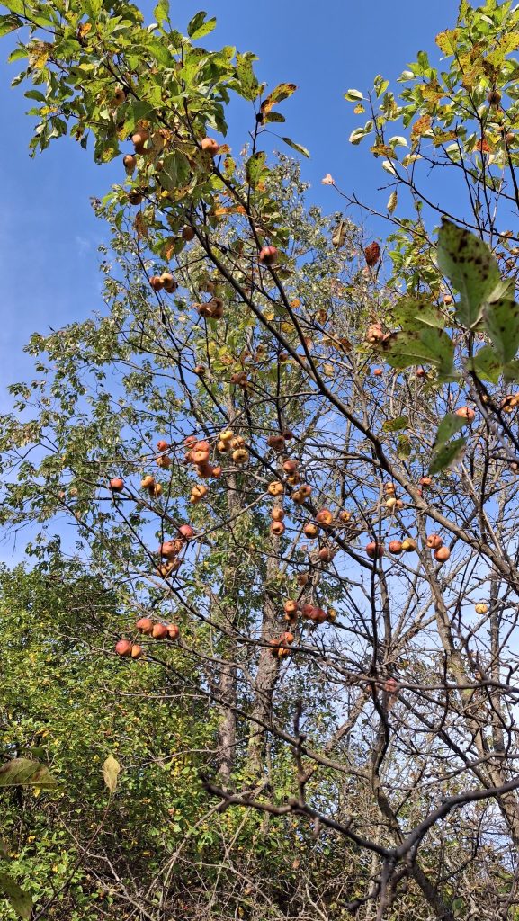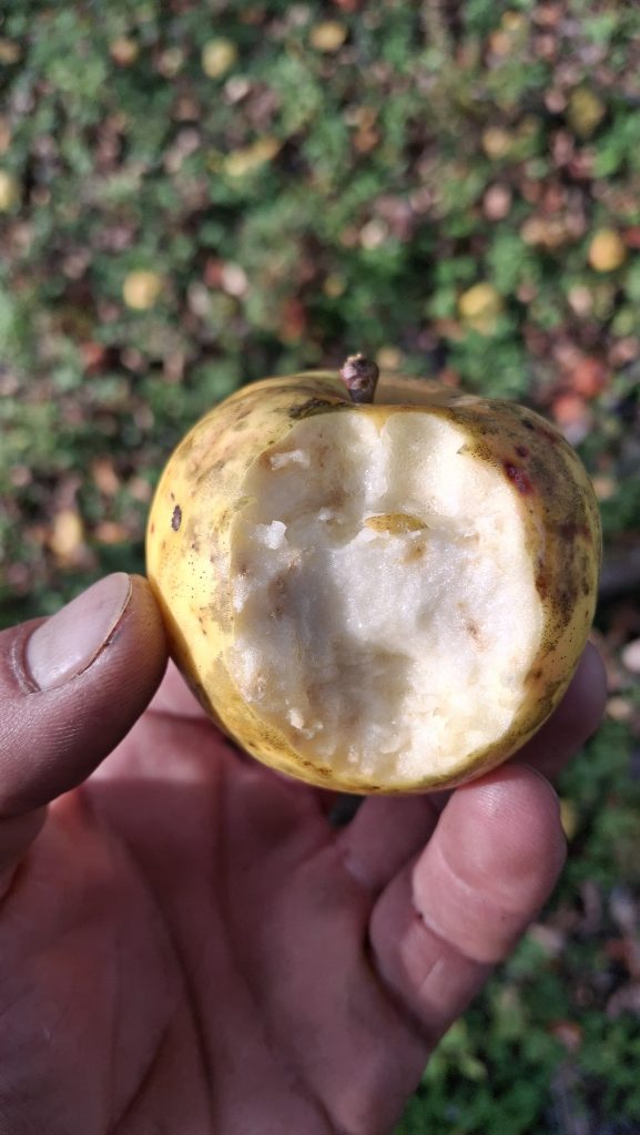 Des petites pommes (avec des gènes de pommette, sans doute), brassées d’un arbre de bord de route, de l’autre côté de la clôture du Camping Campus, à Sainte-Mélanie.