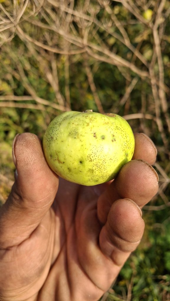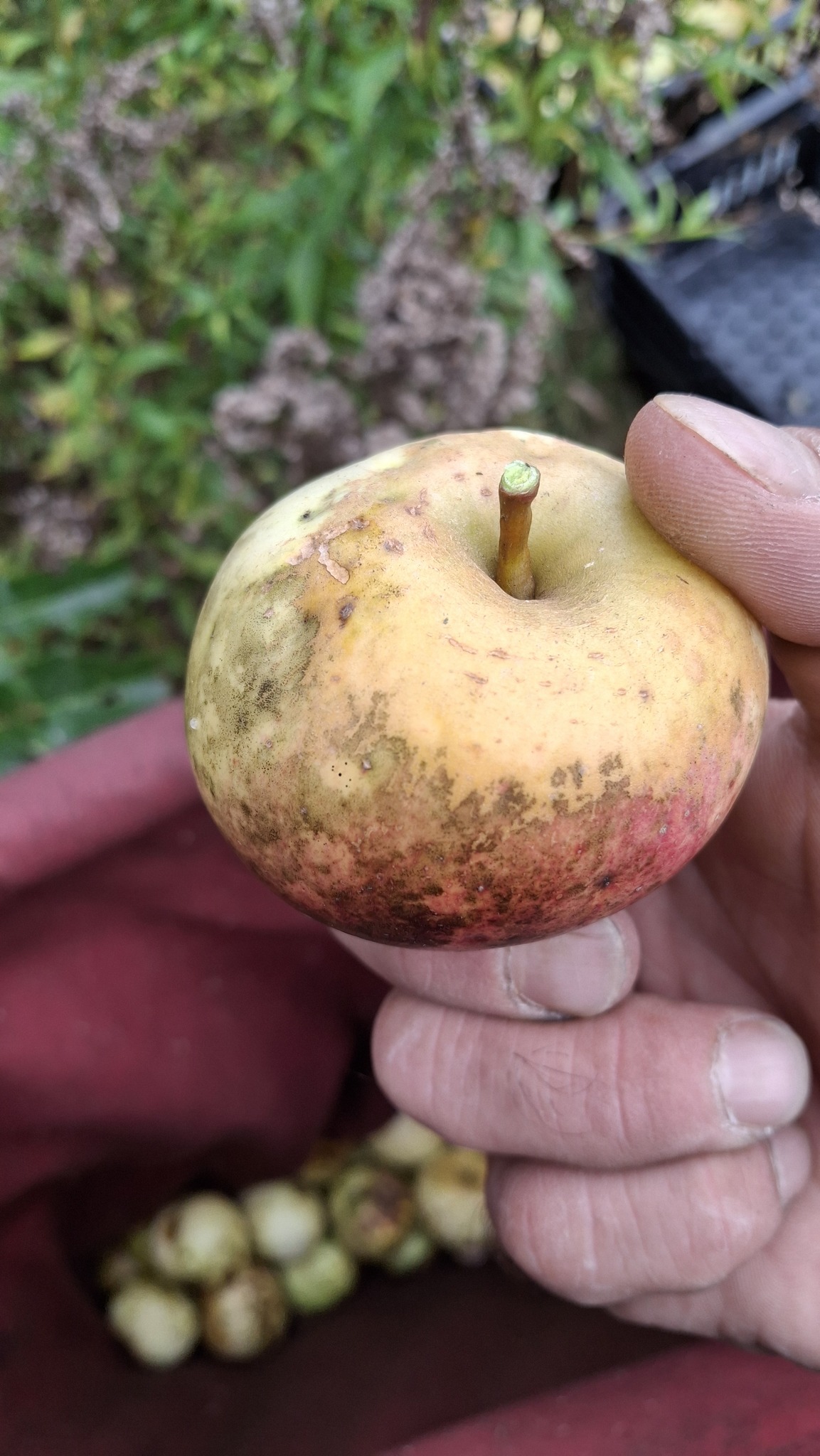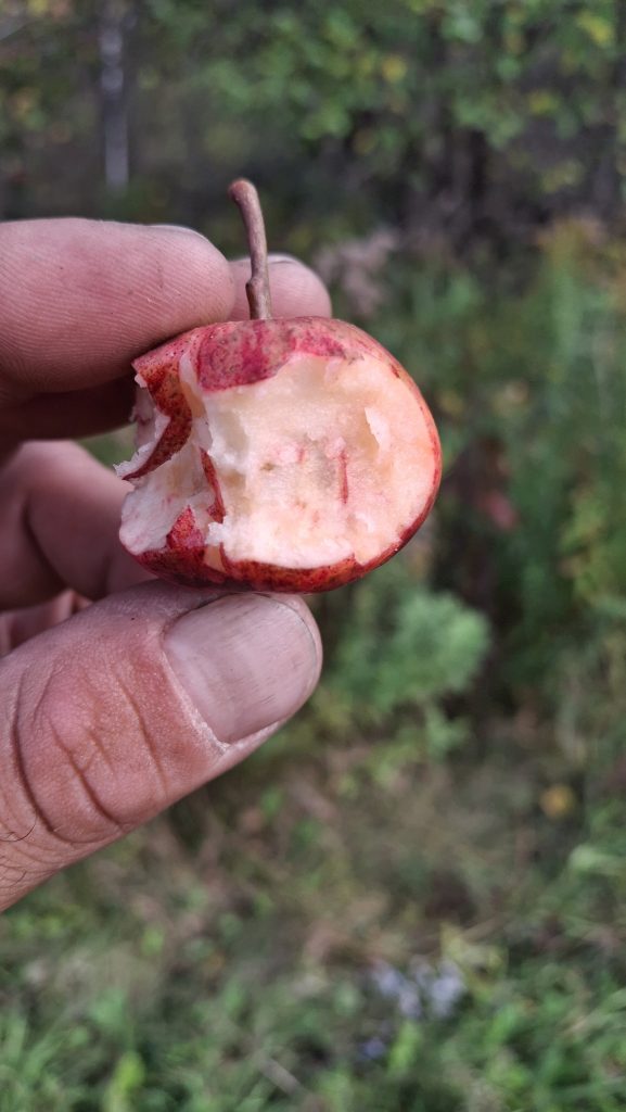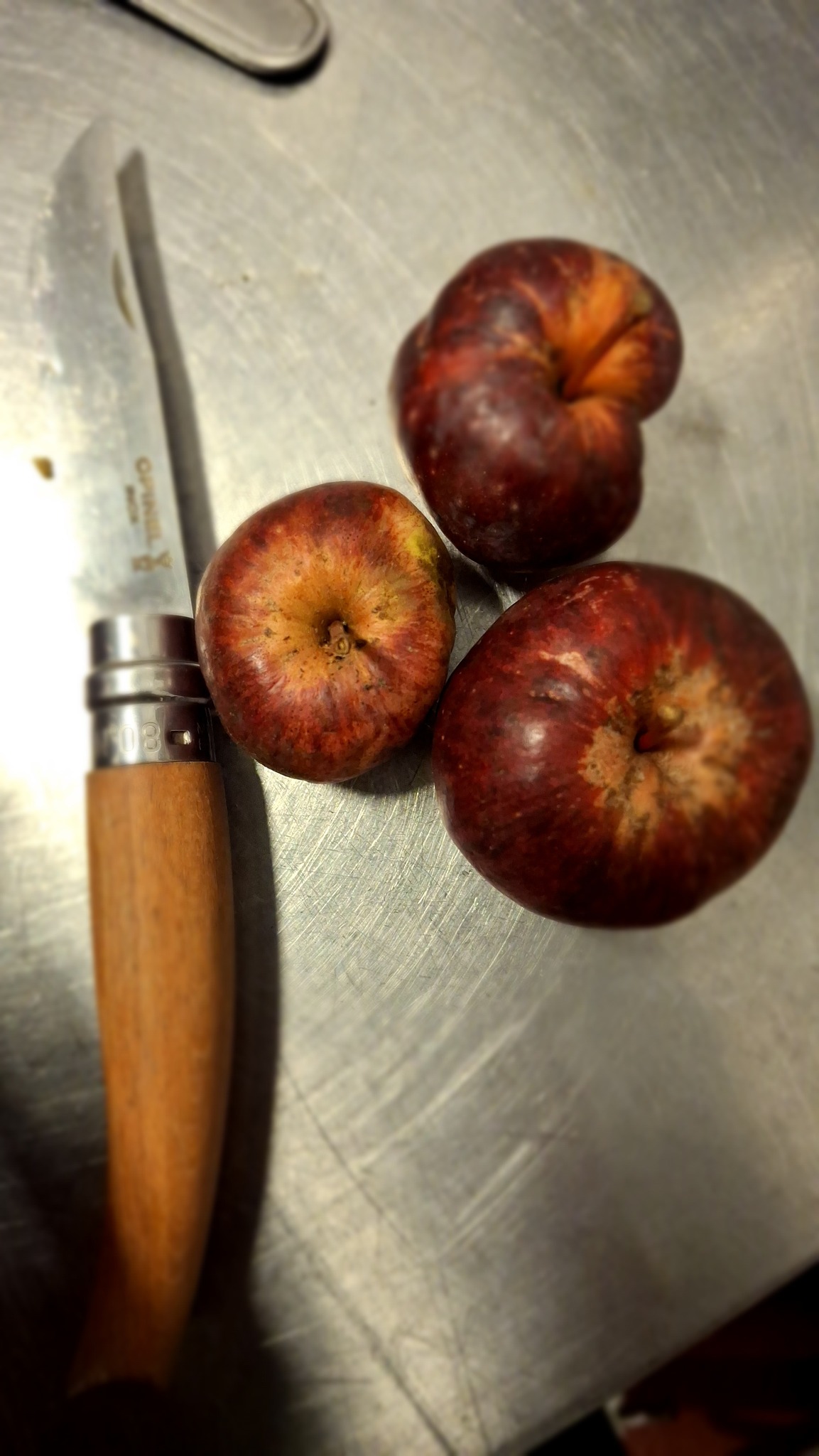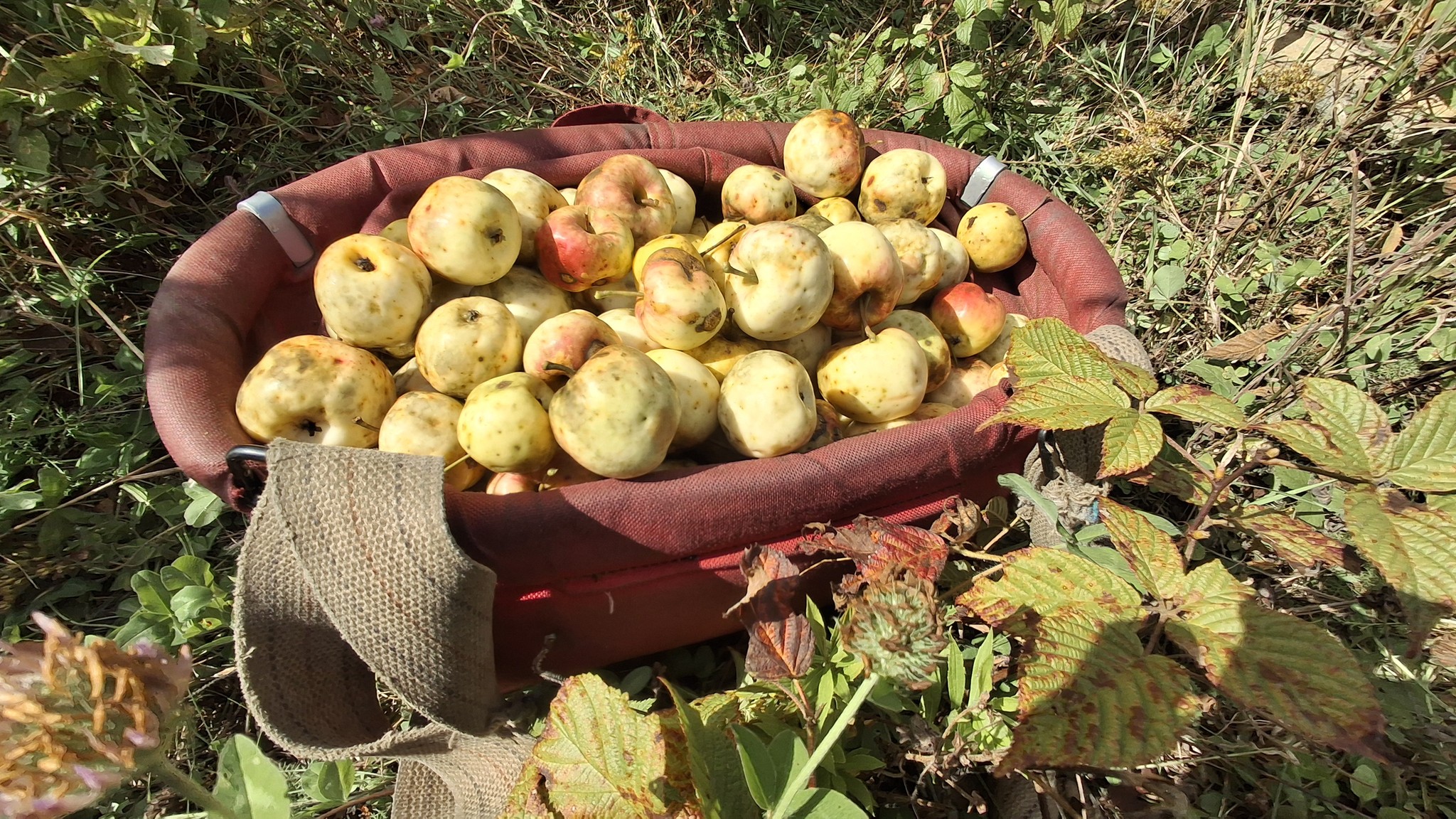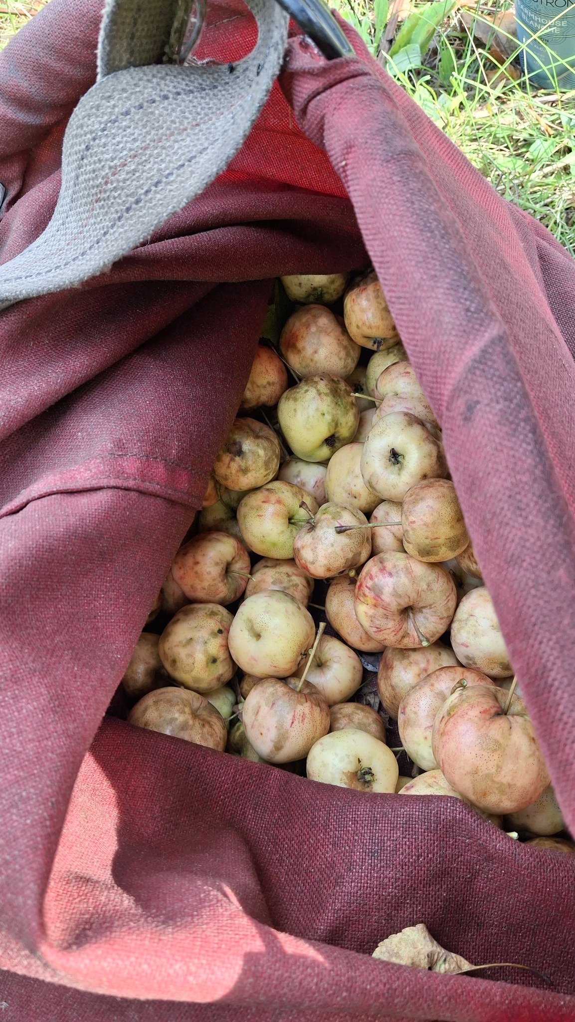 Des petites pommes (avec des gènes de pommette, sans doute), brassées d’un arbre de bord de route, de l’autre côté de la clôture du Camping Campus, à Sainte-Mélanie.