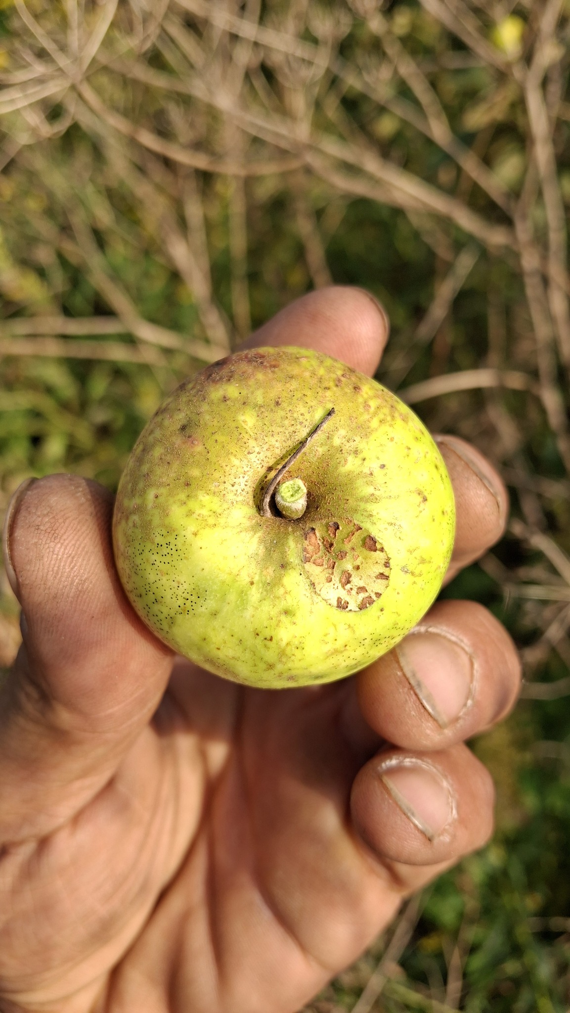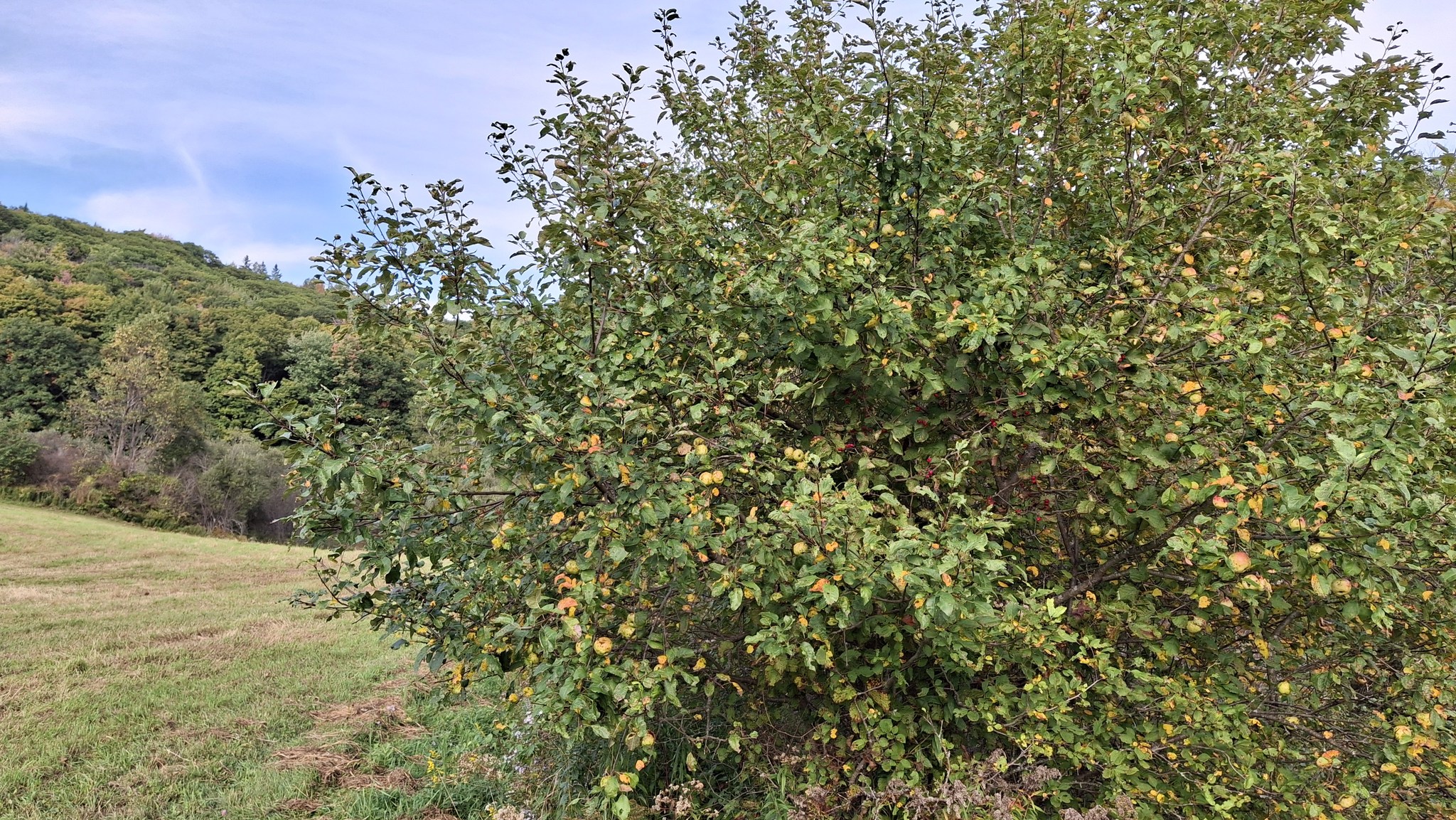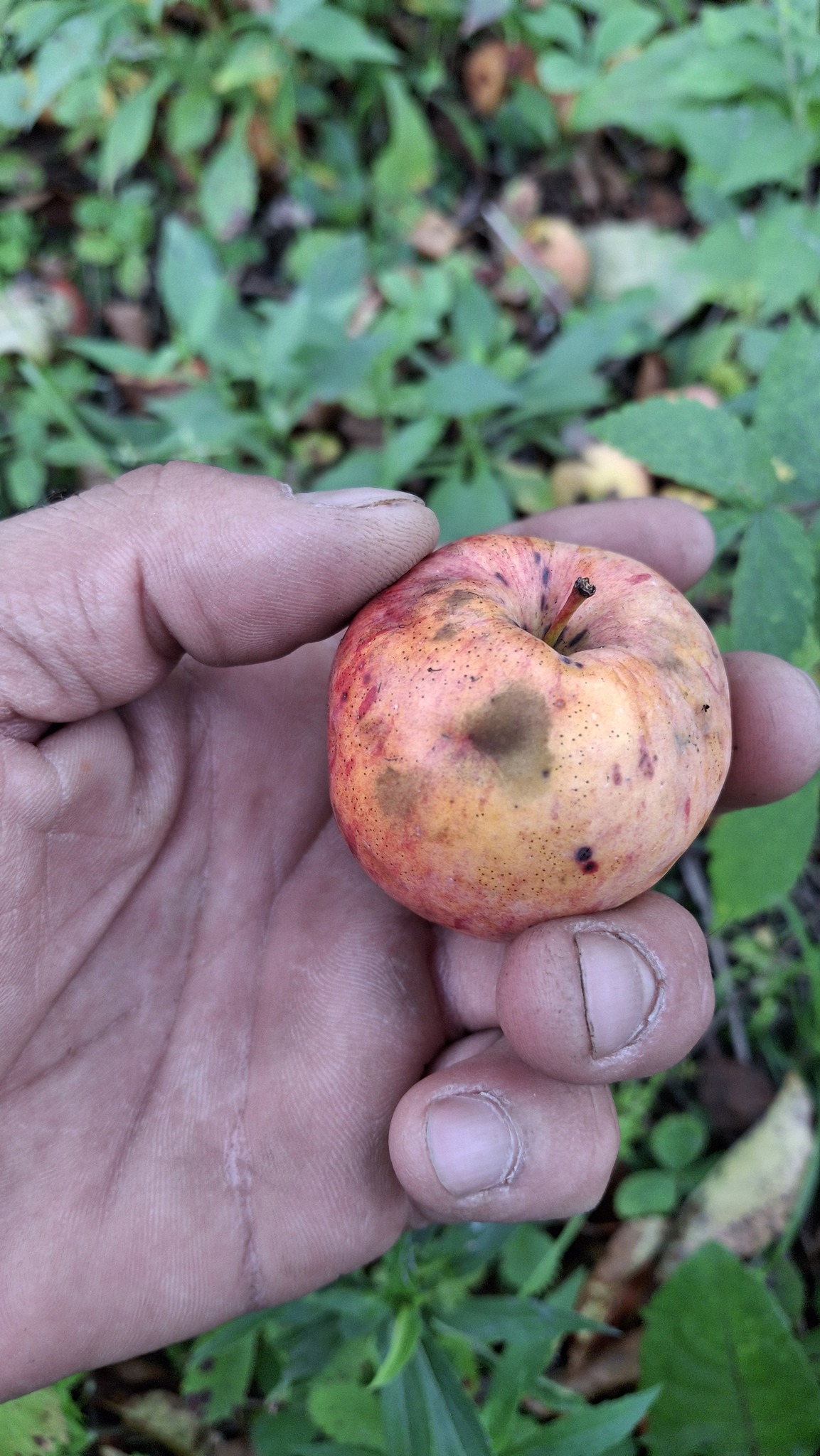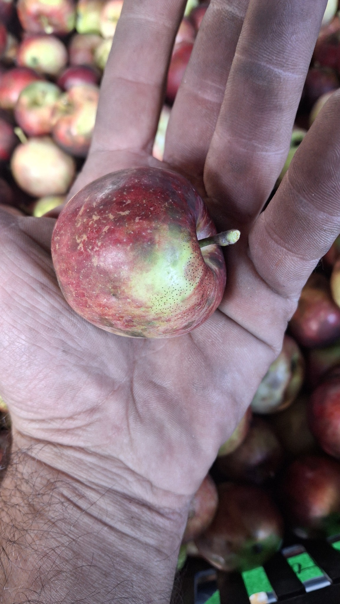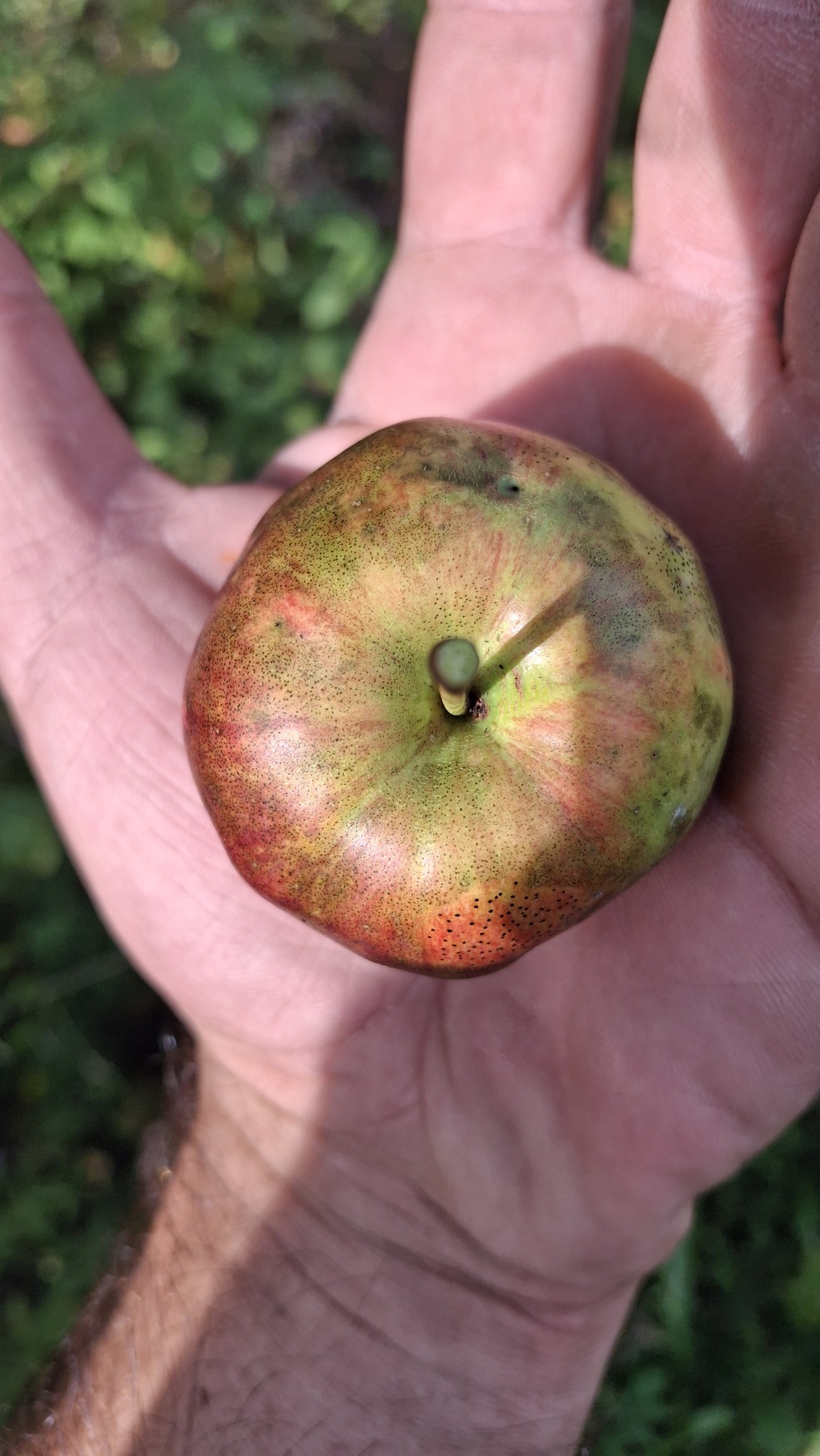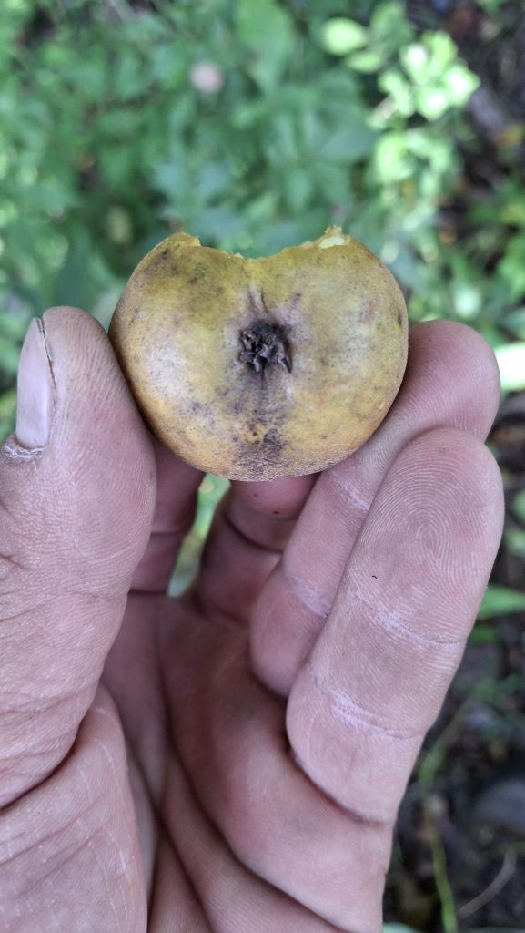 Des petites pommes (avec des gènes de pommette, sans doute), brassées d’un arbre de bord de route, de l’autre côté de la clôture du Camping Campus, à Sainte-Mélanie.