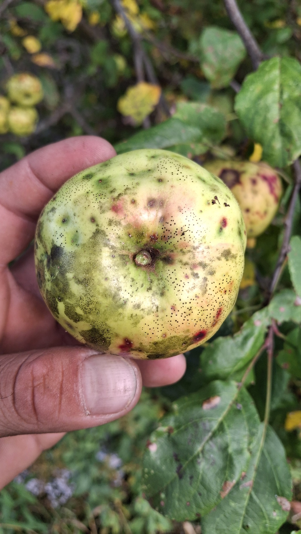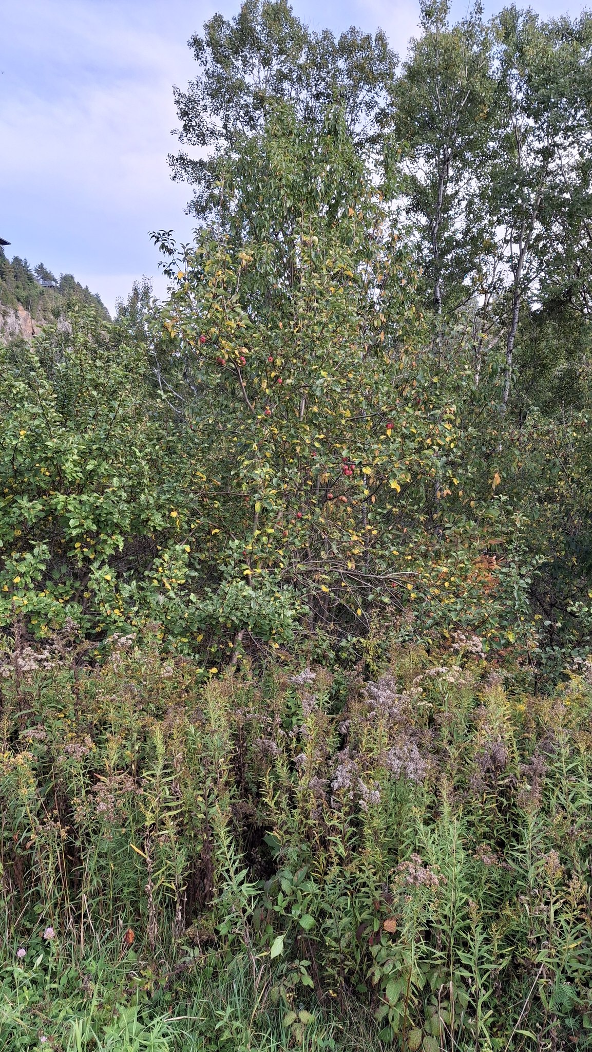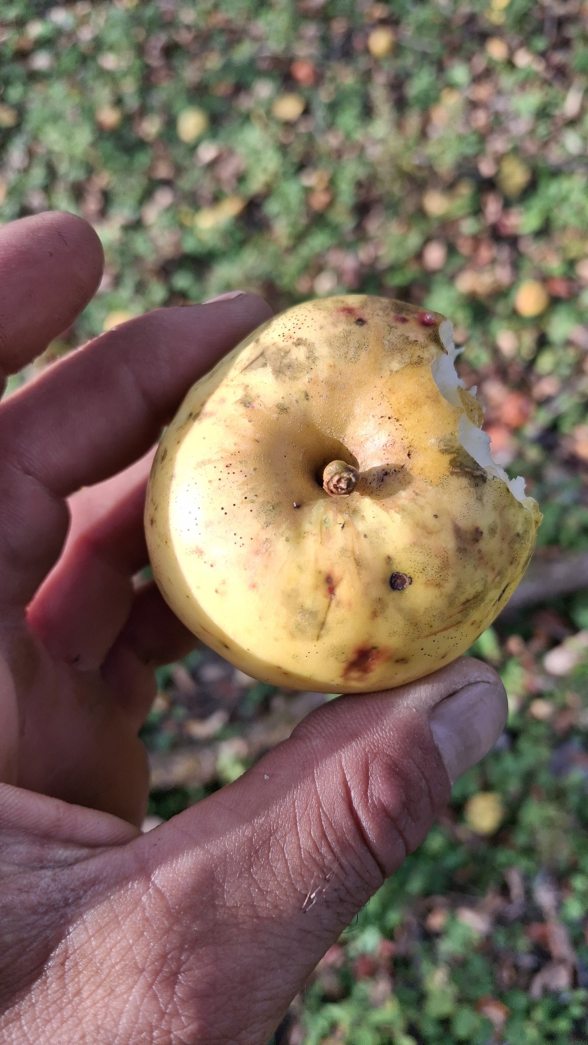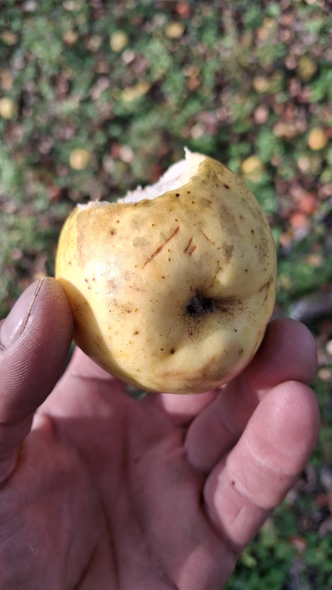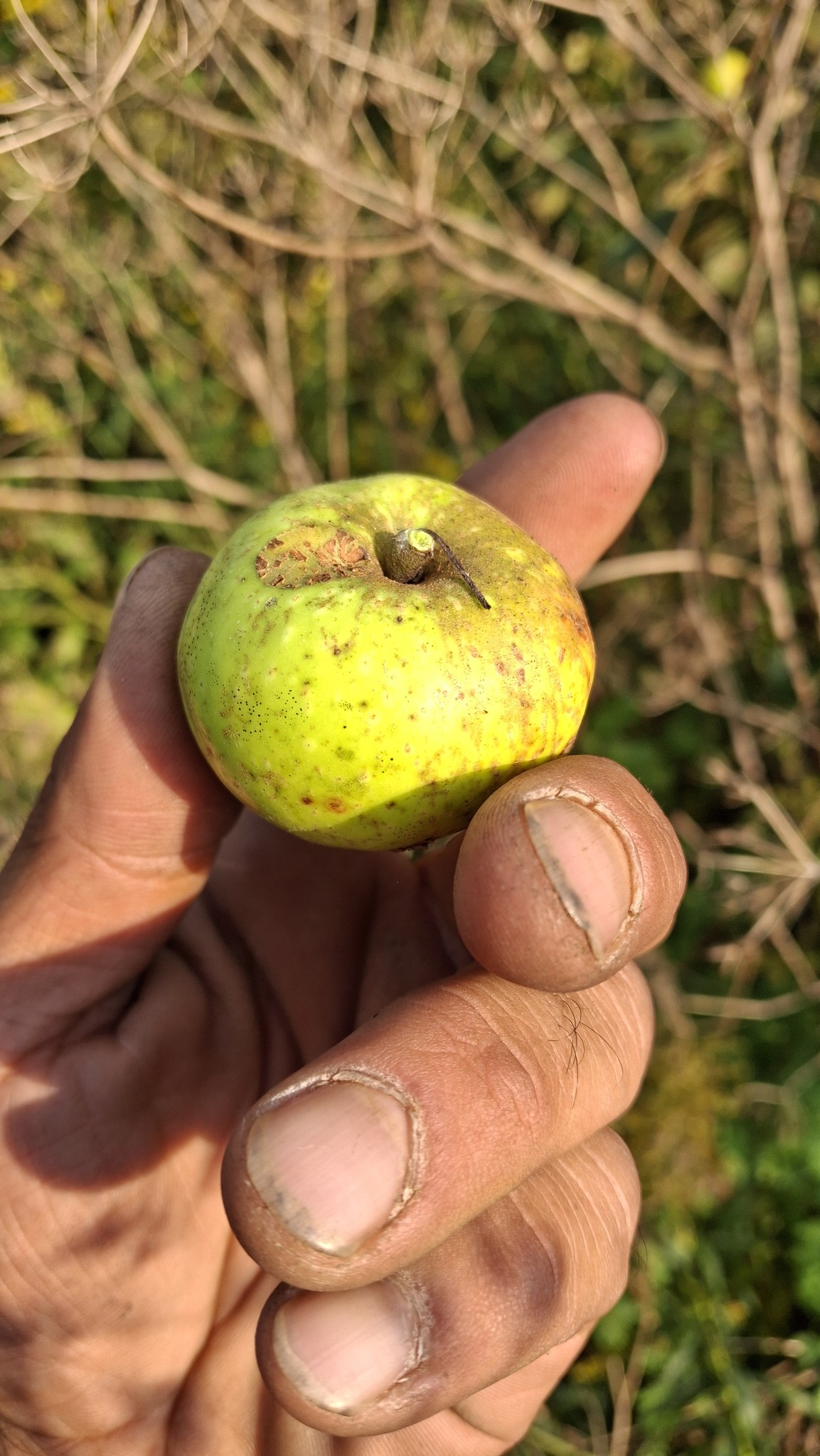 Des petites pommes (avec des gènes de pommette, sans doute), brassées d’un arbre de bord de route, de l’autre côté de la clôture du Camping Campus, à Sainte-Mélanie.