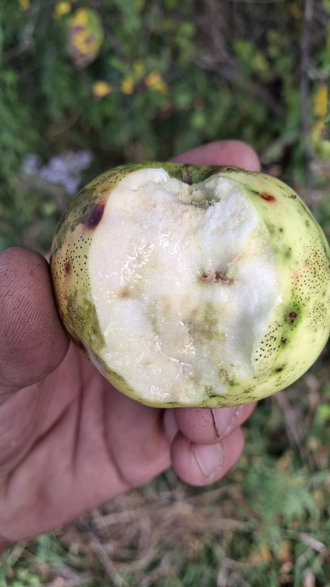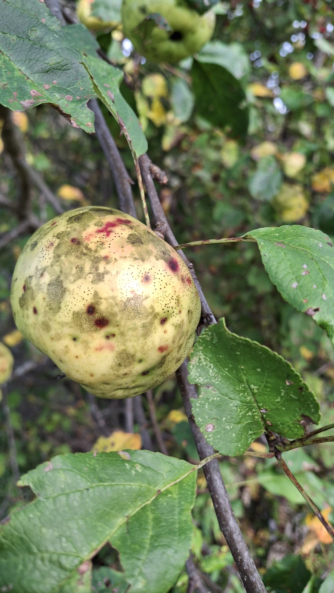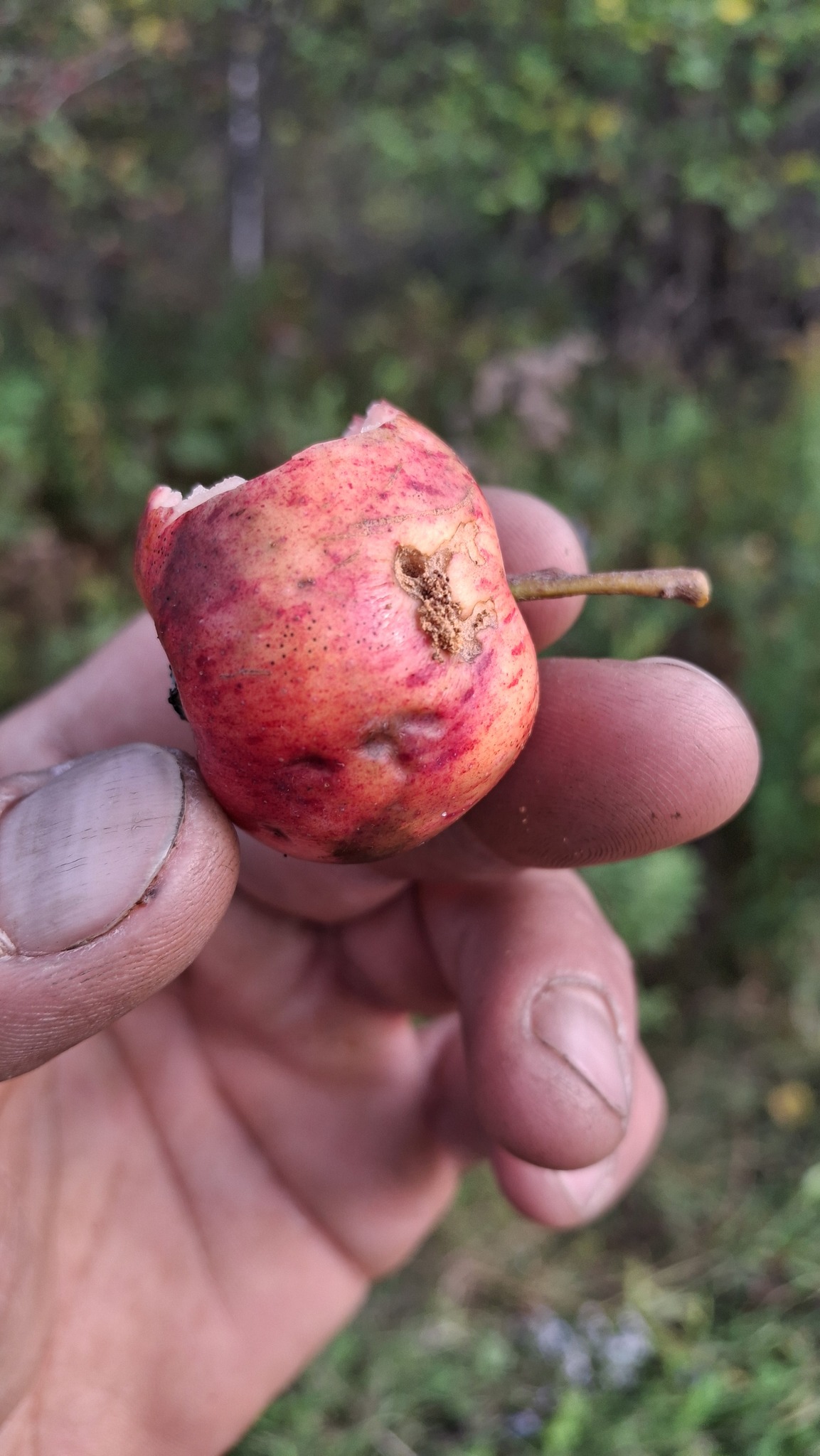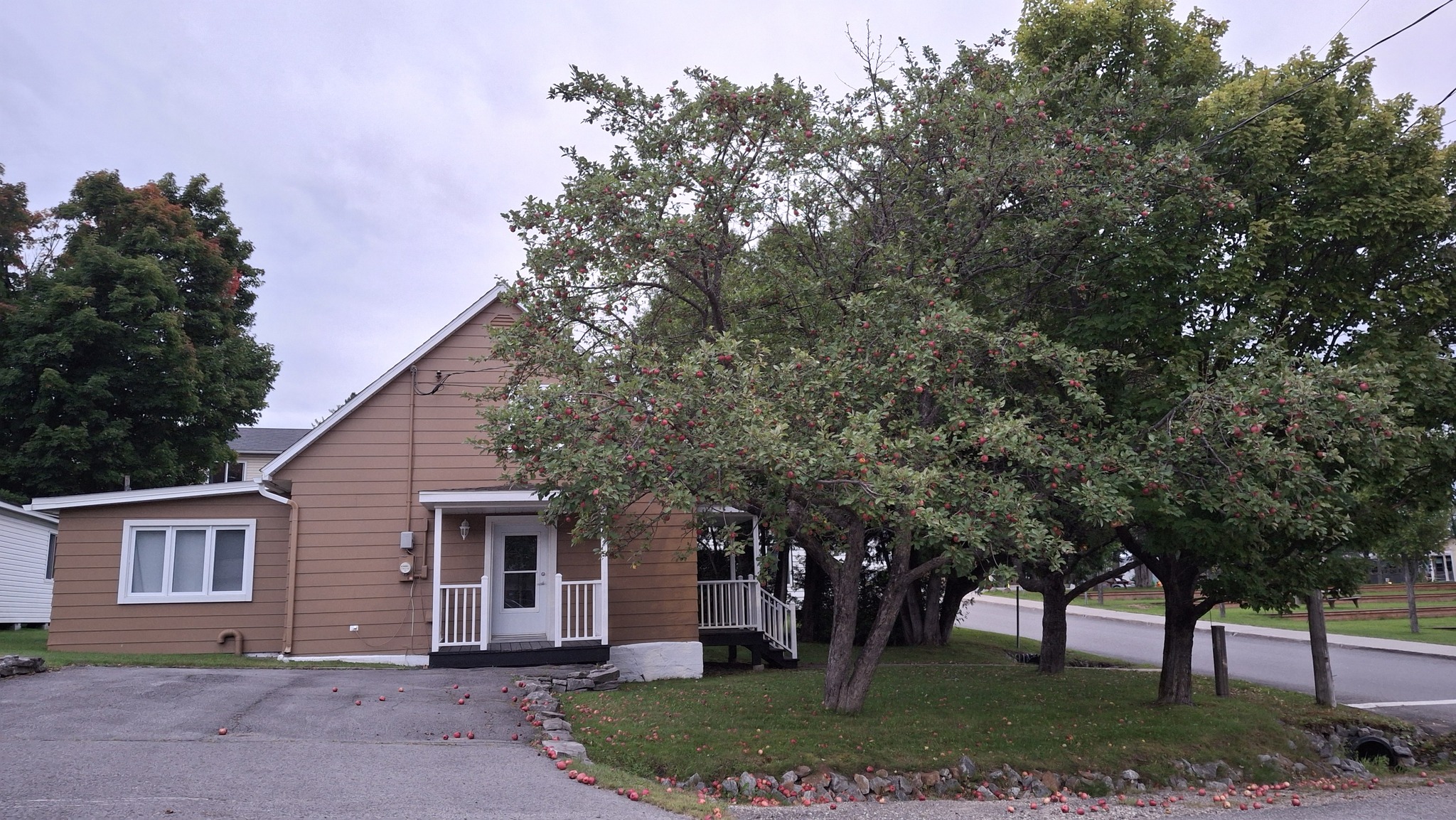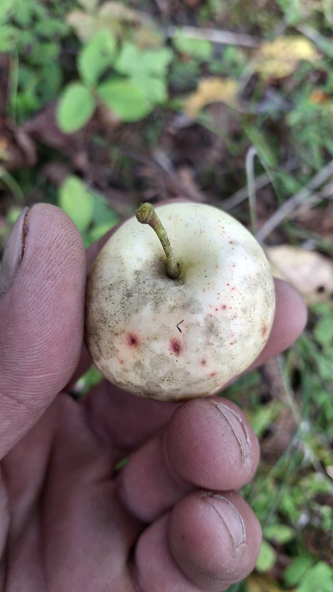 Des petites pommes (avec des gènes de pommette, sans doute), brassées d’un arbre de bord de route, de l’autre côté de la clôture du Camping Campus, à Sainte-Mélanie.