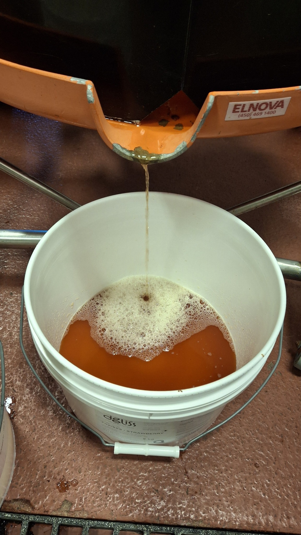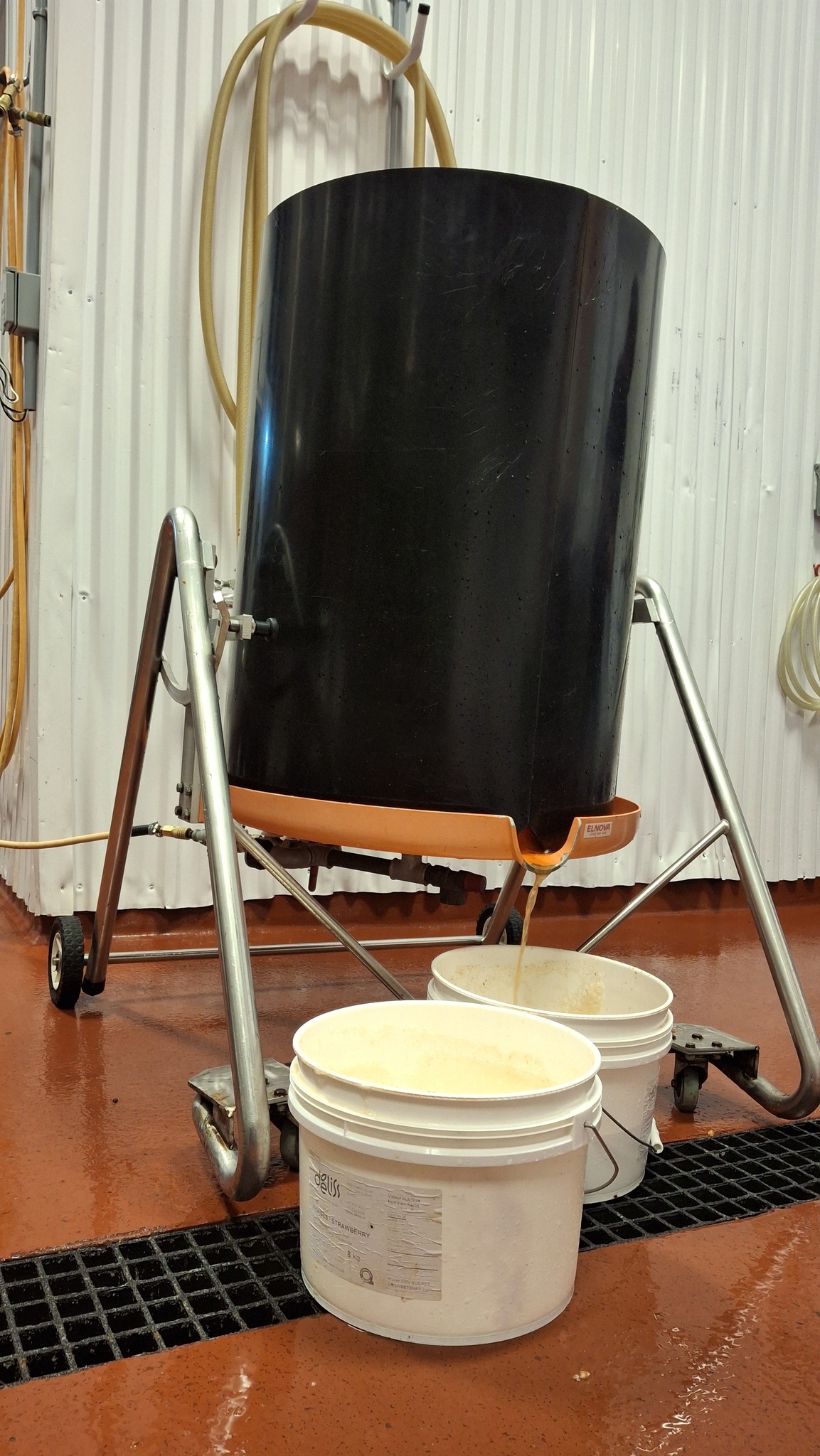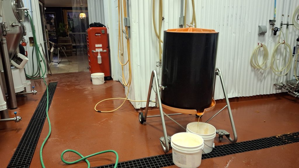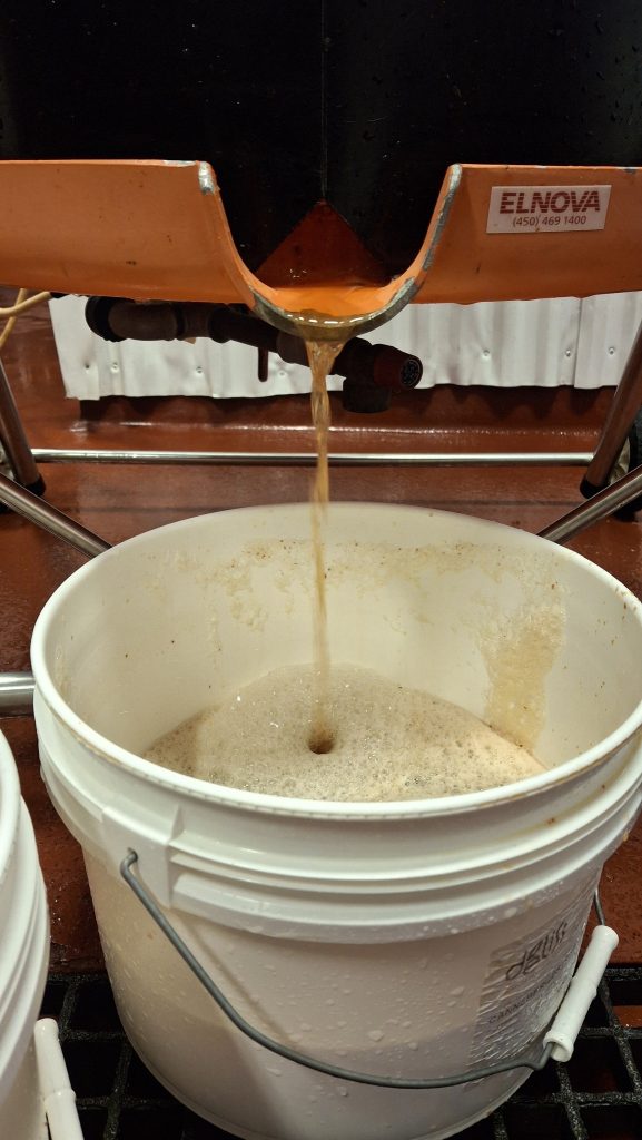 C’est à une échelle artisanale aussi, mais disons là semi-industrielle, à visée commerciale, qu’est utilisé le moût de pommes sauvages comme ingrédient pour créer des bières non-traditionnelles, chez Maltstrom, à Notre-Dame-des-Prairies, en banlieue de Joliette. Les opérations sont menées avec une presse hydraulique de plus grande contenance et autrement efficace, et un plus grand volume de pommes à presser. Pour presque remplir les 3 barriques de chêne prévues cette année, ce sont pas loin de 600 litres de jus frais et plein de potentiel à levures sauvages que nous y avons extrait, au bout de deux bonnes journées de travail en octobre et novembre.