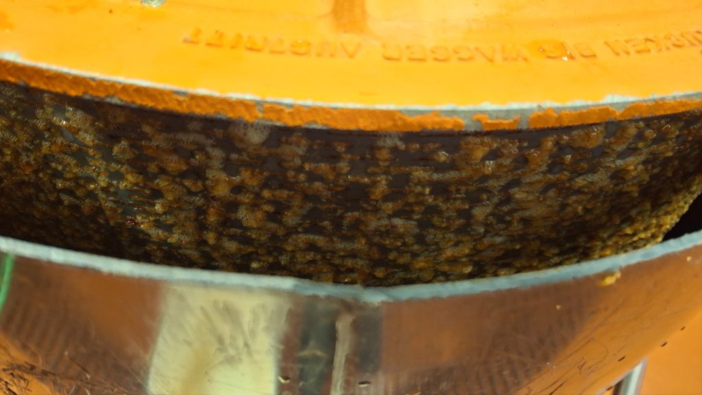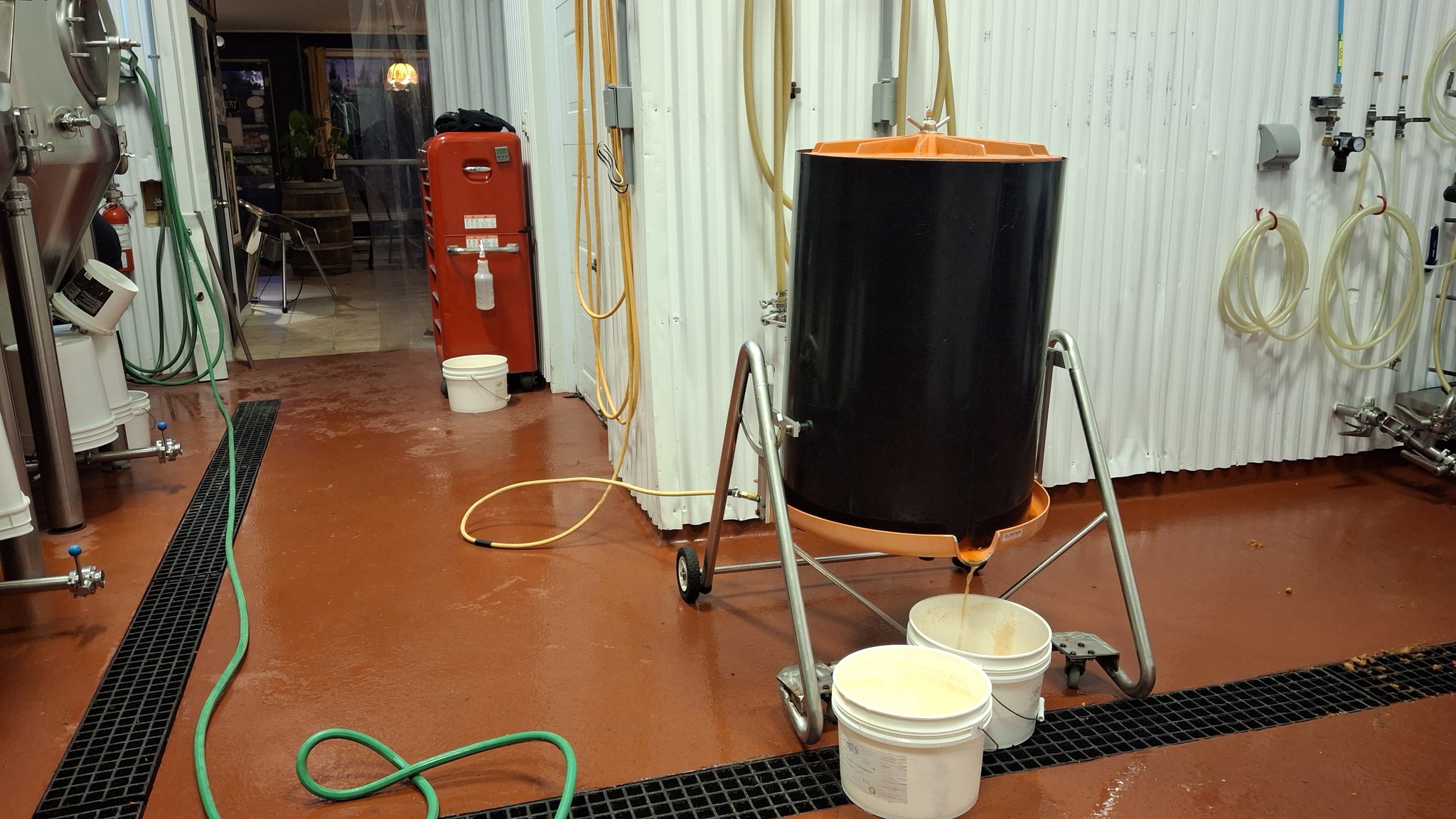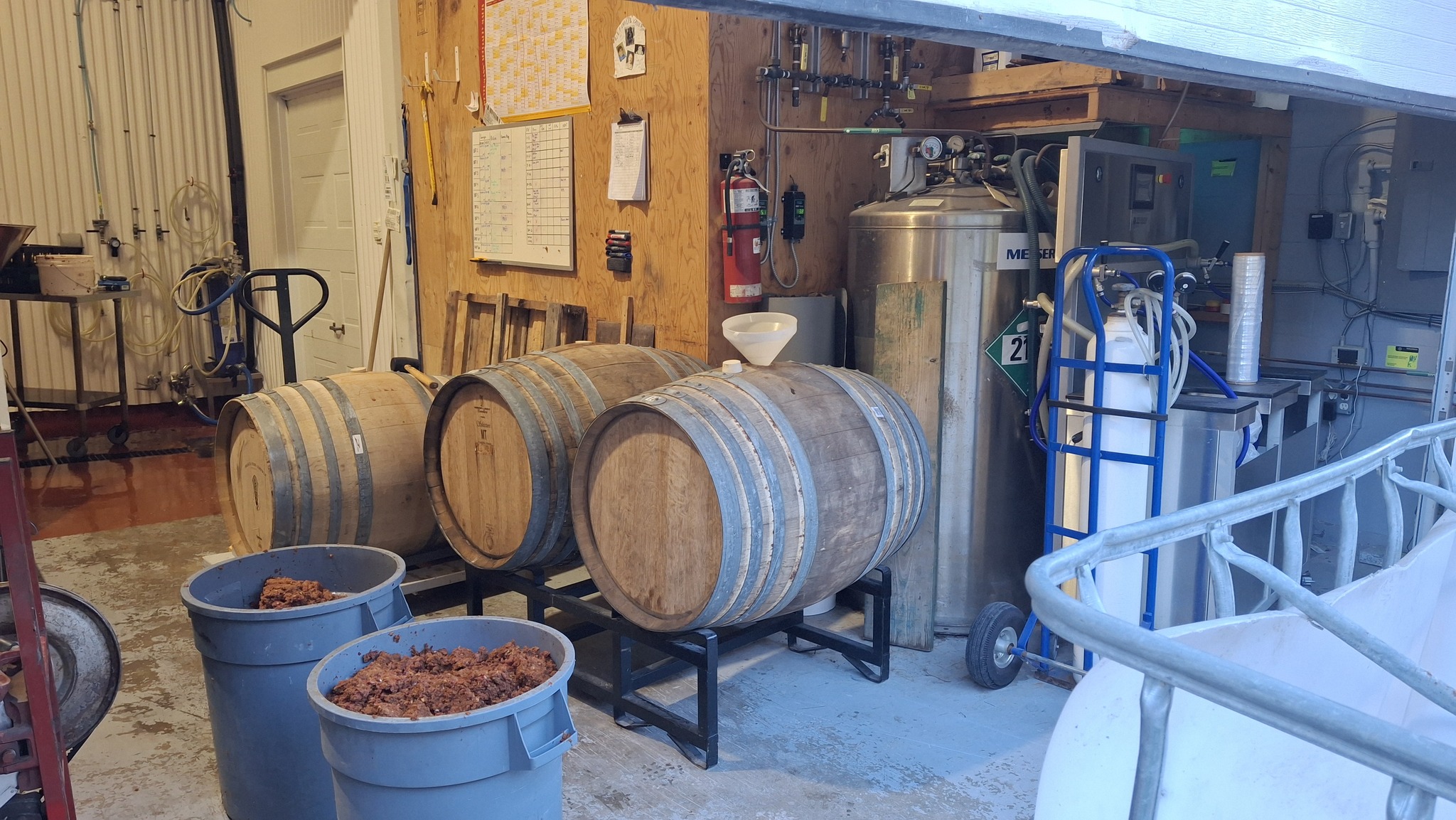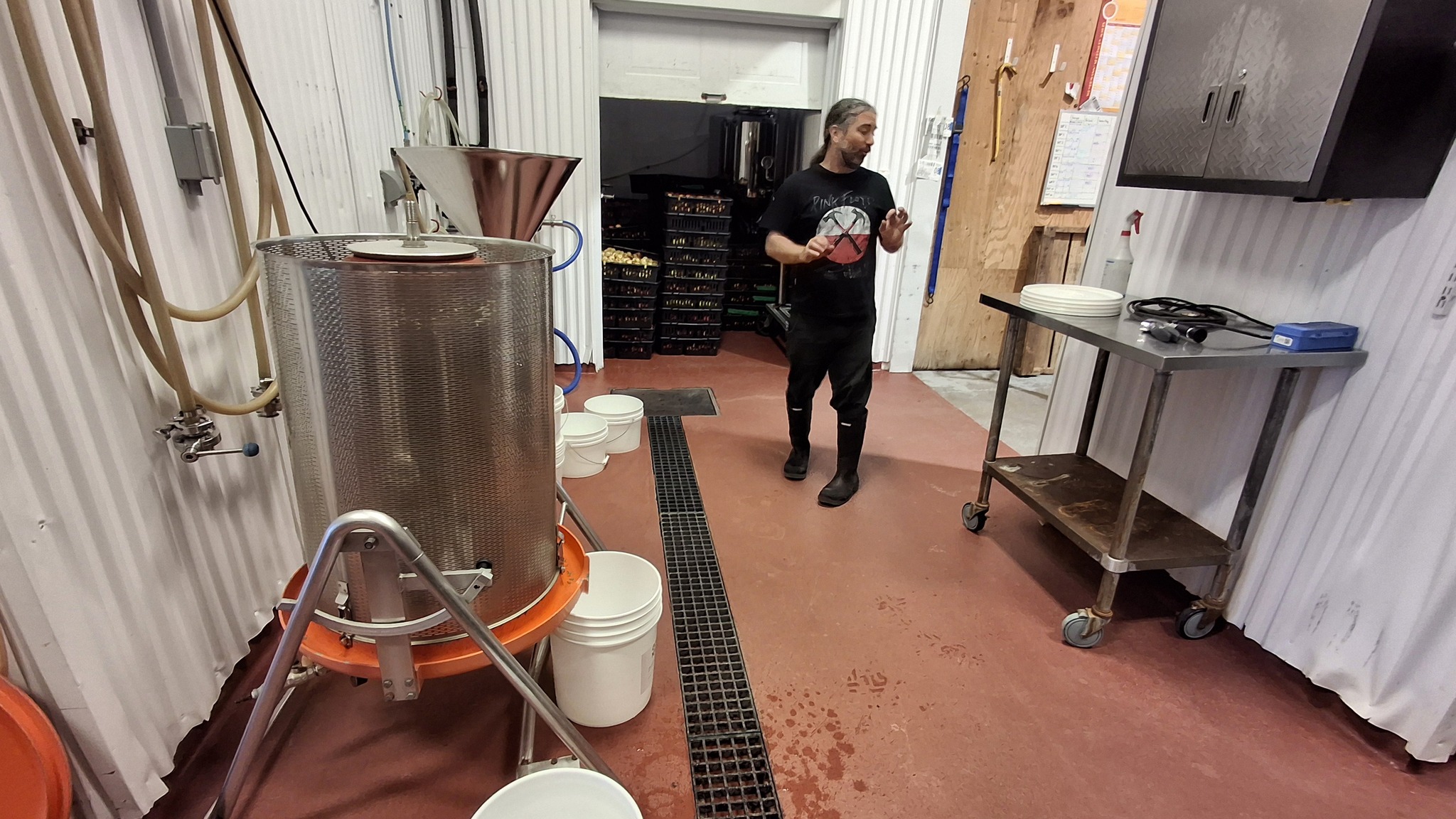 C’est à une échelle artisanale aussi, mais disons là semi-industrielle, à visée commerciale, qu’est utilisé le moût de pommes sauvages comme ingrédient pour créer des bières non-traditionnelles, chez Maltstrom, à Notre-Dame-des-Prairies, en banlieue de Joliette. Les opérations sont menées avec une presse hydraulique de plus grande contenance et autrement efficace, et un plus grand volume de pommes à presser. Pour presque remplir les 3 barriques de chêne prévues cette année, ce sont pas loin de 600 litres de jus frais et plein de potentiel à levures sauvages que nous y avons extrait, au bout de deux bonnes journées de travail en octobre et novembre.