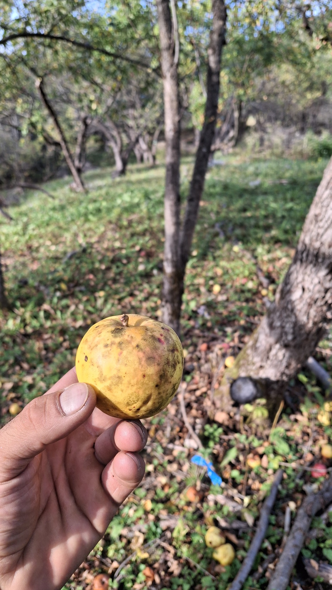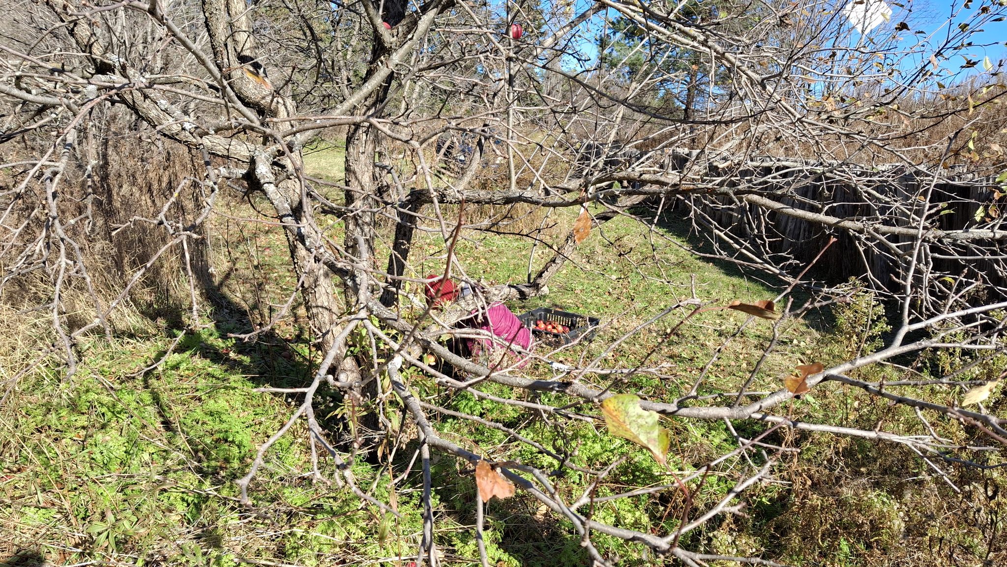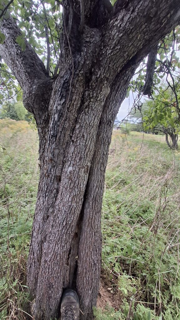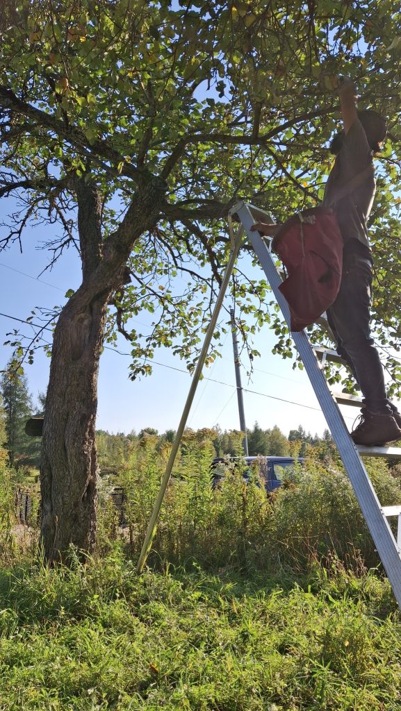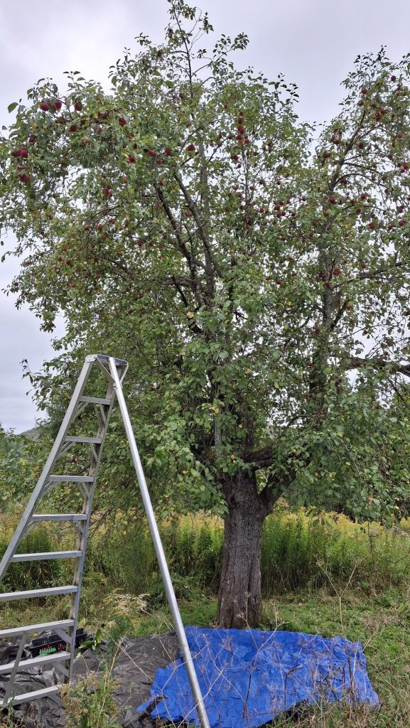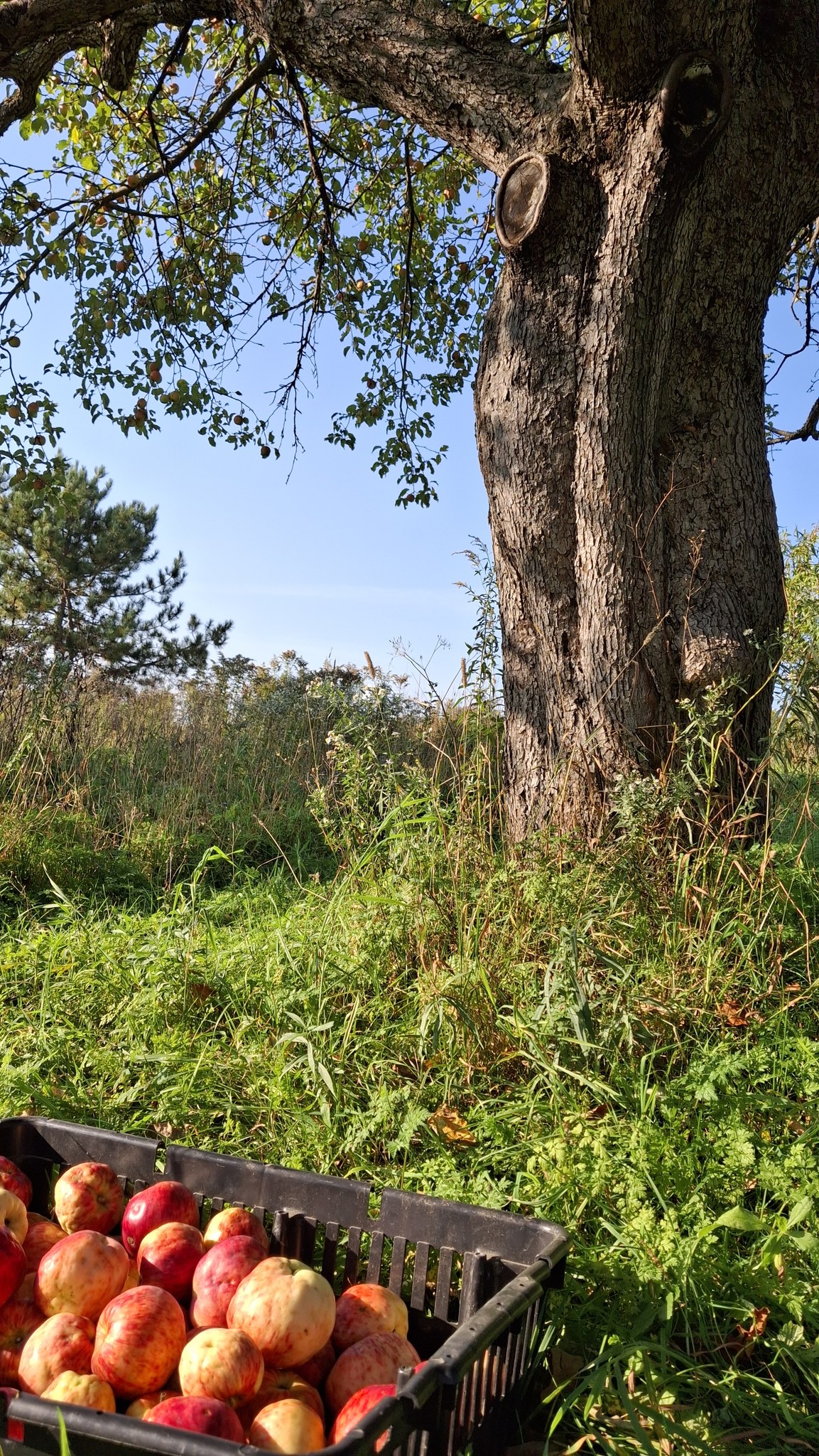 Deux dames vieillissantes m’en accordent les droits de cueillette, et le devoir de l’entretien.Un mix de techniques de récolte : une pomme à la fois, à la main, grimpé dans l’échelle, mais aussi du brassage et de la récolte au sol, sur des bâches autant que possible).Au pied de sa majesté fruitière, dont les fruits feront cidre. C’est du tronc de pommier vigoureux et âgé ça !