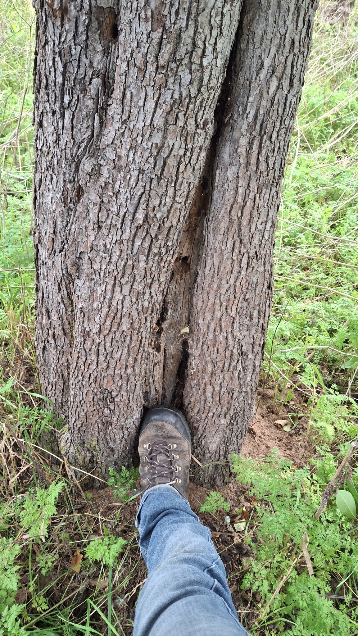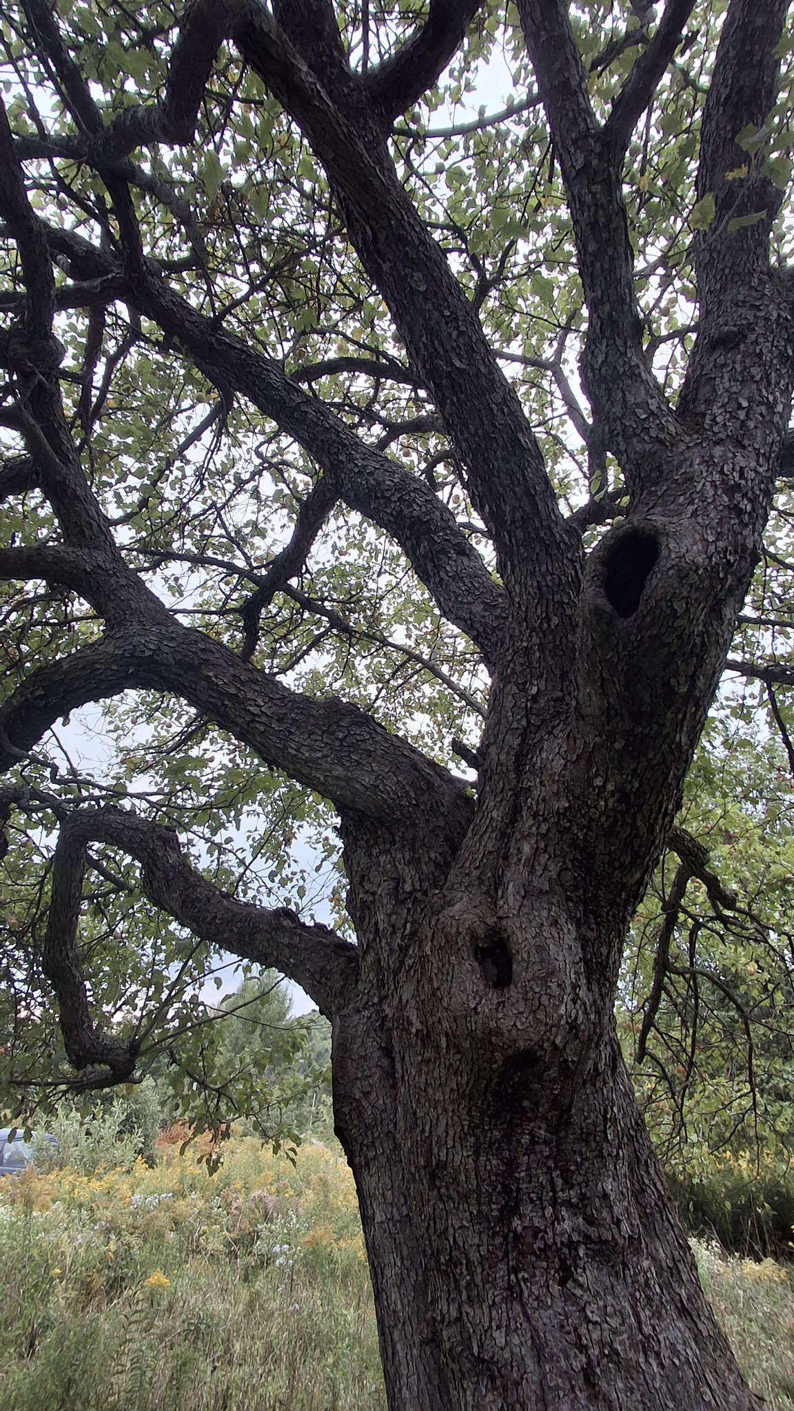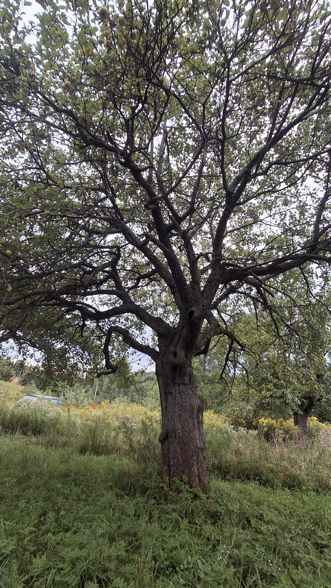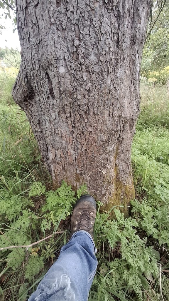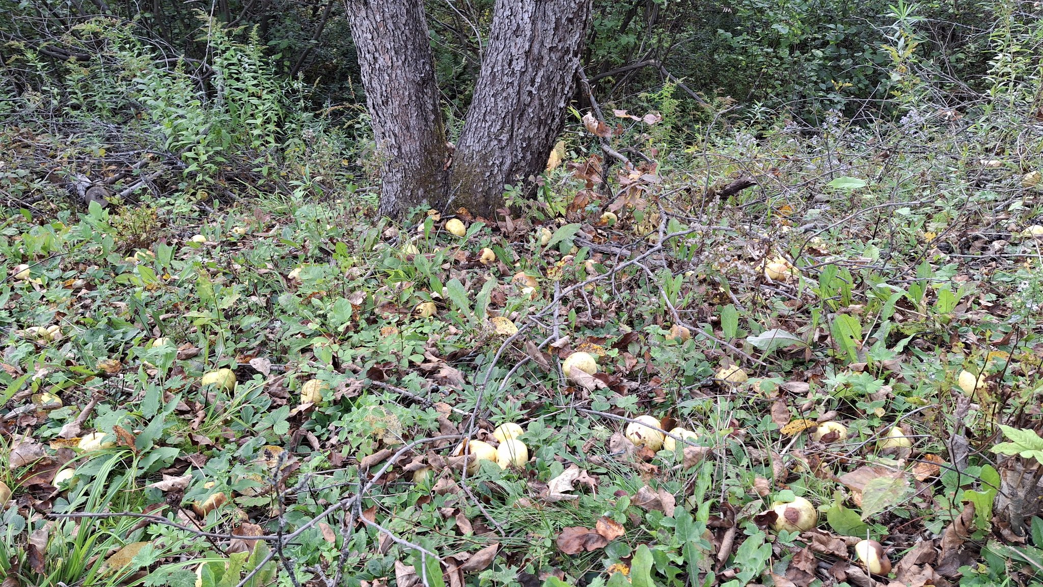 Deux dames vieillissantes m’en accordent les droits de cueillette, et le devoir de l’entretien.Un mix de techniques de récolte : une pomme à la fois, à la main, grimpé dans l’échelle, mais aussi du brassage et de la récolte au sol, sur des bâches autant que possible).Au pied de sa majesté fruitière, dont les fruits feront cidre. C’est du tronc de pommier vigoureux et âgé ça !