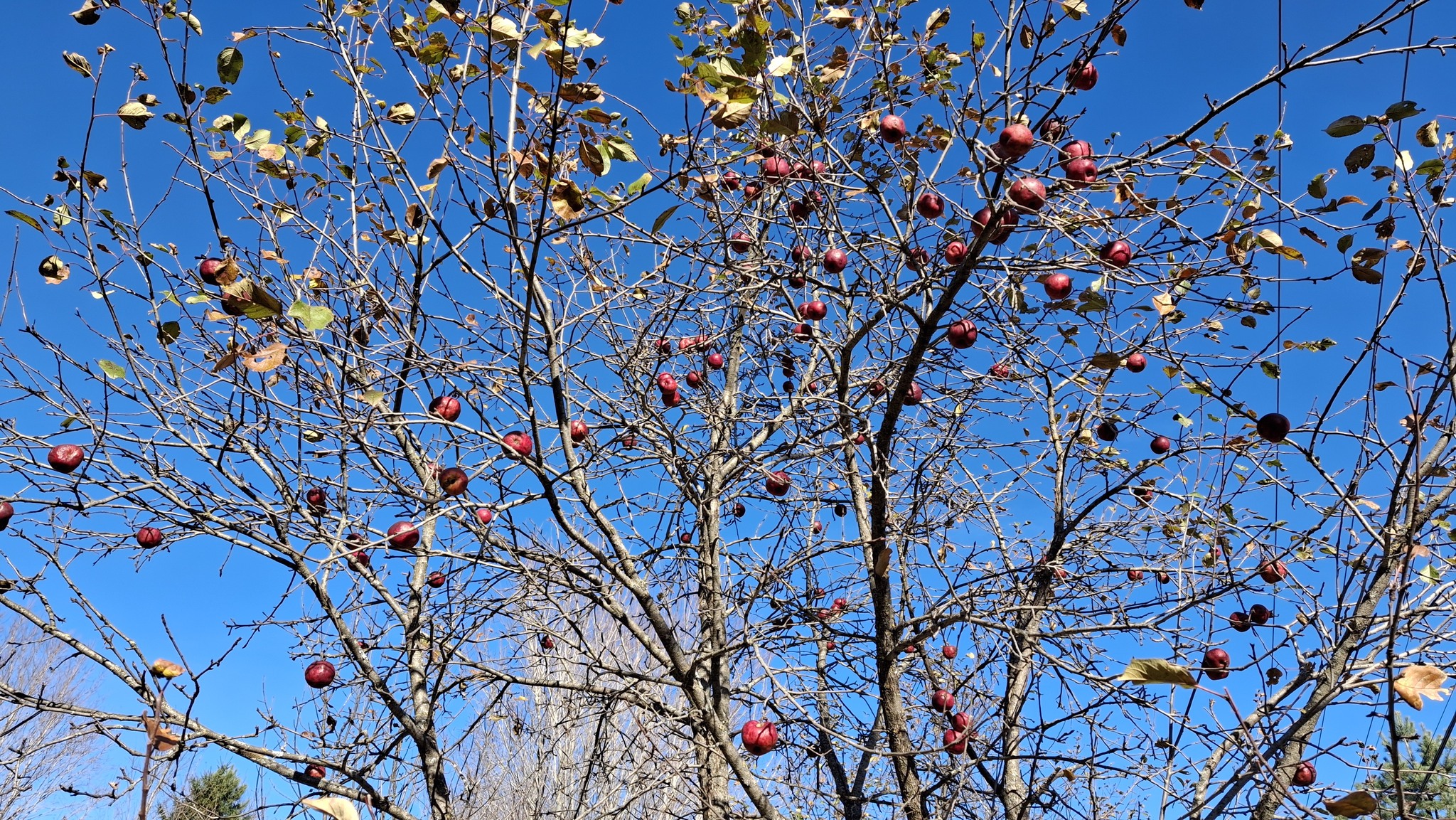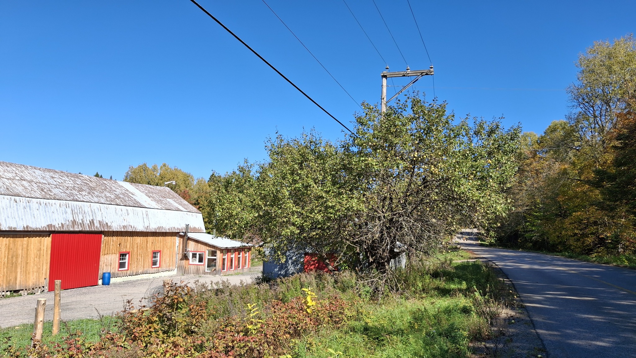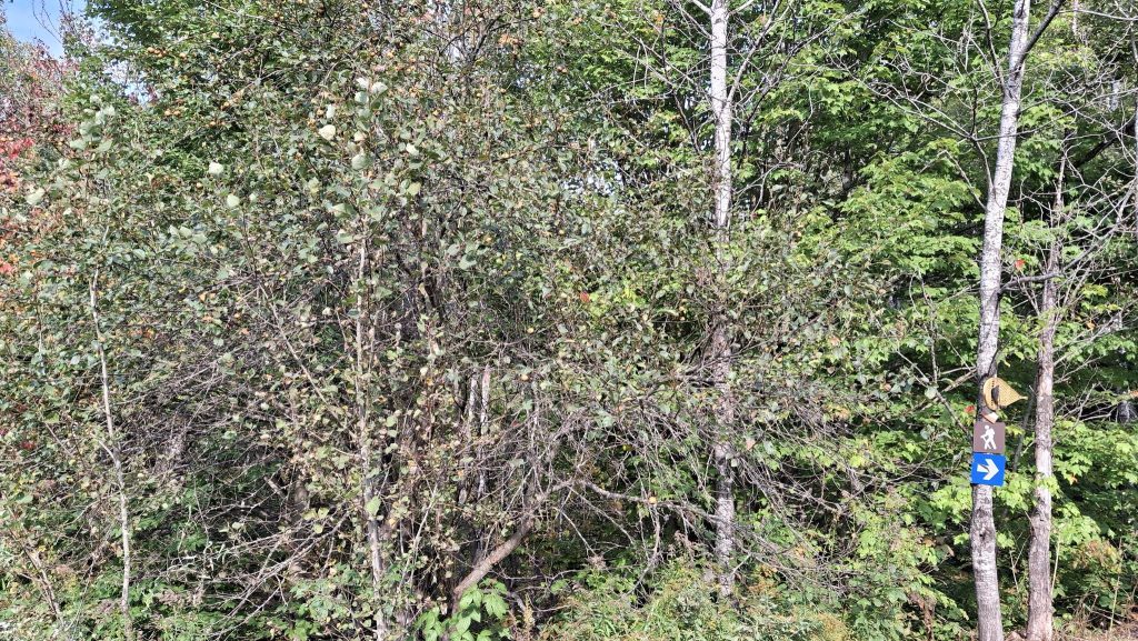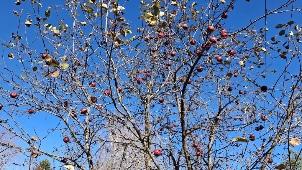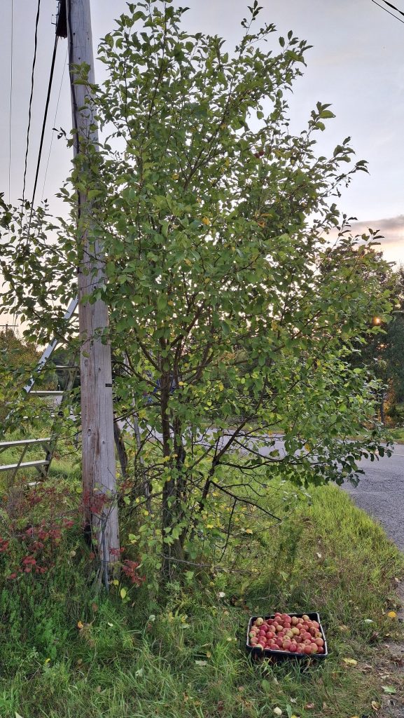 Des pommes à croquer, sucrées, juteuses, un brin acidulées, assez saines, et non traitées.De belles grappes orangées, des branches à brasser.Pommier ancien au tronc immense et tortueux, dont j’ai nommé les fruits ‘Béatrix’.Un sauvageon de bord de route, le long d’un vieux rang agricole à St-Jean-de-Matha. Rouge et bleu, cimes et ciel, fruits sauvages et gratuits.‘Sacré-Coeur de St-Guillaume’, son nom, contre son électrique poteau.Le grand et vénérable ‘Béatrix’, chargé de fruits cette année, entouré de quelques autres vieux pommiers bien garnis.L’affaire est dans le sac ! Chemin du Portage, St-Didace, les fruits d’une récolte de pommes sauvages hors du commun.