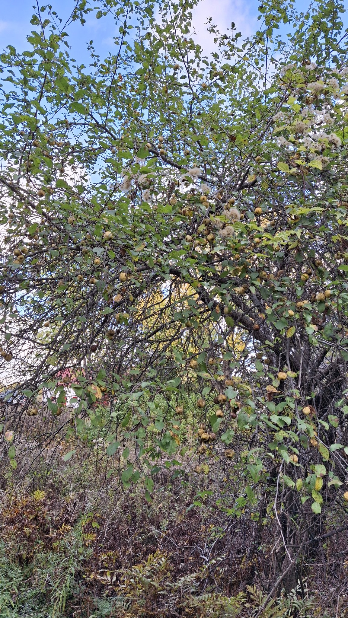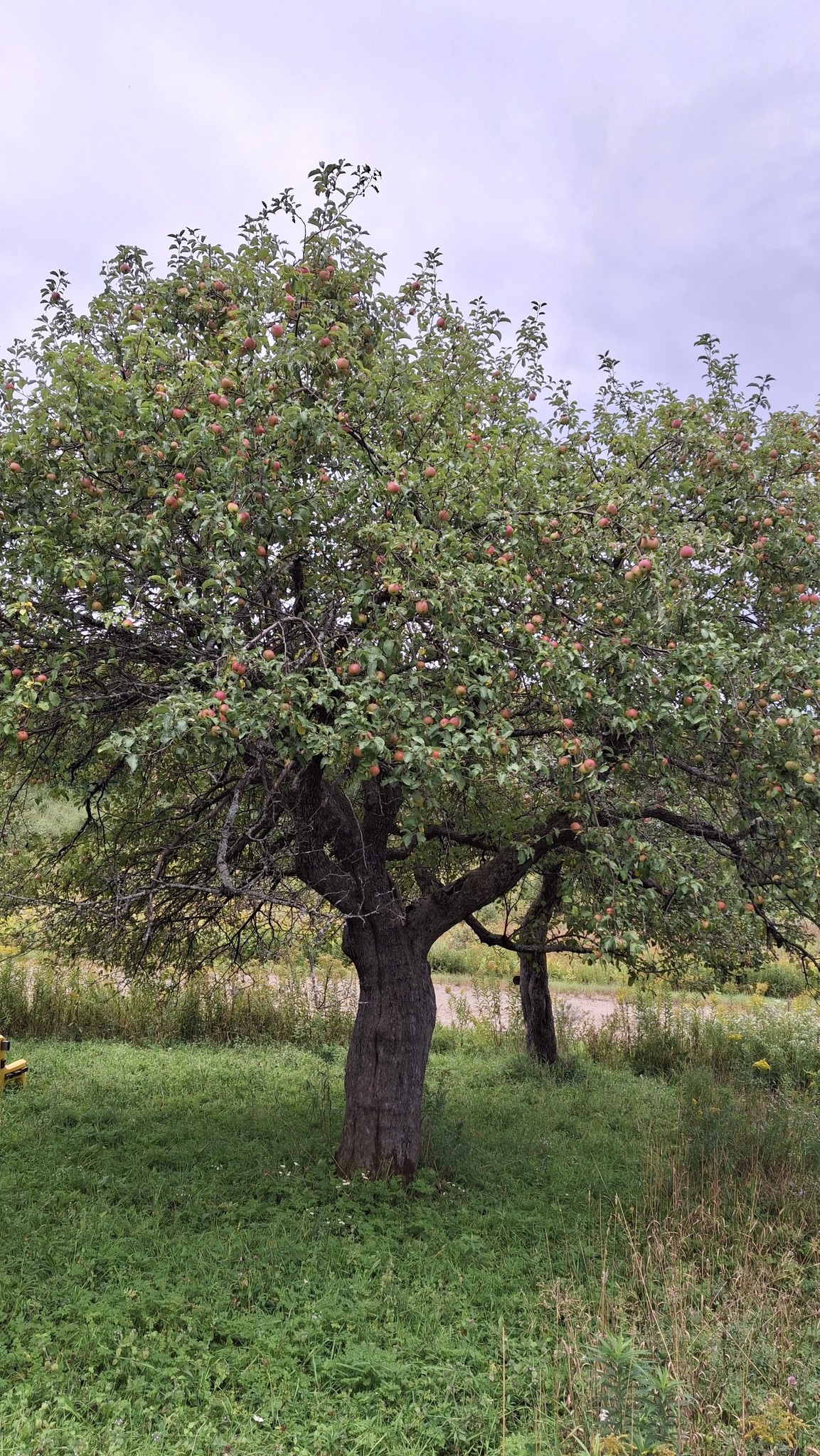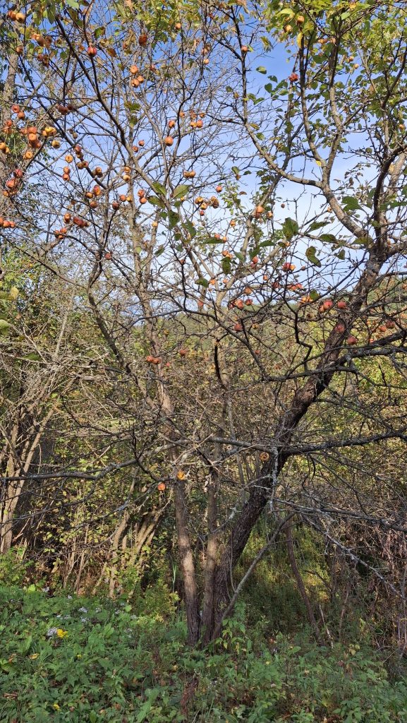 Des pommes à croquer, sucrées, juteuses, un brin acidulées, assez saines, et non traitées.De belles grappes orangées, des branches à brasser.Pommier ancien au tronc immense et tortueux, dont j’ai nommé les fruits ‘Béatrix’.Un sauvageon de bord de route, le long d’un vieux rang agricole à St-Jean-de-Matha. Rouge et bleu, cimes et ciel, fruits sauvages et gratuits.‘Sacré-Coeur de St-Guillaume’, son nom, contre son électrique poteau.Le grand et vénérable ‘Béatrix’, chargé de fruits cette année, entouré de quelques autres vieux pommiers bien garnis.L’affaire est dans le sac ! Chemin du Portage, St-Didace, les fruits d’une récolte de pommes sauvages hors du commun.