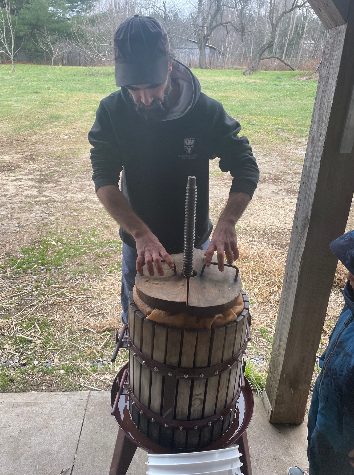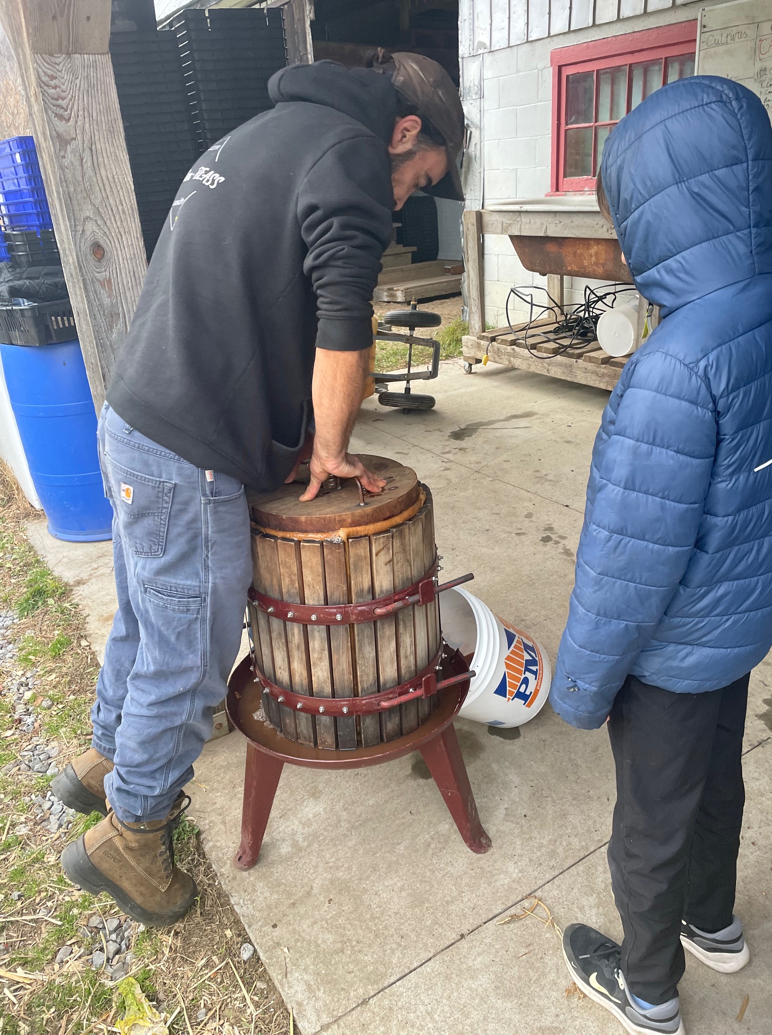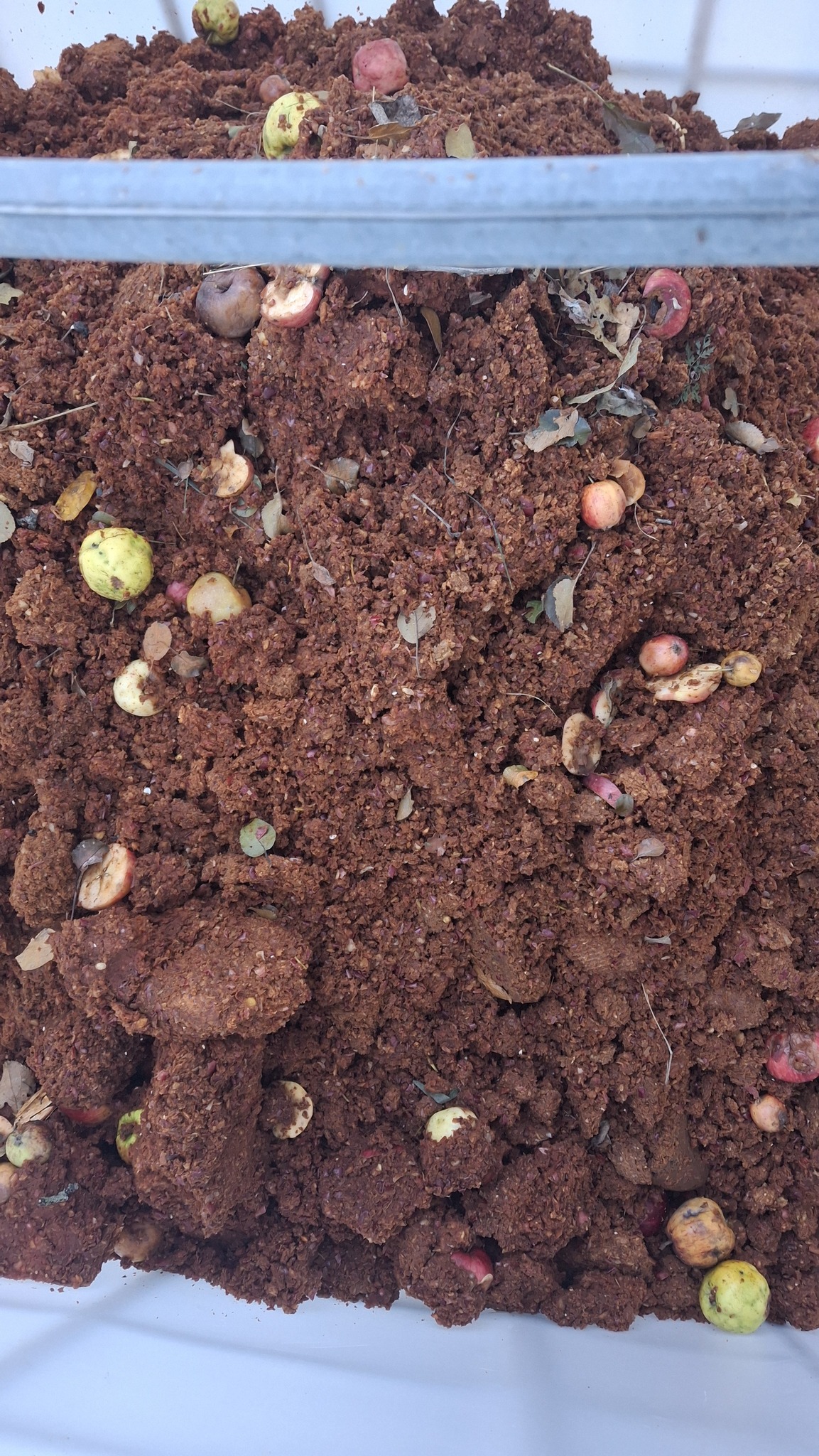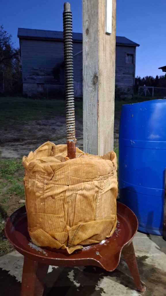 Toute la marmaille de neveu et nièce ainsi que d’amis de la famille, attentivement m’observe, tandis que j’achève la mise en place du dispositif.17 novembre 2024. Presse personnelle, devant l’étable, avec un public d’enfants curieux, et plus tard ravis du bon jus qui leur fut servi.Les blocs de bois sont installés au-dessus du couvercle, tout comme le mécanisme à cliquet.Le pain de marc de pommes, restant à sortir de son pieu et de son sac, à déverser dans un baril bleuMon installation sous l’appentis de l’étable, à Sainte-Mélanie, le 19 octobre 2024.La table aux outils, cahier de notes, et petits contenants de jusMarc ou pommace, ce sont les déchets de l’activité du pressoir.
