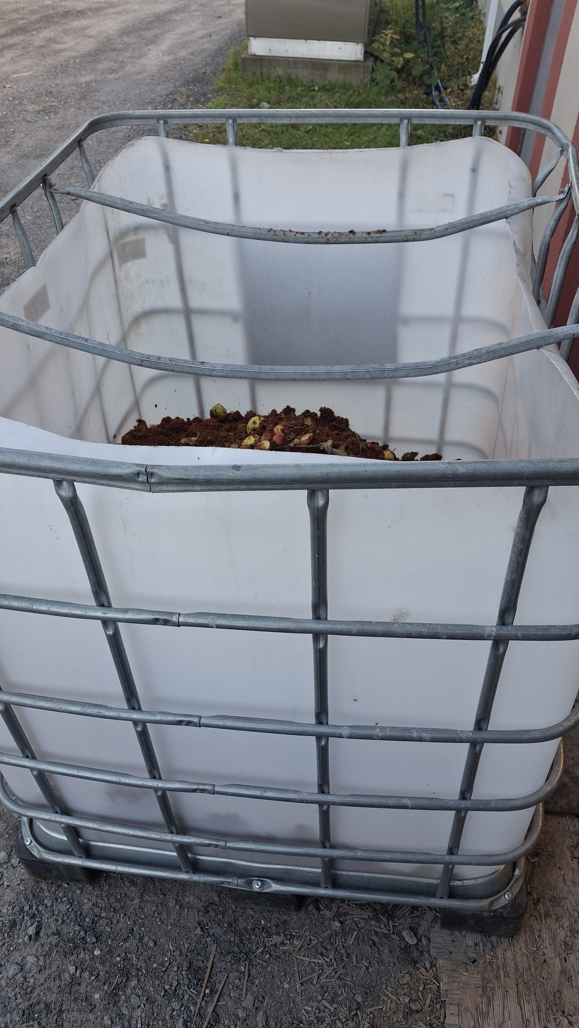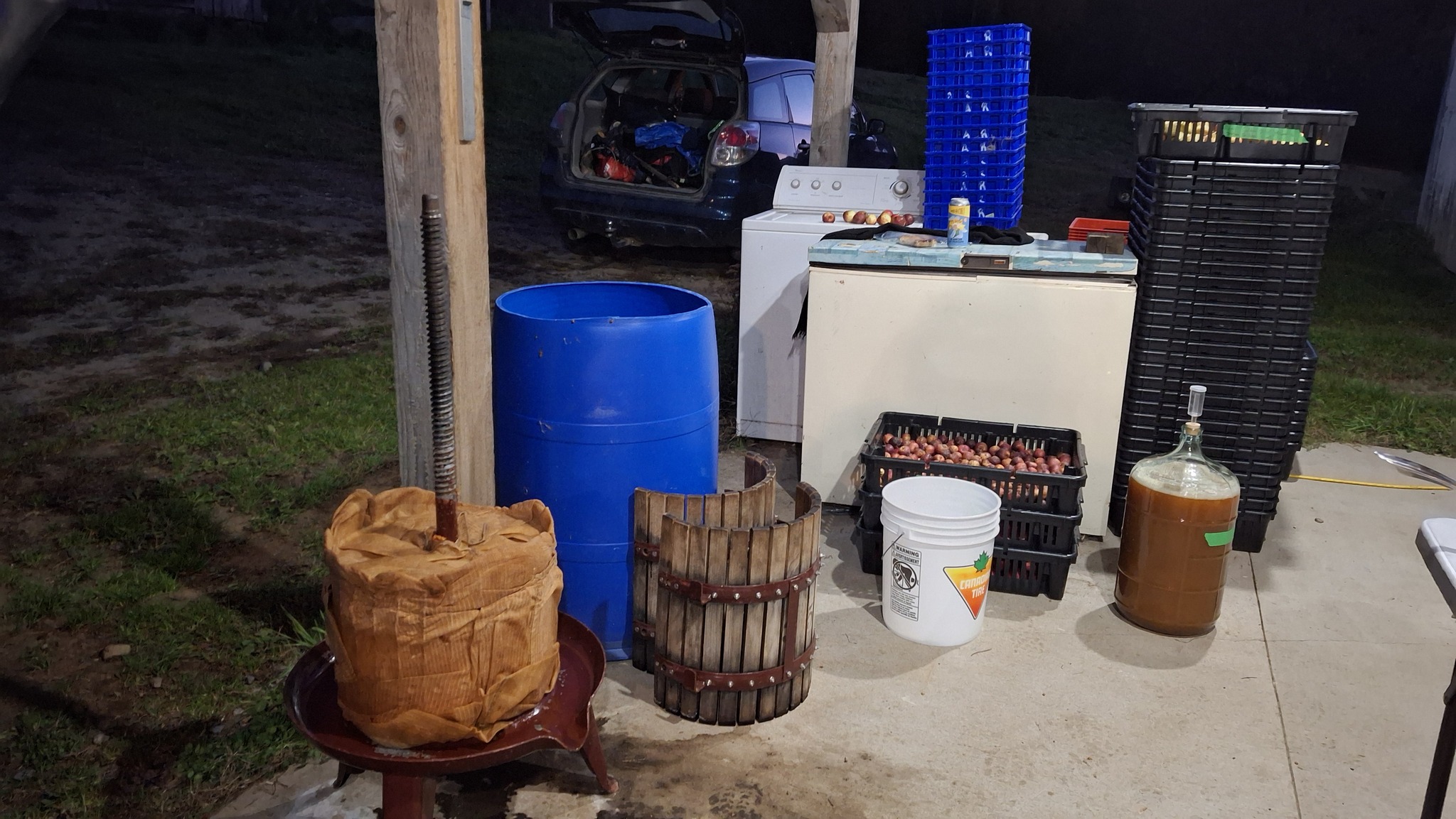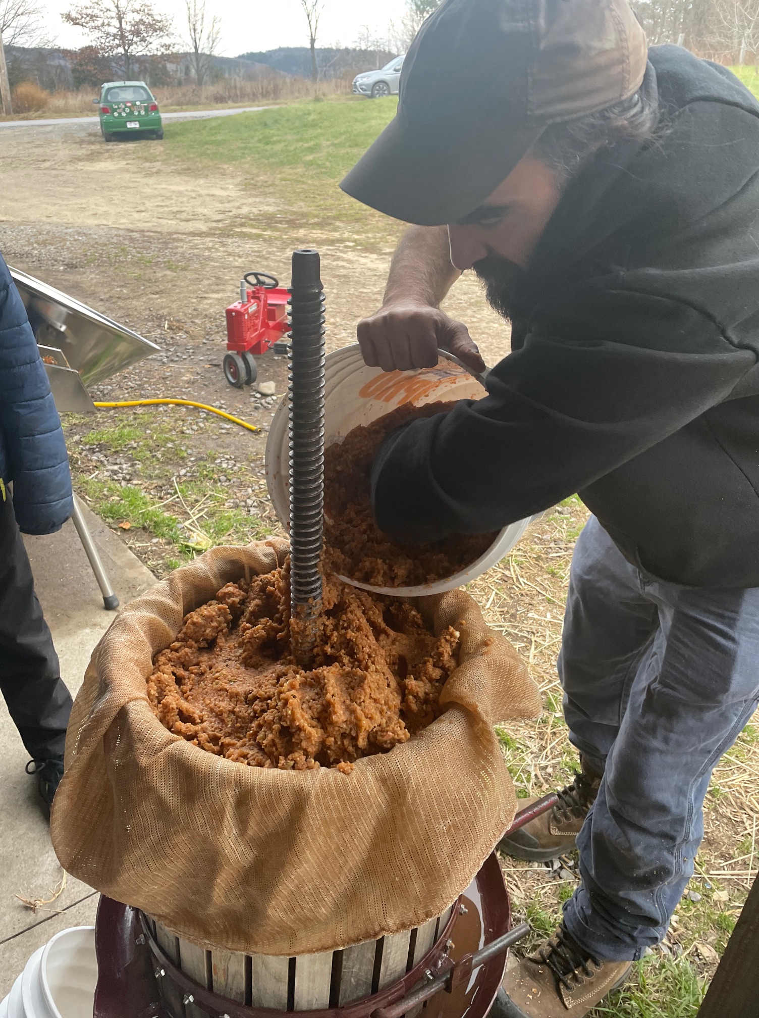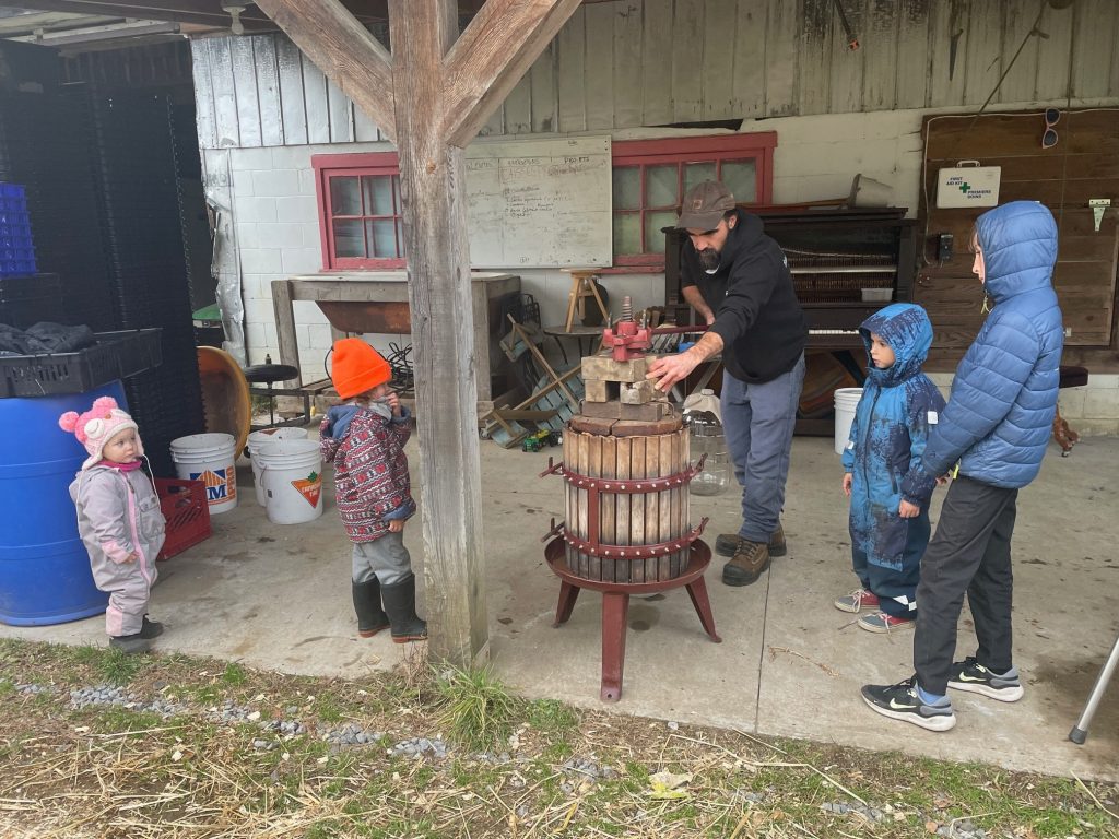 Toute la marmaille de neveu et nièce ainsi que d’amis de la famille, attentivement m’observe, tandis que j’achève la mise en place du dispositif.17 novembre 2024. Presse personnelle, devant l’étable, avec un public d’enfants curieux, et plus tard ravis du bon jus qui leur fut servi.Les blocs de bois sont installés au-dessus du couvercle, tout comme le mécanisme à cliquet.Le pain de marc de pommes, restant à sortir de son pieu et de son sac, à déverser dans un baril bleuMon installation sous l’appentis de l’étable, à Sainte-Mélanie, le 19 octobre 2024.La table aux outils, cahier de notes, et petits contenants de jusMarc ou pommace, ce sont les déchets de l’activité du pressoir.
