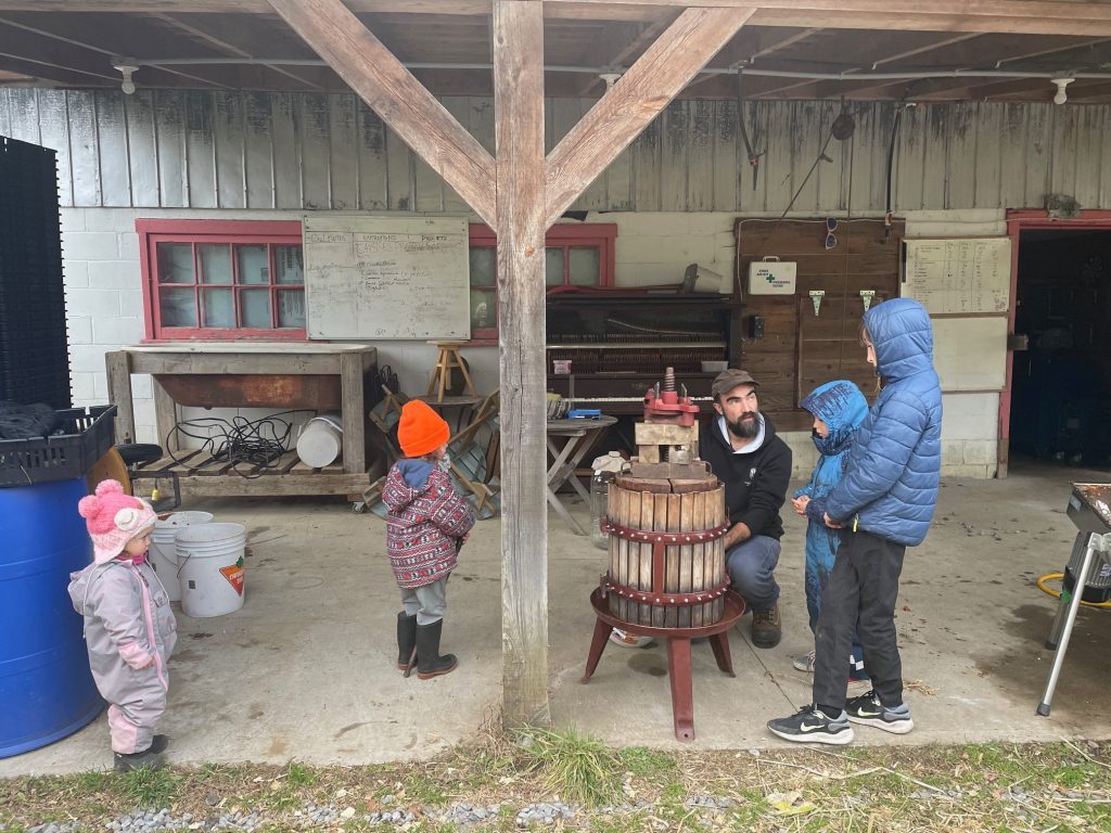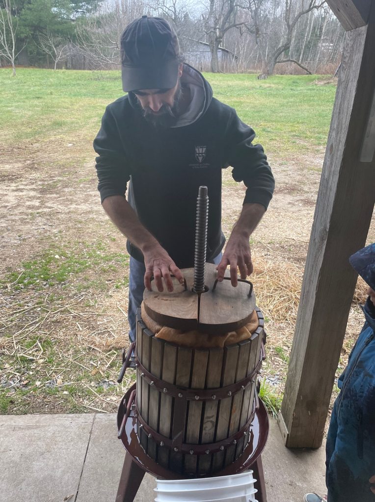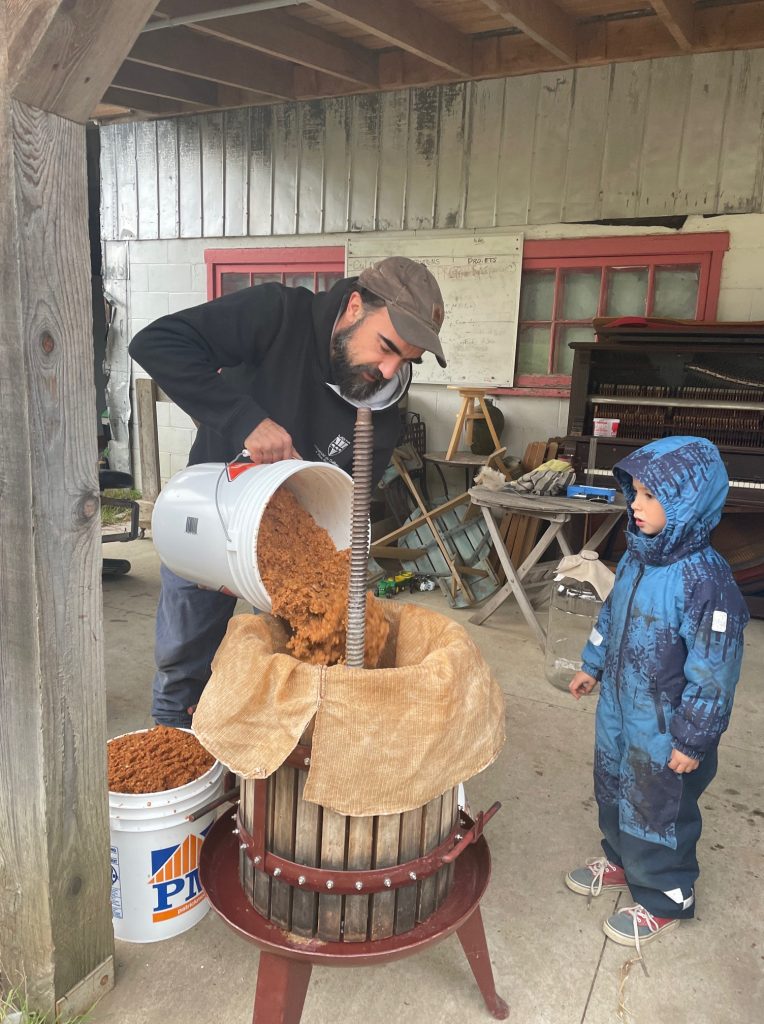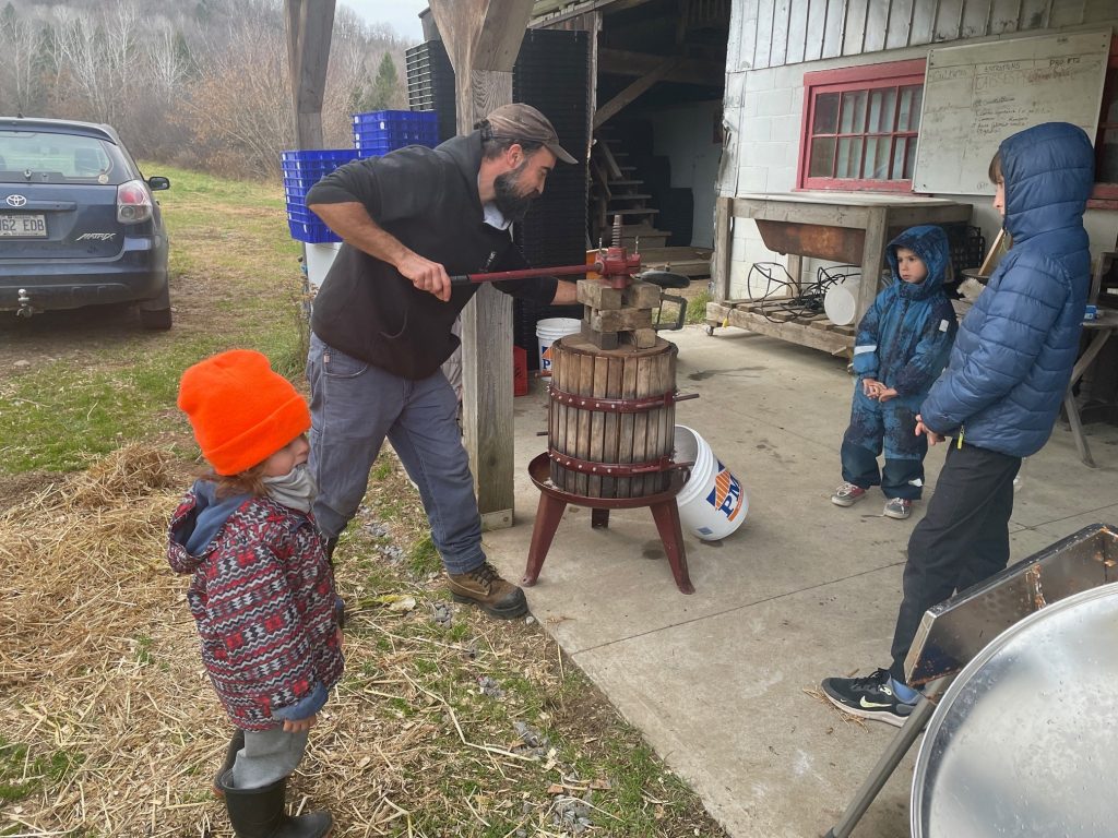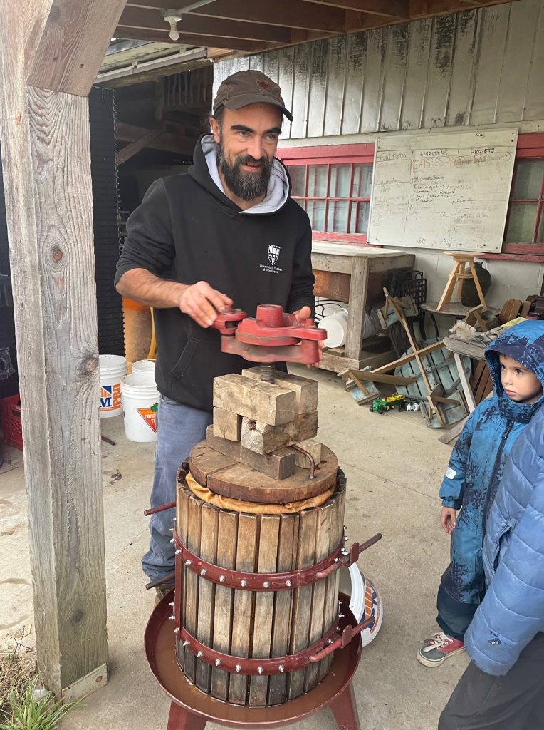 À l’échelle domestique, dans la petite presse manuelle qui est mienne, installé sous l’appentis de mon frère, devant l’étable, à Ste-Mélanie. En 2024, ce furent deux longs et agréables après-midi, pour en sortir quelques 80 litres pour moi cette année, en 6 cuvées distinctes, dont quelques-unes mono variétales, destinées à devenir cidre ou même poiré dans un cas.