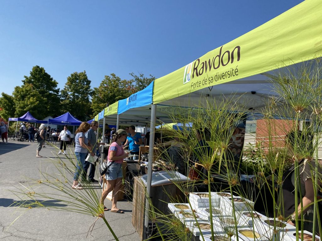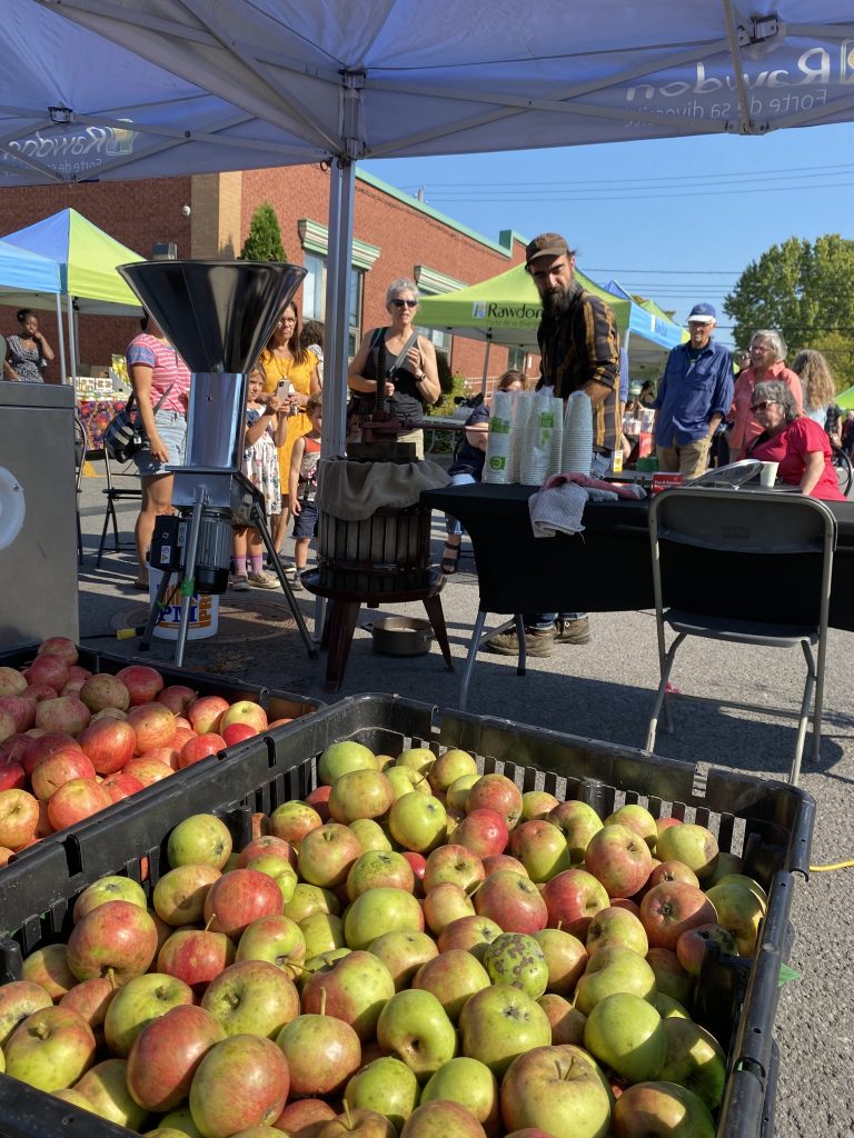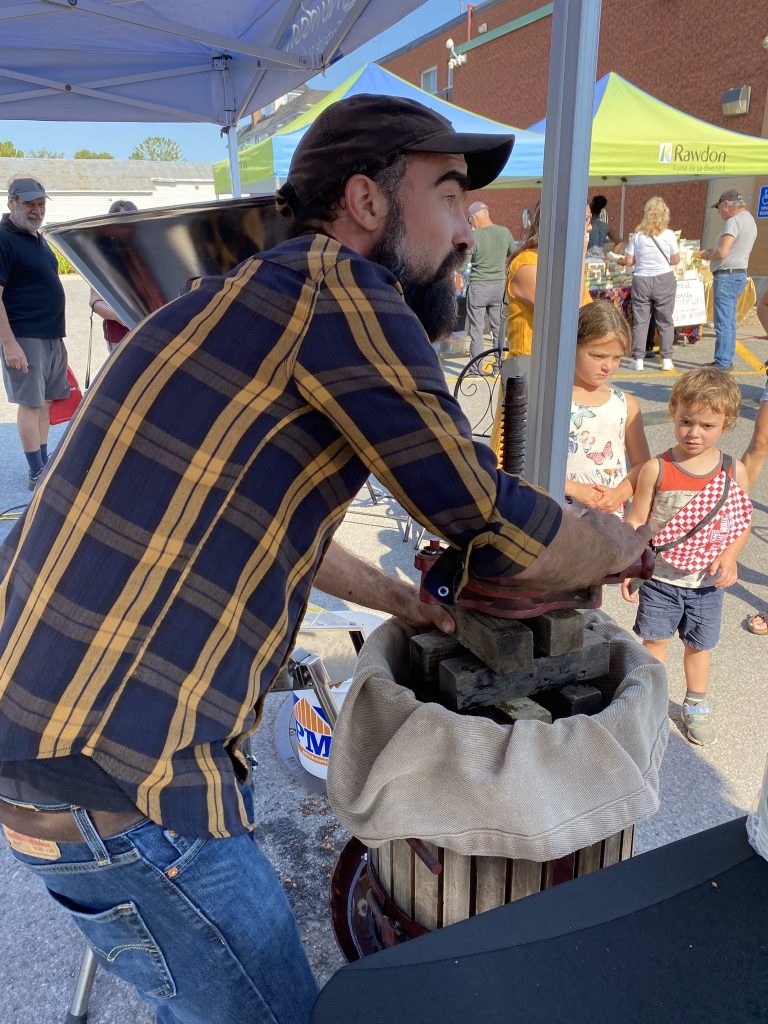 Pour commencer la saison, à la mi-septembre, j’ai eu la chance d’être engagé par la ville de Rawdon pour y réaliser une démonstration de presse de pommes en public. Installé au bout de l’allée centrale du Marché public, avec broyeur, pressoir, plusieurs caisses remplies de pommes du terroir régional, j’ai animé la clientèle en leur racontant ma quête de pommes locales et gratuites de qualité (sucrées, aromatiques), tout en pressant du jus frais sous leurs yeux. J’ai servi à toutes personnes présentes et volontaires, convaincu et convainquant, des verres de ce jus, pur produit de mon travail et de la nature à l’oeuvre derrière les pommiers, soient-ils sauvages ou cultivés. Quel bonheur qu’il soit unanimement salué, savouré, apprécié, source de compliments ! Quelques dizaines de litres sont sortis de ma presse ce jour-là.
