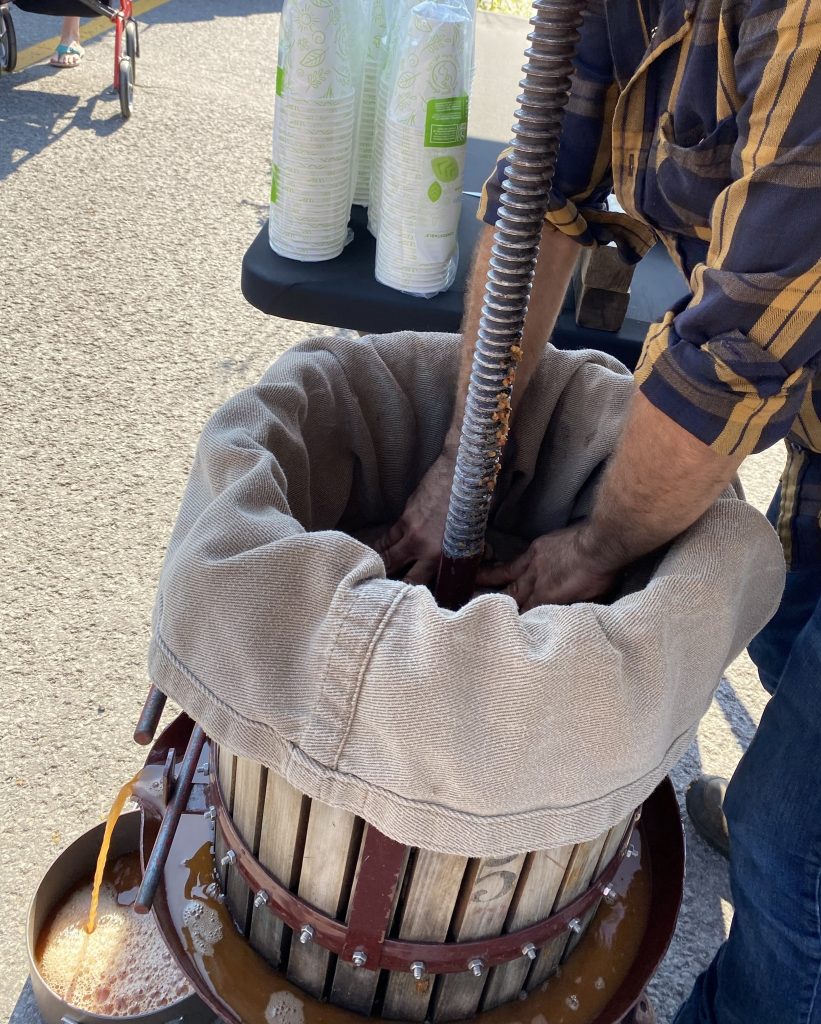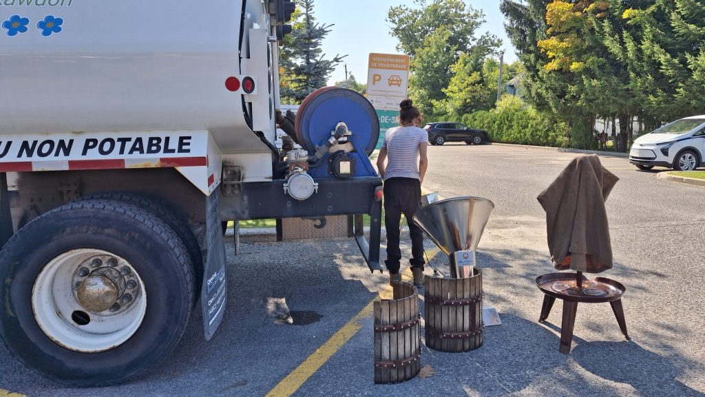Le meilleur jus que certain.es avaient jamais goûté de leur vie, ai-je entendu !Kiosques d’artisans agroalimentaires de la régionAllée centrale du Marché Public La Récolte de Rawdon, le 14 septembre 2024Nettoyage des équipements de broyage et de presse de pommes salis durant la journée, grâce à l’employée et au camion d’arrosage municipal de Rawdon.On appuie doucement, mais fermement, sur le couvercle, afin de le placer de niveau.On referme le sac de toile, et on pose les deux sections du couvercle. Deux demi-sphères en bois, avec leur poignées. Une fois réunies, un espace circulaire central demeure, afin de dégager l’espace pour la vis sans fin centrale de la presse.C’est parti mon cliquetis !Répondant aux questions des petits gars.