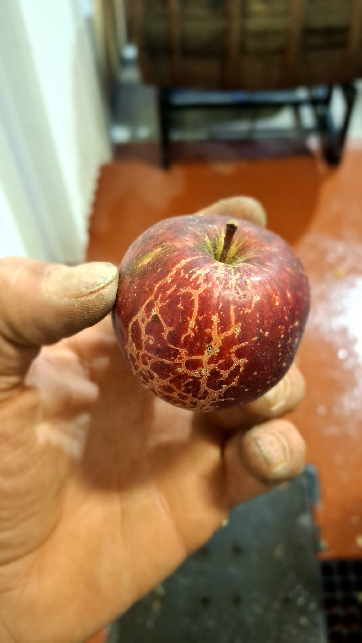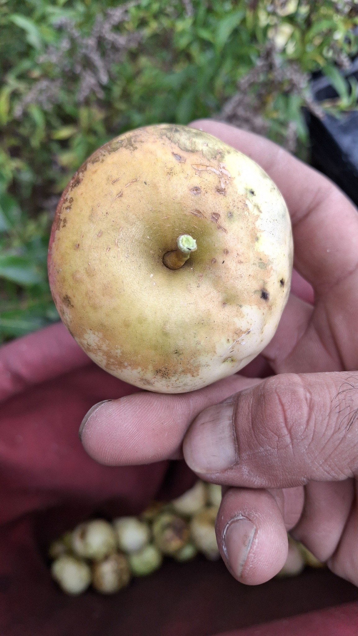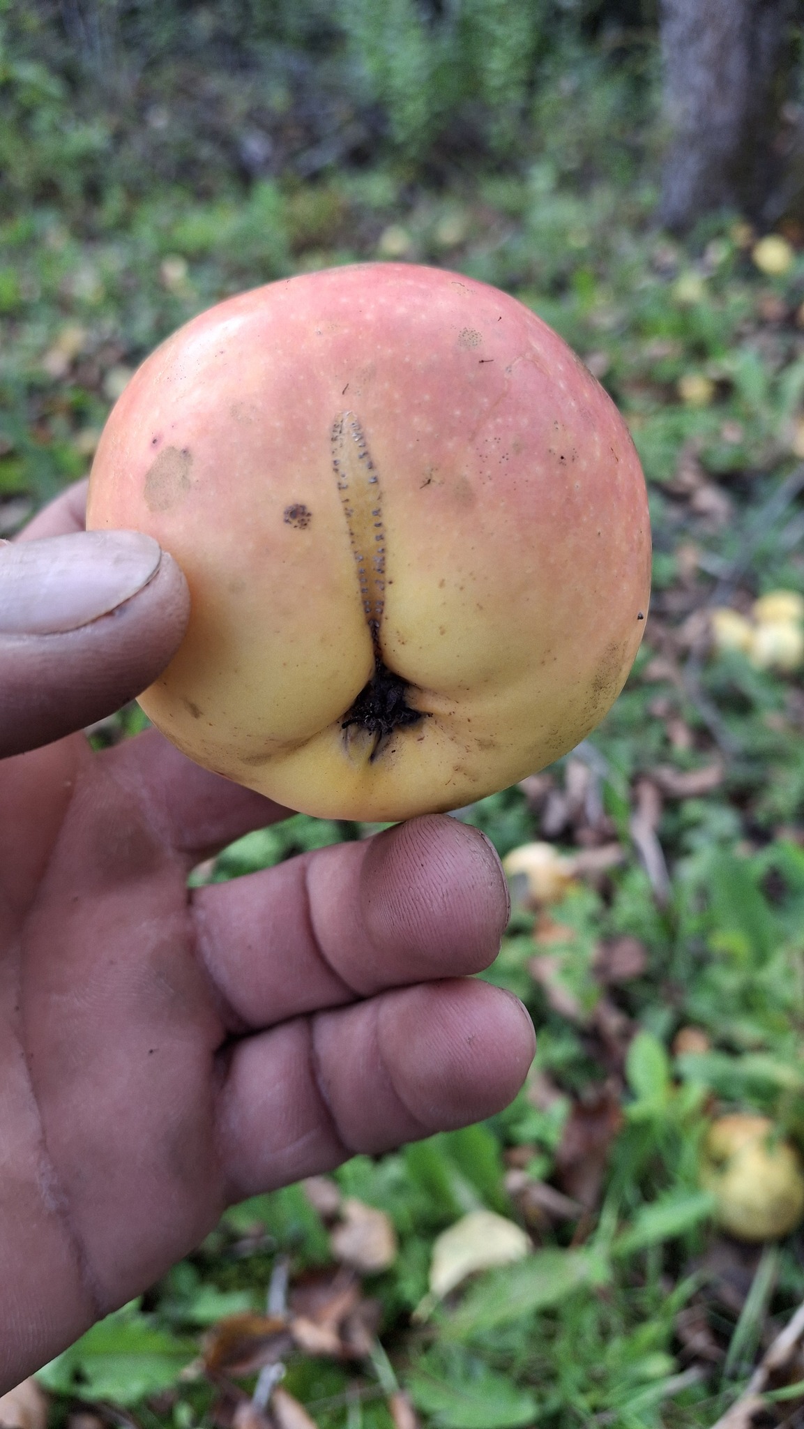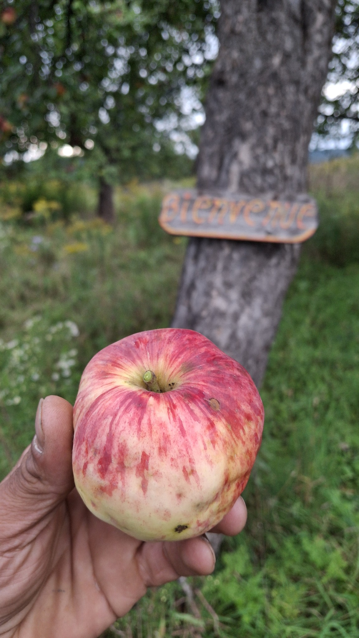 La pomme ‘Béatrix’ devant son arbre-mère.Pomme de St-Cléophas : un splash doré à la base, tout le tour de la cavité.