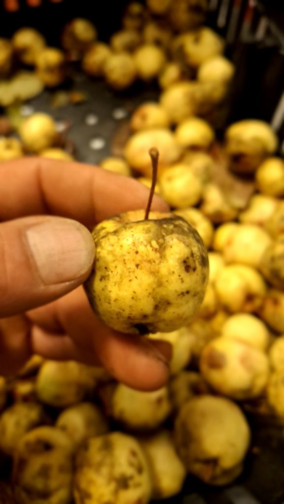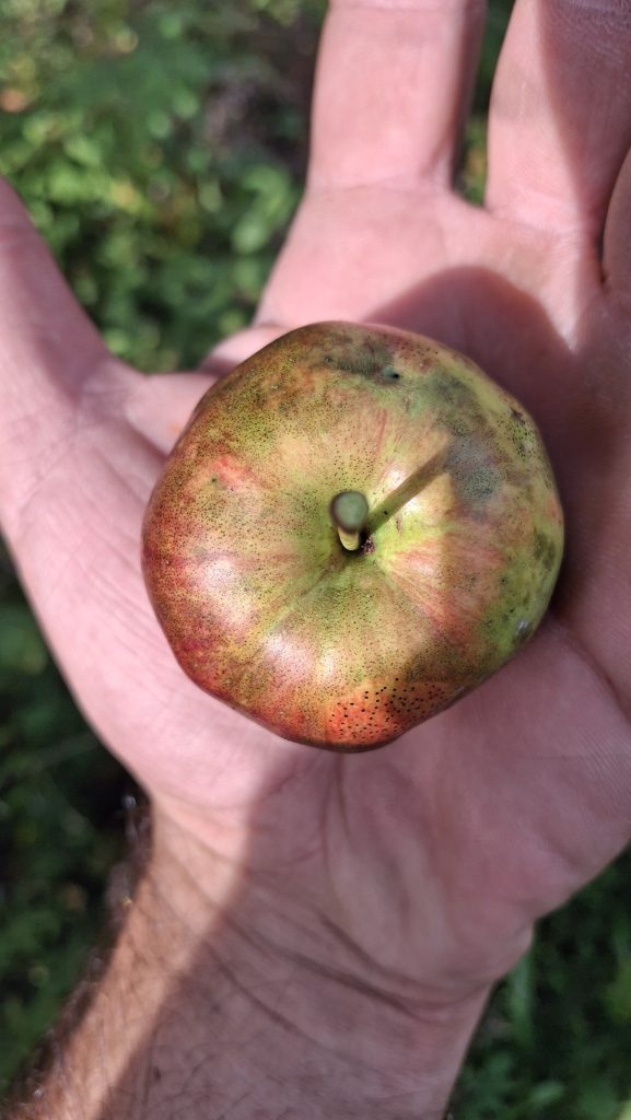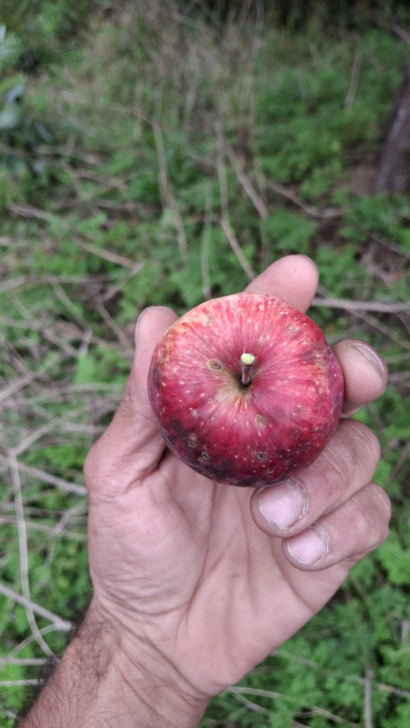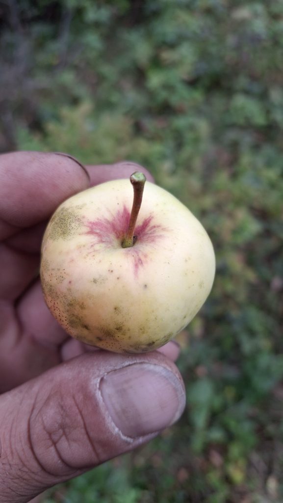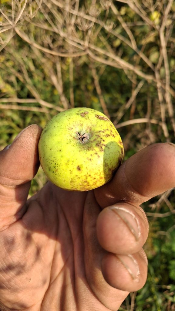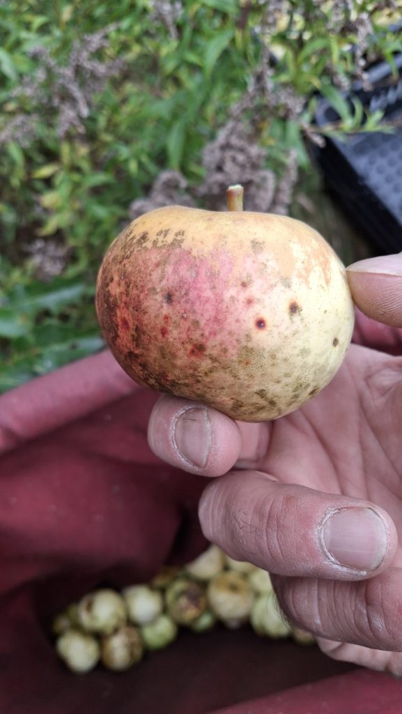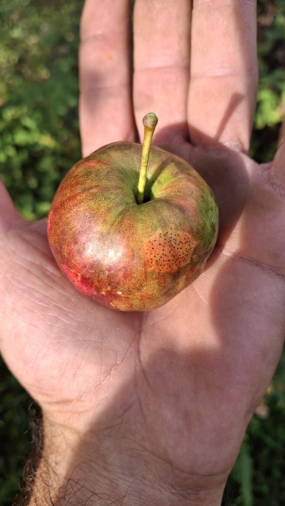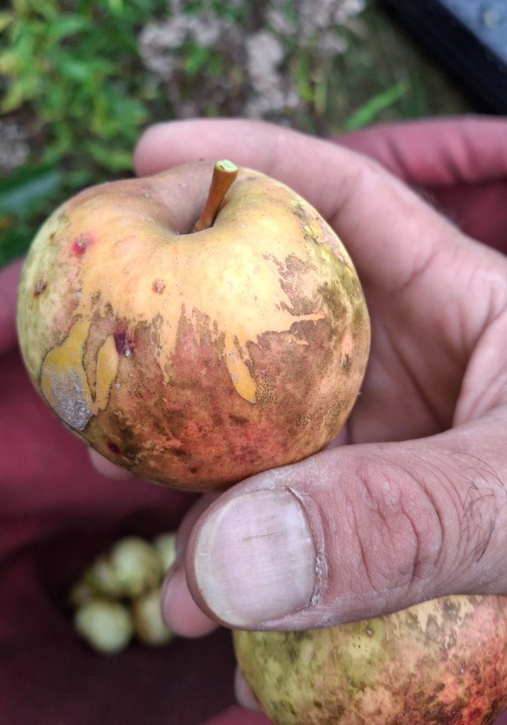 Les activités que je mène en lien avec les pommiers de la région me sont sources de rencontres (et de joies), bien plus encore que de revenus. Chaque année il y a des surprises, de nouvelles personnes qui se trouvent sur le chemin, qui m’en apprennent, m’accueillent, m’ouvrent leurs portes et leurs pommiers, petits vergers ou parcelles en friches où ont proliféré les sauvageons de l’espèce Malus. Des pommes aussi toujours que je rencontre pour la première fois, et pour lesquelles j’ai un coup de cœur.