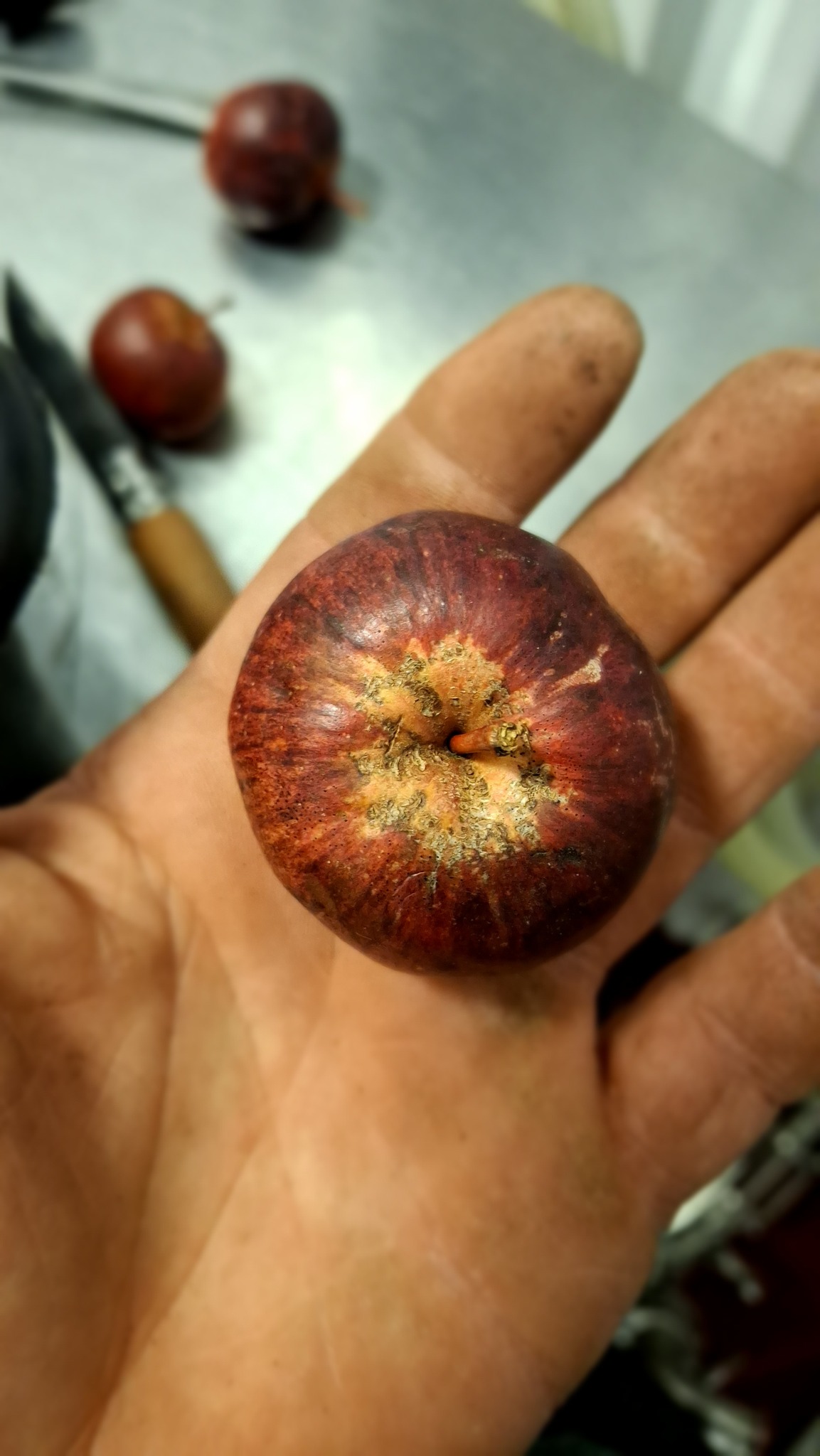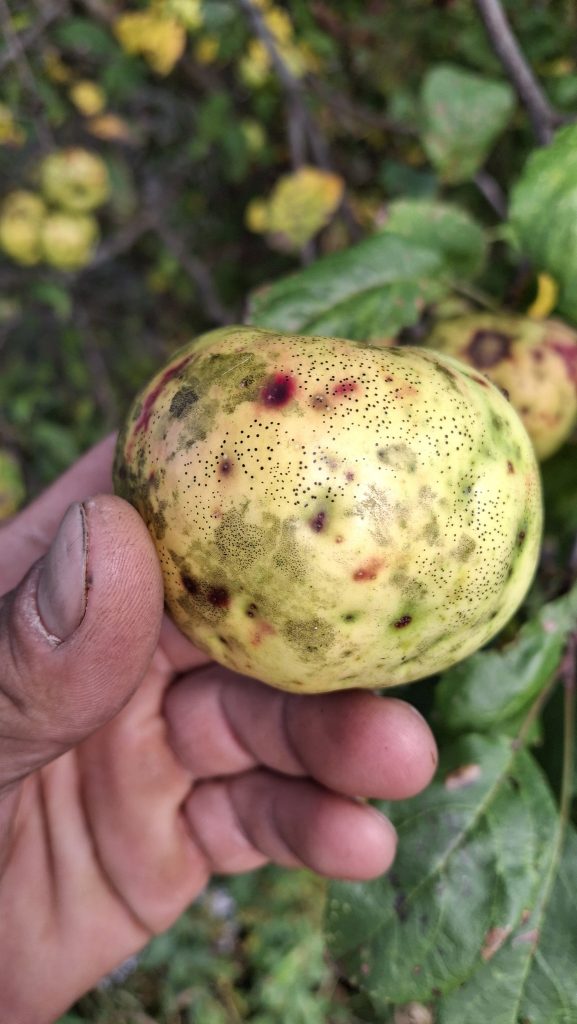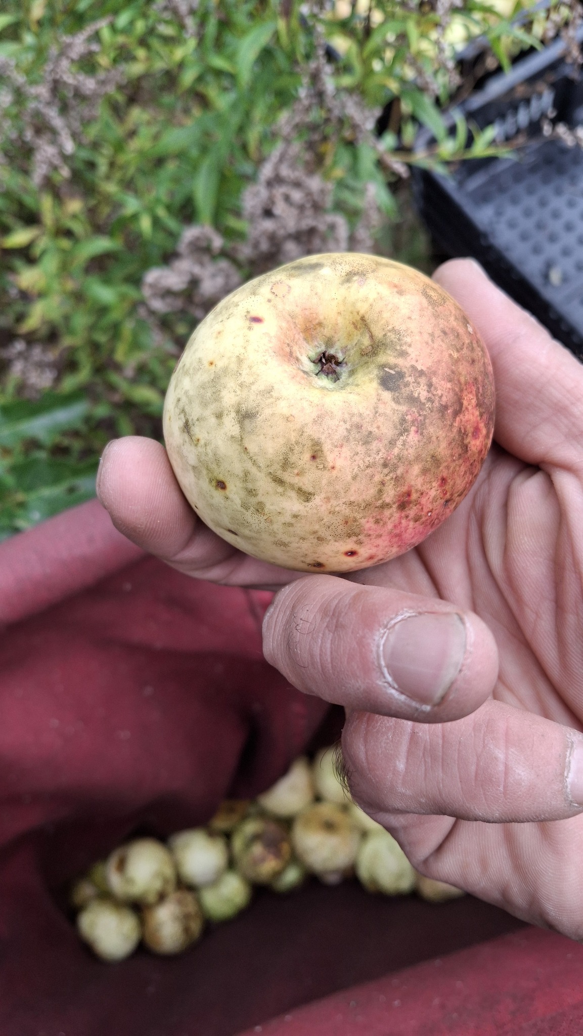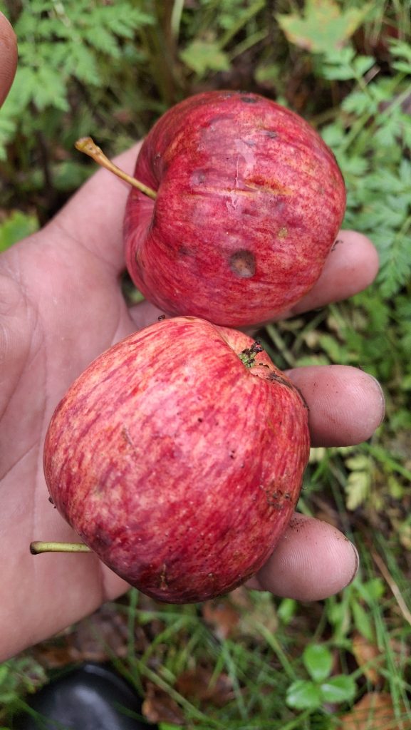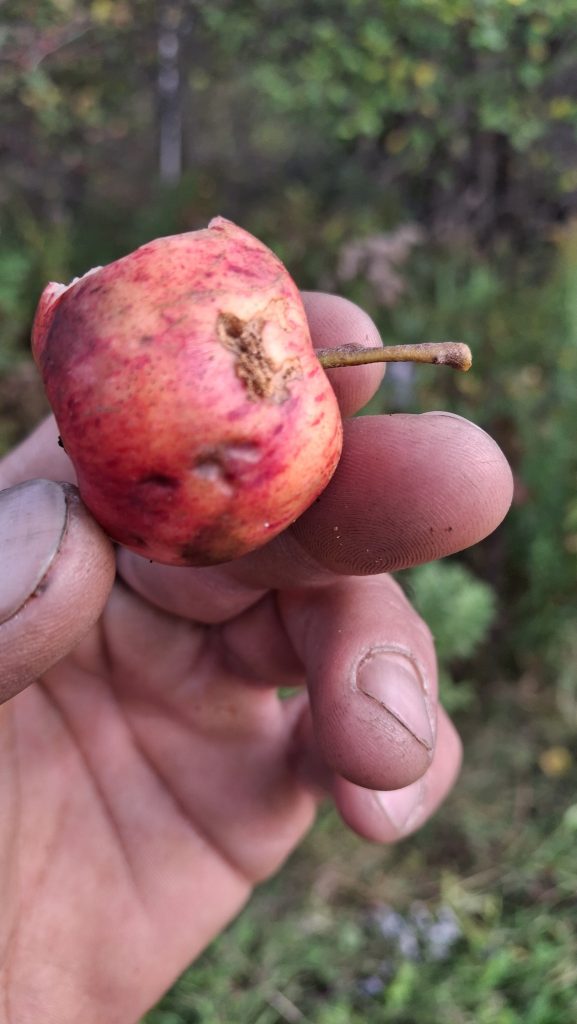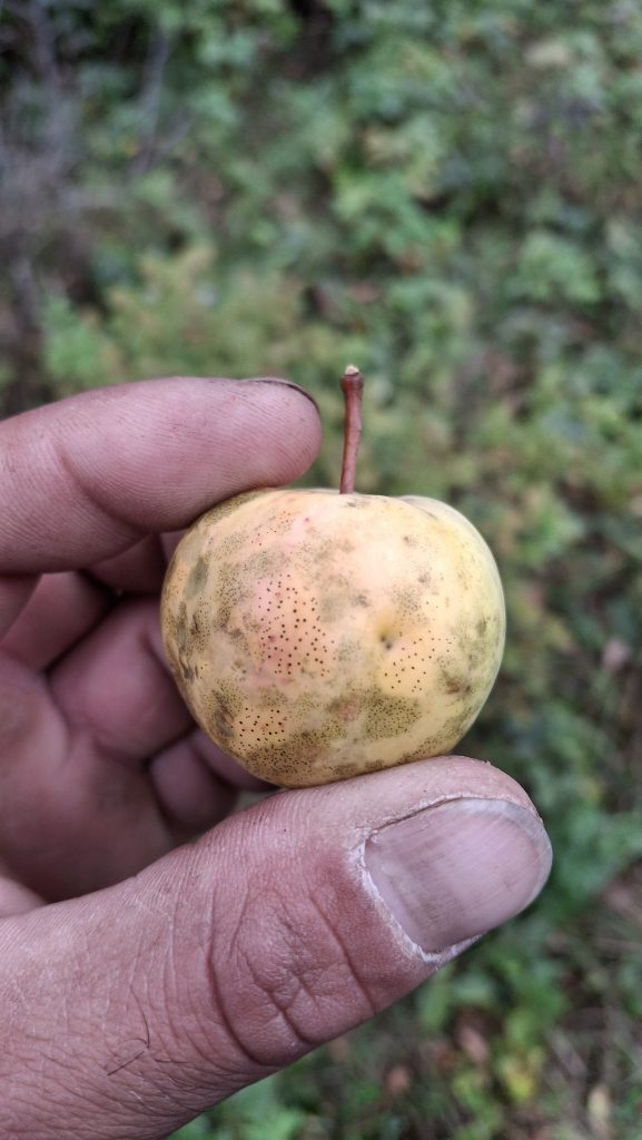 Les activités que je mène en lien avec les pommiers de la région me sont sources de rencontres (et de joies), bien plus encore que de revenus. Chaque année il y a des surprises, de nouvelles personnes qui se trouvent sur le chemin, qui m’en apprennent, m’accueillent, m’ouvrent leurs portes et leurs pommiers, petits vergers ou parcelles en friches où ont proliféré les sauvageons de l’espèce Malus. Des pommes aussi toujours que je rencontre pour la première fois, et pour lesquelles j’ai un coup de cœur.