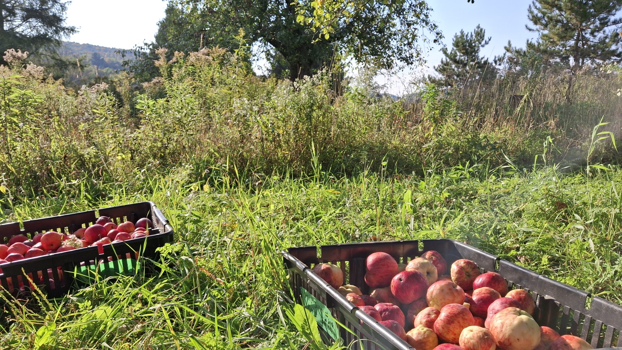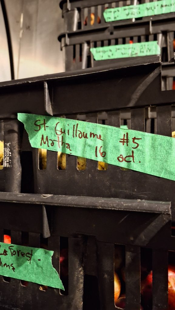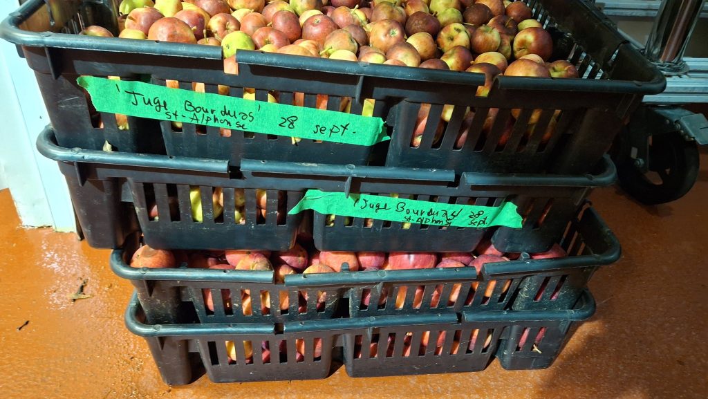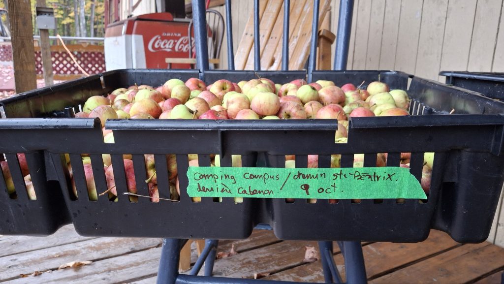 Comparativement à l’an dernier (alors que les talles étaient plus garnies et que j’avais tout mon temps pour m’y consacrer) où j’en avais rempli 180, c’est un total d’environ 135 caisses que j’ai comblé de pommes cette année. Les trois-quart de mon record de 2023, c’est quand même pas pire ! Pommes qui furent pratiquement toutes destinées au pressoir et à la fermentation alcoolique. Mes quelques journées de presse de 2024 seront d’ailleurs le sujet de la prochaine publication, sous forme d’album photo commenté.