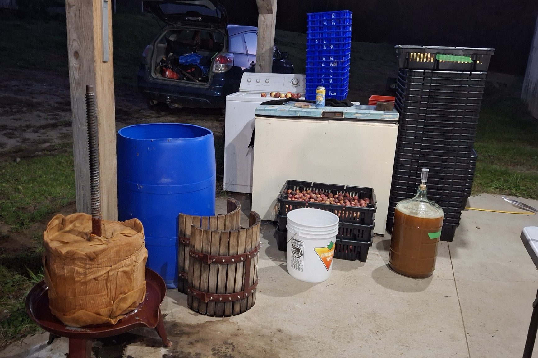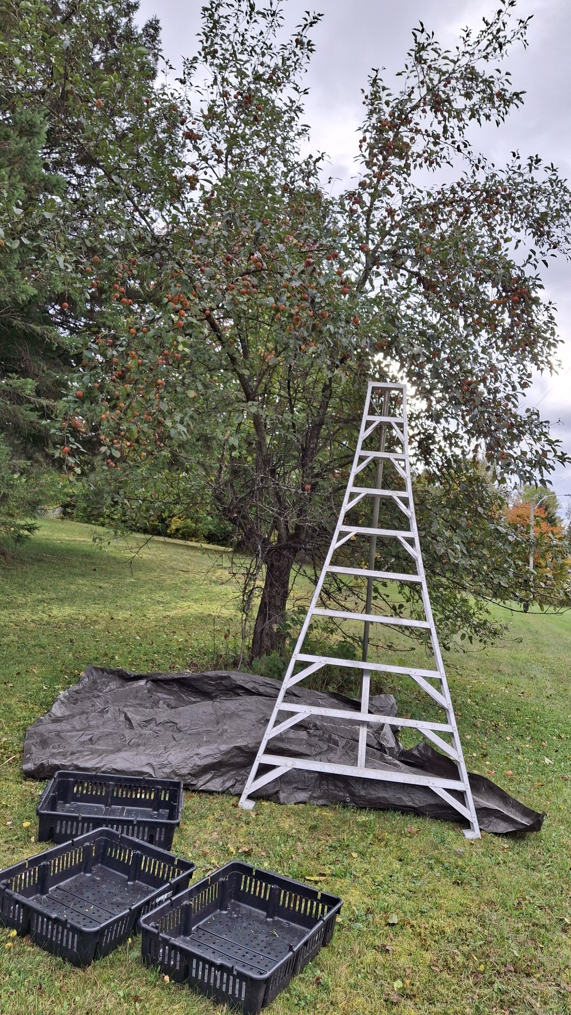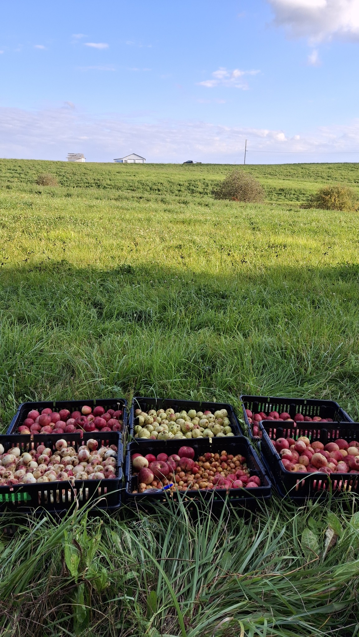 Comparativement à l’an dernier (alors que les talles étaient plus garnies et que j’avais tout mon temps pour m’y consacrer) où j’en avais rempli 180, c’est un total d’environ 135 caisses que j’ai comblé de pommes cette année. Les trois-quart de mon record de 2023, c’est quand même pas pire ! Pommes qui furent pratiquement toutes destinées au pressoir et à la fermentation alcoolique. Mes quelques journées de presse de 2024 seront d’ailleurs le sujet de la prochaine publication, sous forme d’album photo commenté.