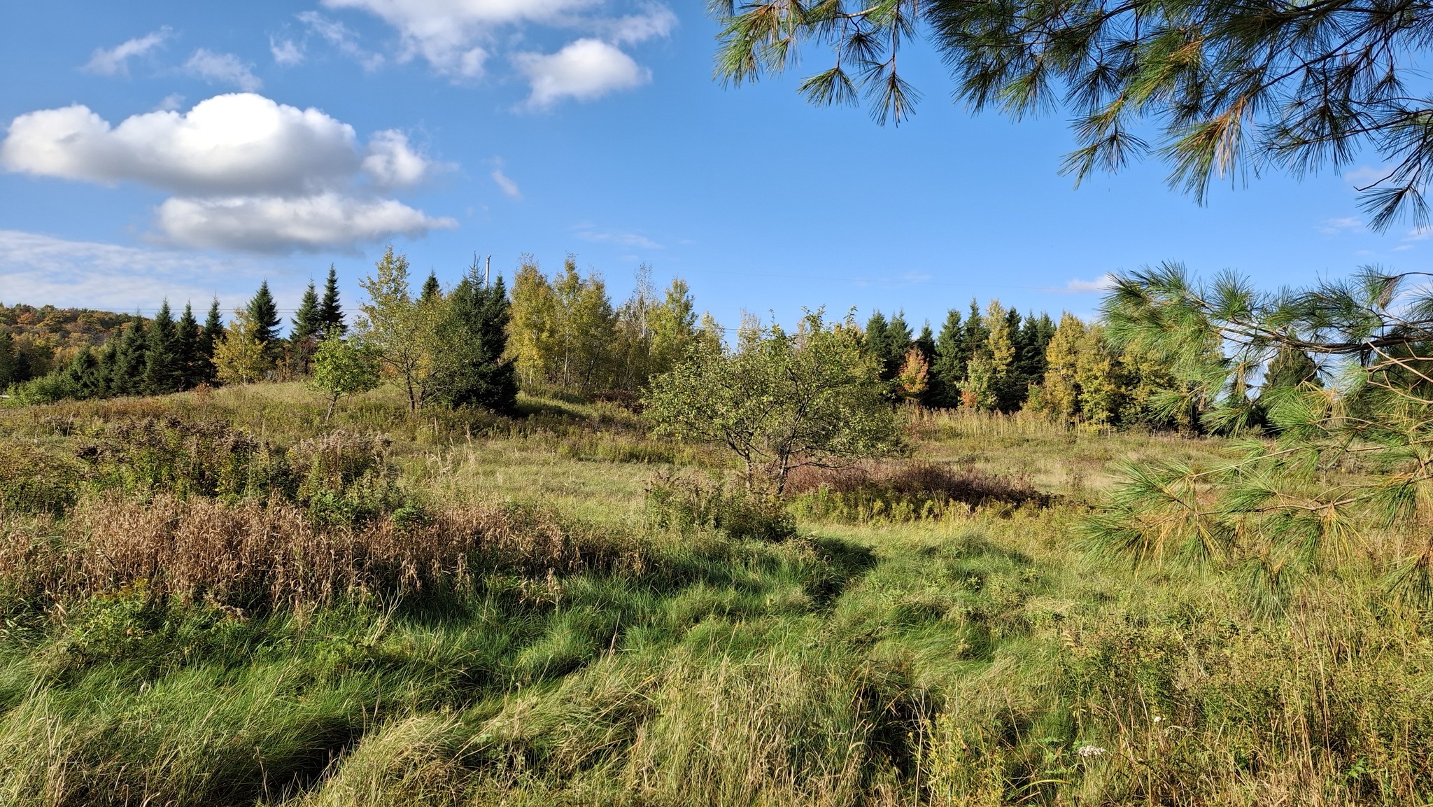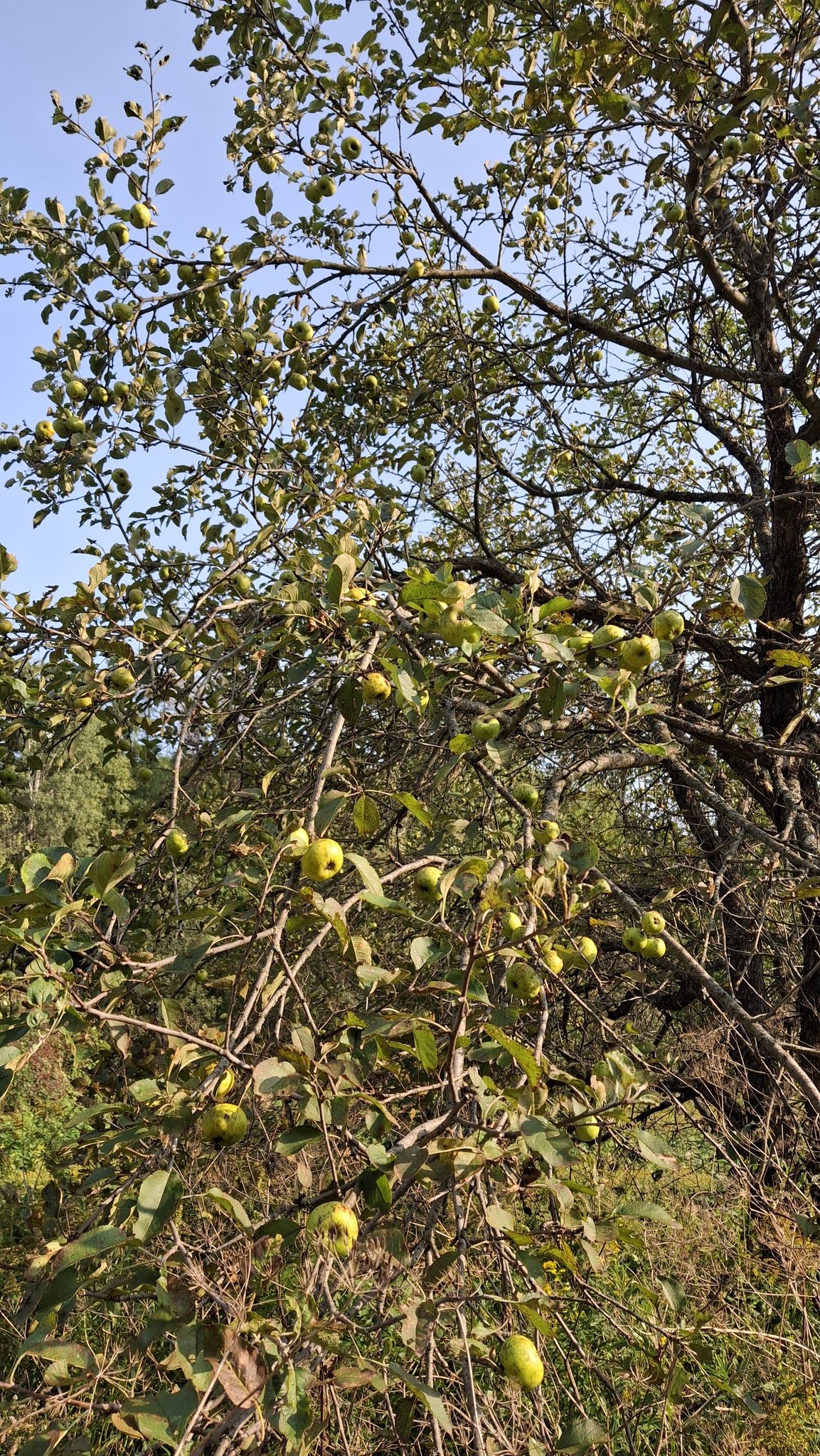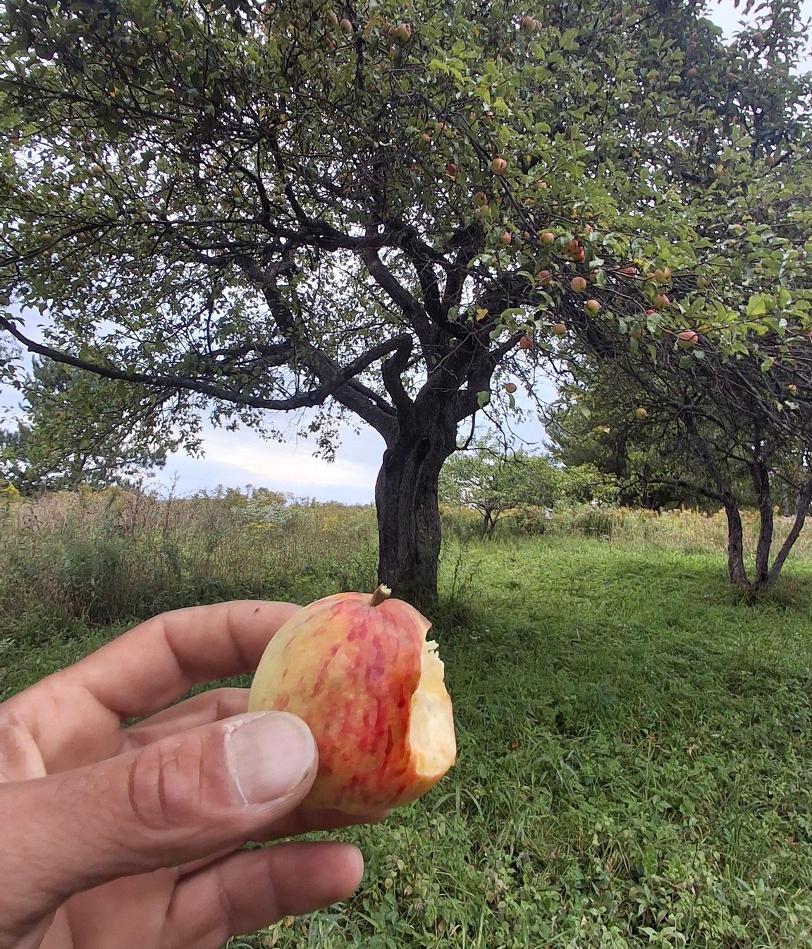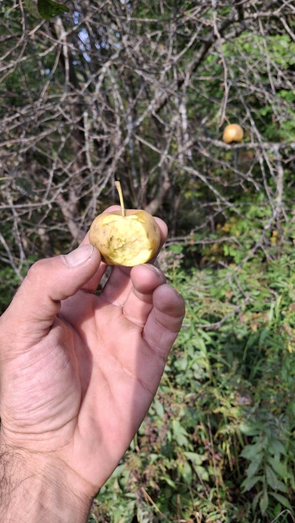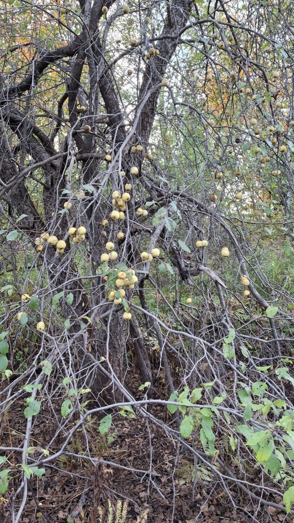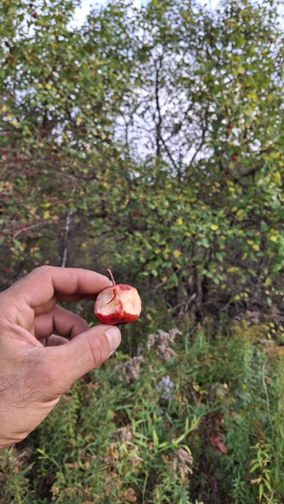 Marcher longtemps jusqu’à la voiture, à travers les herbes hautes et le ruisseau à traverser, de larges enjambées.Chemin du Portage, St-Didace, une talle éparse de pommiers sauvages hors du commun dans une vieille prairie en friches.« Gnarly pippins » comme disent les camarades aux USARamper entre les branches basses et glaner les fruits dont le sol est jonché.Branches qui ploient bien sucrées les petites jaunes, ni trop acides.Pépites d’amertume au bout des branches d’un pommier pleureur, au pays d’Ailleboust.J’y grimpai cette année encore, pour secouer quelques branches en hauteur.Luxuriant verger de ce fonds d’ancien rang de colonisation reliant autrefois deux paroisses, maintenant rompu.
