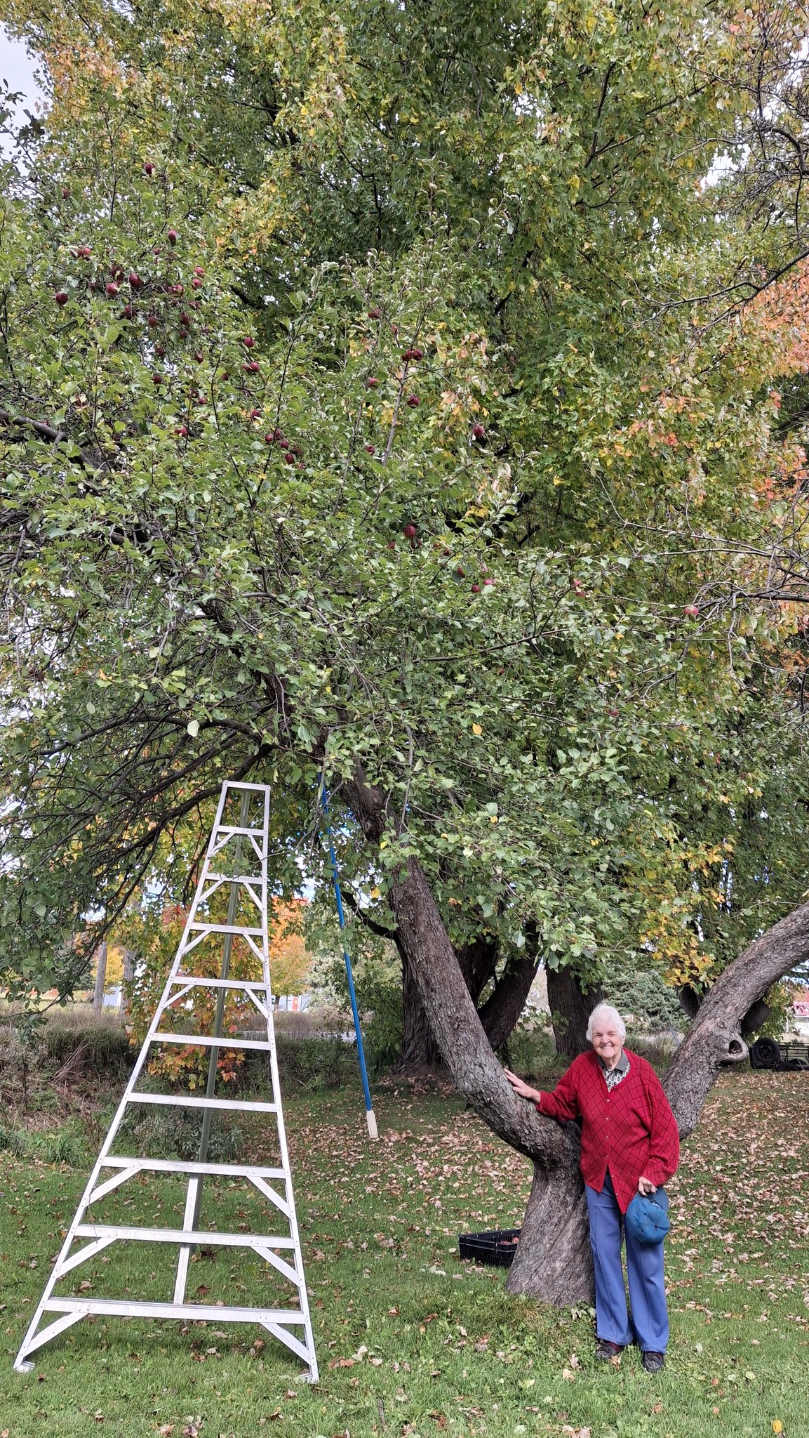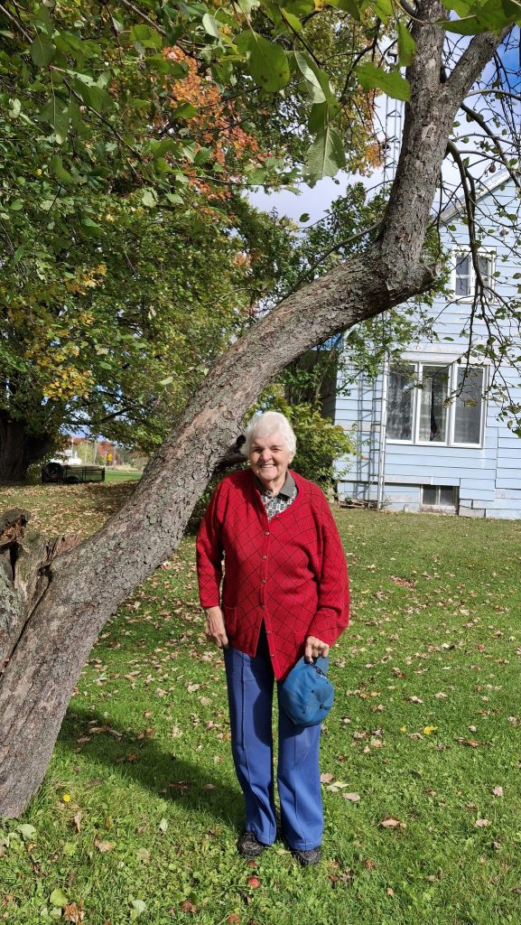 La si gentille et formidable Mme Françoise Desrosiers, 93 ans, aux côtés du pommier (de variété encore indéterminée) qu’elle a planté il y a 70 ans, l’année de son mariage, en 1954. Sur le 2e rang Ramezay de St-Félix-de-Valois.