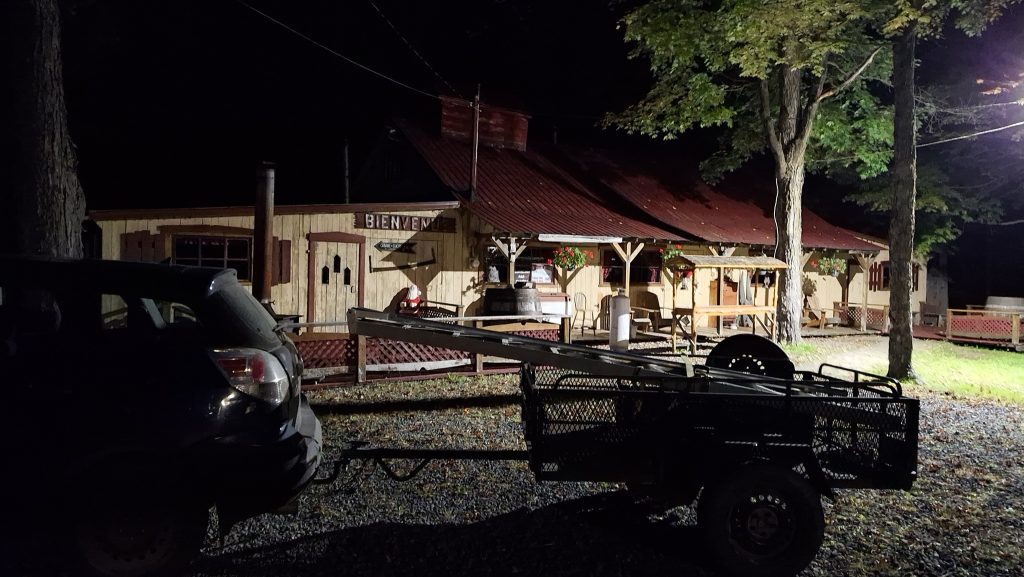 Après une longue journée de cueillette, jusqu’au couchant, devant la cabane à sucre, la remorque vidée de ses caisses de récolte.