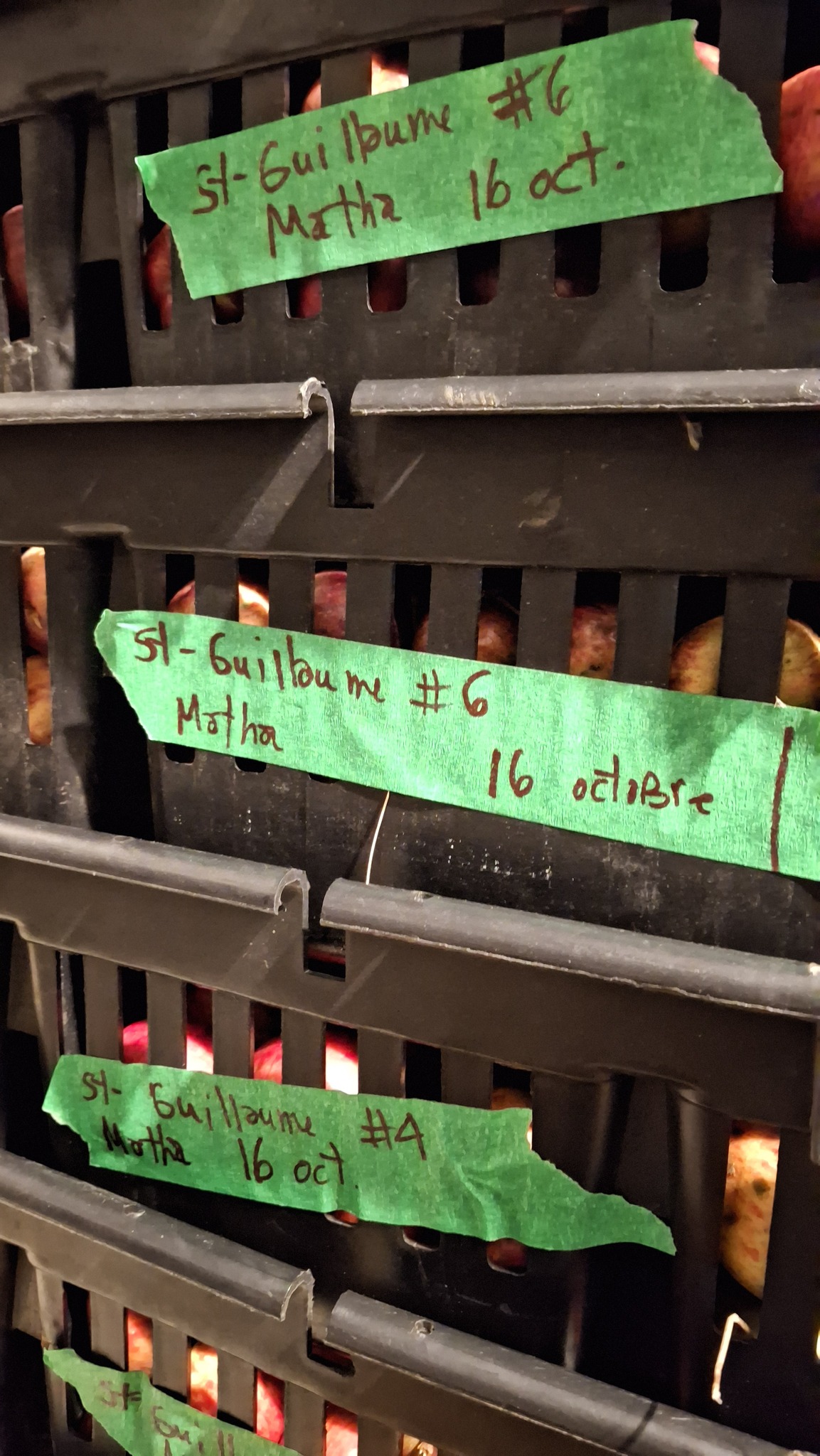 Pouvaient y tenir jusqu’à 60 caisses de récolte à la fois (environ 300 litres de jus).Accumulation progressive « Diane Dumoulin » : nom de code d’un arbre planté il y a 75 ans, sur un terrain au coin des rues Diane et Du Moulin, à Saint-Alphonse-Rodriguez.Occupation pomologique de la moitié droite du grand frigo, qui m’était réservée.