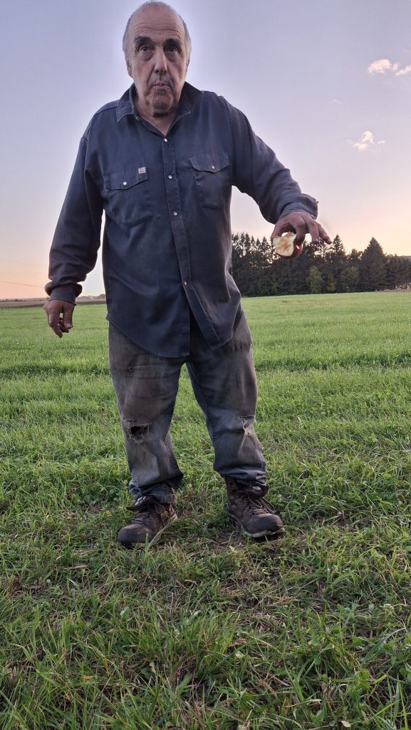 Petit homme et voisin de ces quelques talles où je reviens depuis des années avec l’autorisation du propriétaire, il tient à la main une pomme géante issue d’un arbre qu’il a semé, sans le vouloir, dans sa jeunesse sur la ferme laitière de ses parents. Arbre baptisé ‘Wilbrod’, dont j’avais cueilli les fruits quelques minutes plus tôt, avant qu’il ne surgisse à mes côtés et m’accompagne pendant un moment, tout en conversations et en connaissance de l’histoire des lieux. Il m’a même aidé à cueillir quelques pommes de la lisière du fossé voisin.