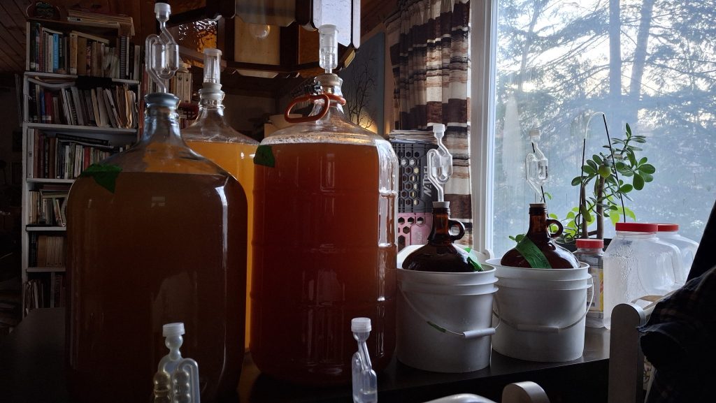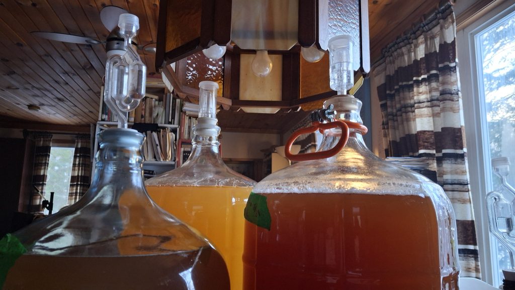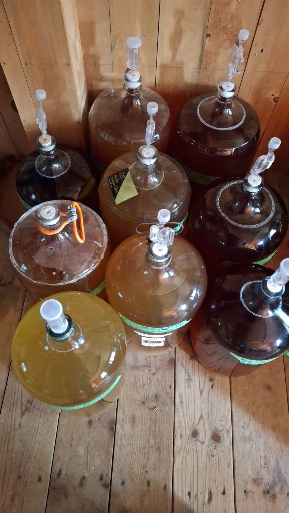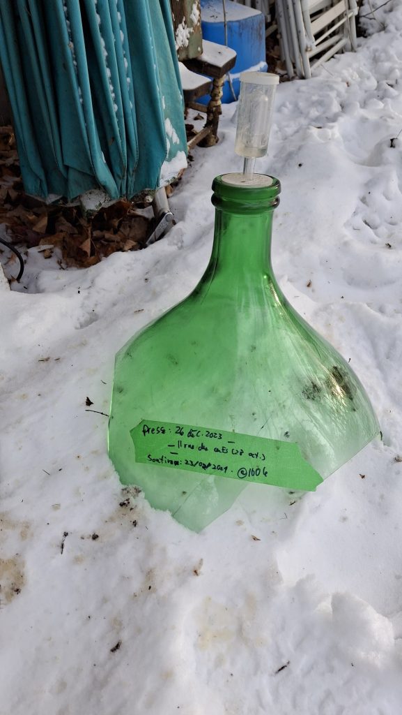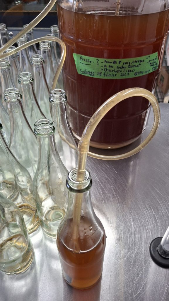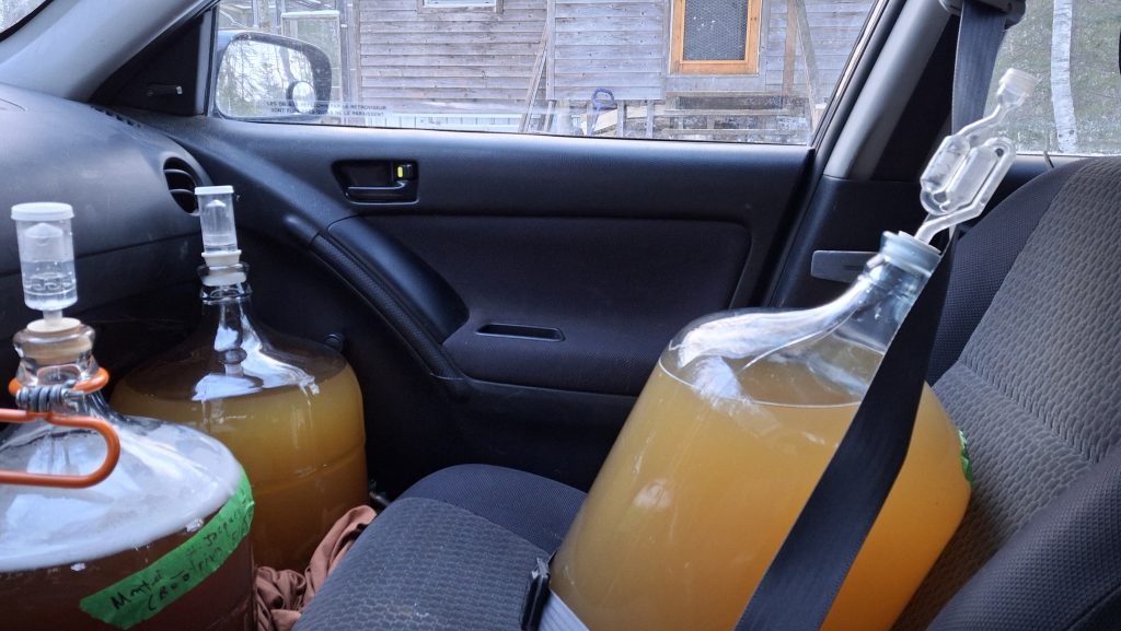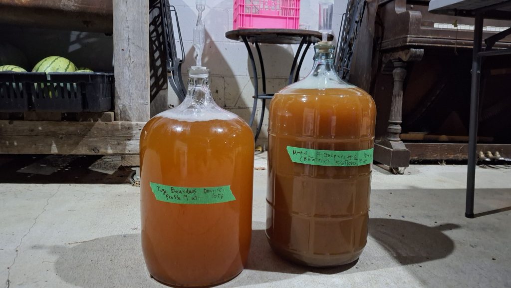 🍎 Le même vieil arbre, pour l’heure surnommé ‘Montée St-Jacques #5’, m’a également donné une formidable manne de pommes, de quoi fournir la brasserie des camarades prairiquois et mes propres activités de micro-cidrerie expérimentale. J’en ai comblé deux petits cruchons de 4 litres, de ce jus trouble et purement monovariétal. De quoi éventuellement remplir de cidre une quinzaine de petites bouteilles de 500 ml, quand même !