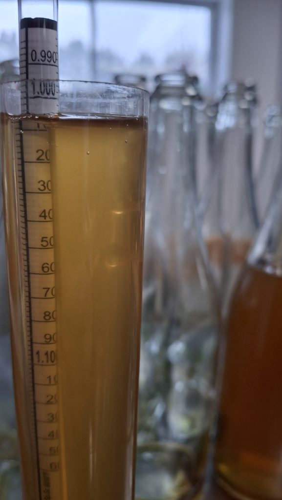 L’âbre-mère portait beaucoup de fruits cette année, suffisamment pour en fournir quelques caisses pour la qualité de leur jus à la brasserie Maltstrom, mais aussi pour m’en réserver et tenter de mon côté la fermentation alcoolique d’un cidre monovariétal. Toutefois, il s’en fallait de peu pour bien remplir la touri de 20 litres à partir du jus de ce seul arbre. Pour les 3-4 litres manquants, j’ai ajouté le jus de pommes du même verger, de l’arbre voisin en fait (la #5), une belle rouge très sucrée et parfumée, un brin acidulée. Au final, une belle densité de 1050 (potentiel d’alcool d’environ 6,5%).