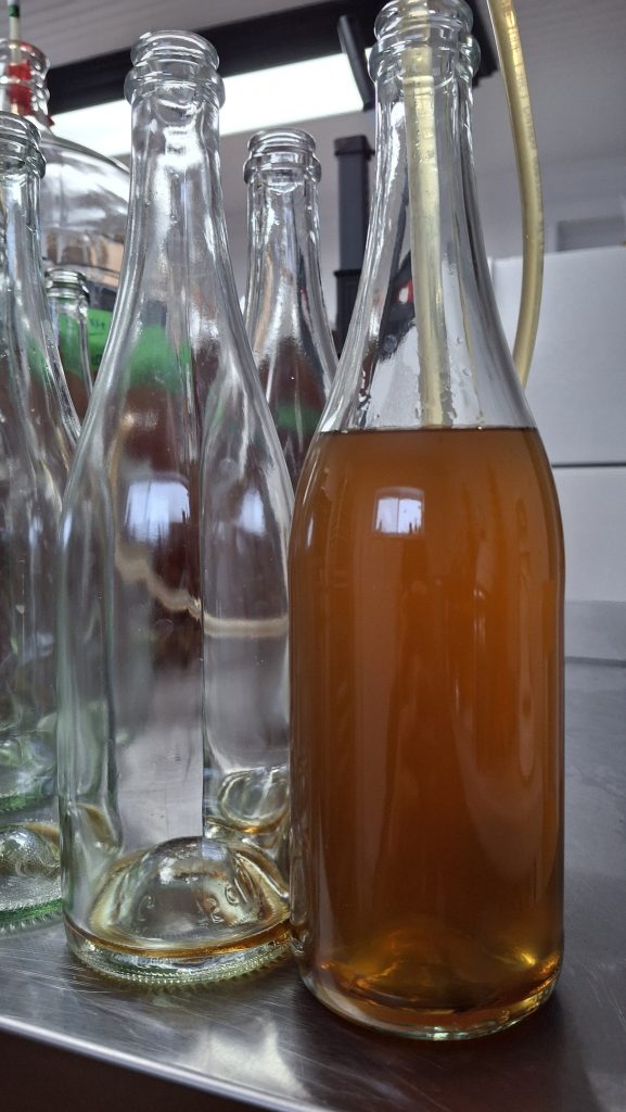 De ces toutes petites pommes, en plus d’en fournir à Maltstrom dans le grand mixage des variétés pour en faire un cidre-bière, j’ai tiré un jus jaune et clair, bien sucré (1056 de densité relative, ou 16 brix dans la visière du réfractomètre), avec une petite amertume. Les quelques caisses de la ‘Juge Bourduas’ que je m’étais réservées contenaient de quoi remplir une petite touri, d’environ 18L. C’est pour moi une première cuvée de cidre monovariétale, sans pour autant avoir une candidate de variété de pomme idéale à mon goût (pas assez d’amertume), bien que bien sucrée et savoureuse, aromatique.