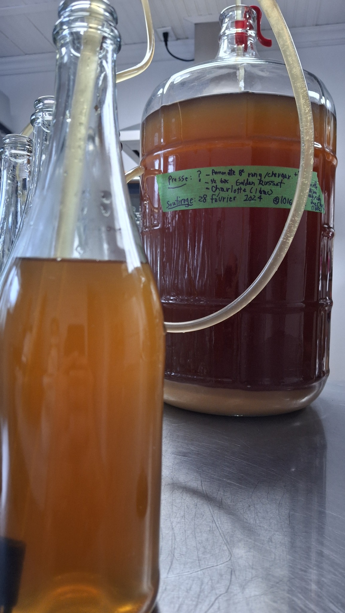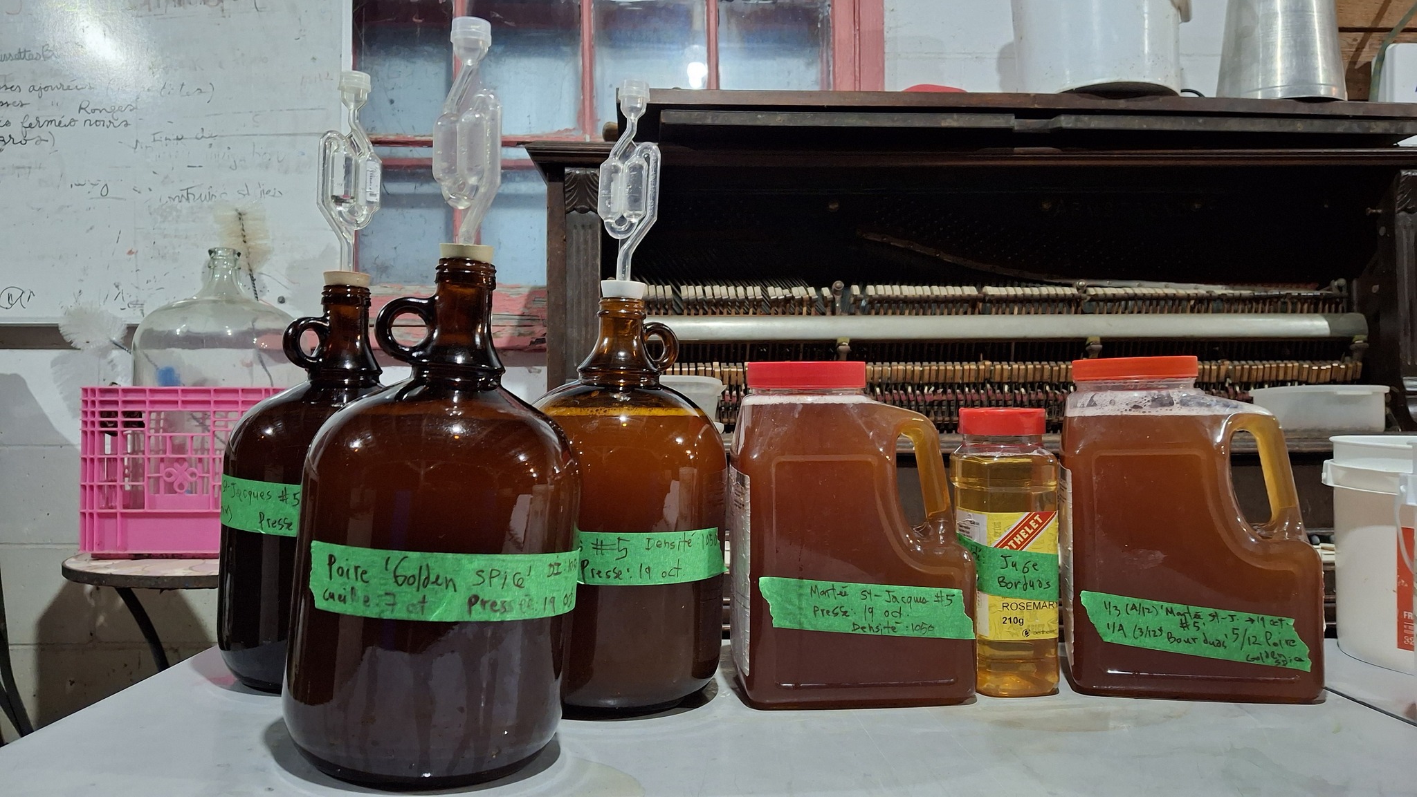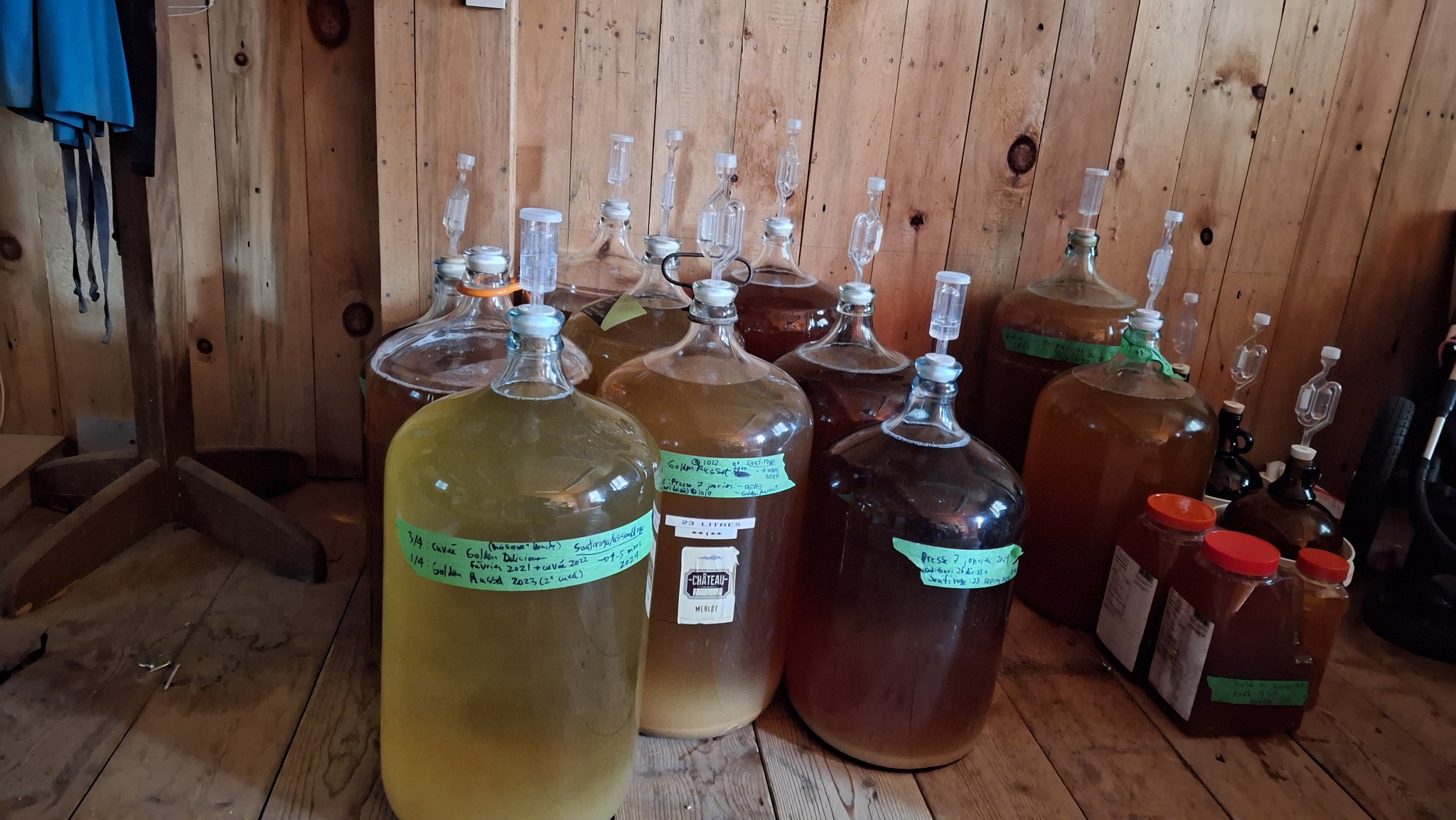🍐🍎Deux autres litres de jus de ‘Golden Spice’, queue de la pressée, ont été assemblés avec les restants de jus de pommes des pressées de la journée. Les surplus de la ‘Juge Bourduas’ et de la ‘Montée St-Jacques #5’. Allez hop, j’ai viré ça dans un autre cruchon de 4L, bien rempli d’un jus qui sera dans quelques mois le produit d’une cofermentation, ni tout à fait cidre, ni tout à fait poiré. Un joyeux hybride funky issu aussi des levures sauvages qui s’y activent en ce moment, comme toutes les autres cuvées de l’année, à 12 degrés Celsius dans un bâtiment appartenant à des amies. Merci pour l’opportunité de local avec une température appropriée ! Hâte de vous faire goûter au jus qui va en résulter !