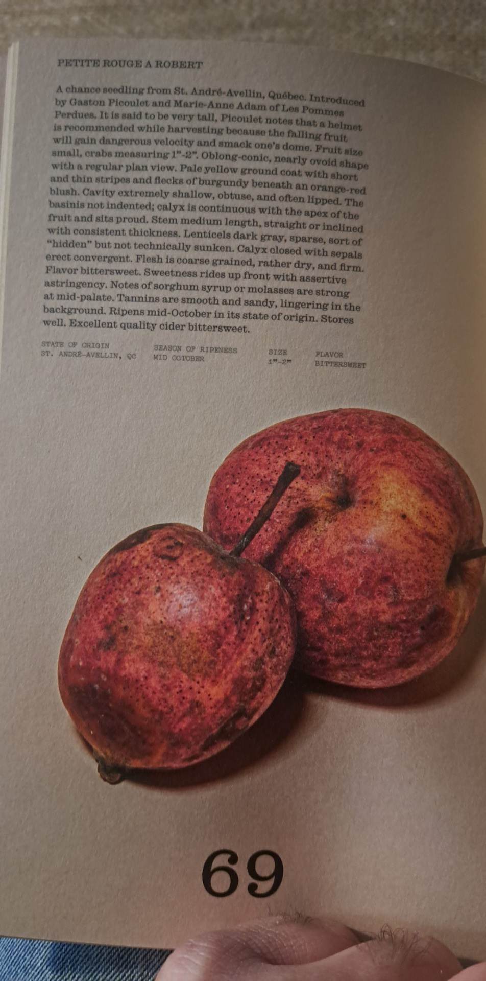 En ce qui concerne les pommes à cidre, l’ouvrage de référence de Jean-Michel Boré et Jean Fleckinger s’est avéré sans surprise le plus utile, comme les variétés expérimentées dans la pépinière des Trappistes étaient essentiellement originaires de France. On peut y lire les fiches de description pomologique de 16 des variétés du lot. Voyez en guise d’exemple (dans les images ci-jointes) celle de la ‘Binet gris’, une douce amère obtenue de semis en 1868 par M. Legrand, pépiniériste à Yvetot en Normandie.
