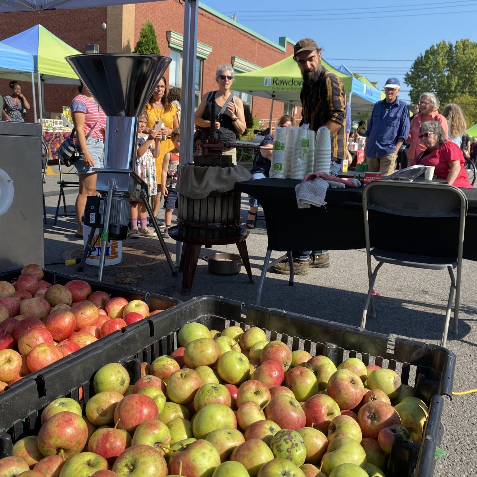 Démonstrations publiques de presse de jus de pommes sauvages et distribution de verres de ce jus lors de Marchés Publics Lanaudois. Depuis 2024.