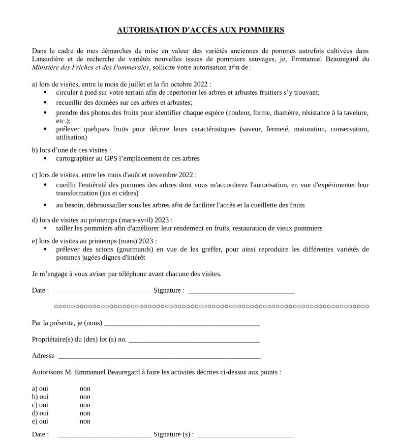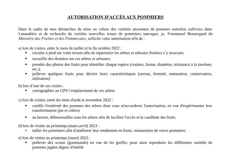 Obtention des autorisations d’accès aux arbres et de cueillette (usufruit) de la part des propriétaires de terrains où se trouvent des pommiers dont je souhaite cueillir les fruits.