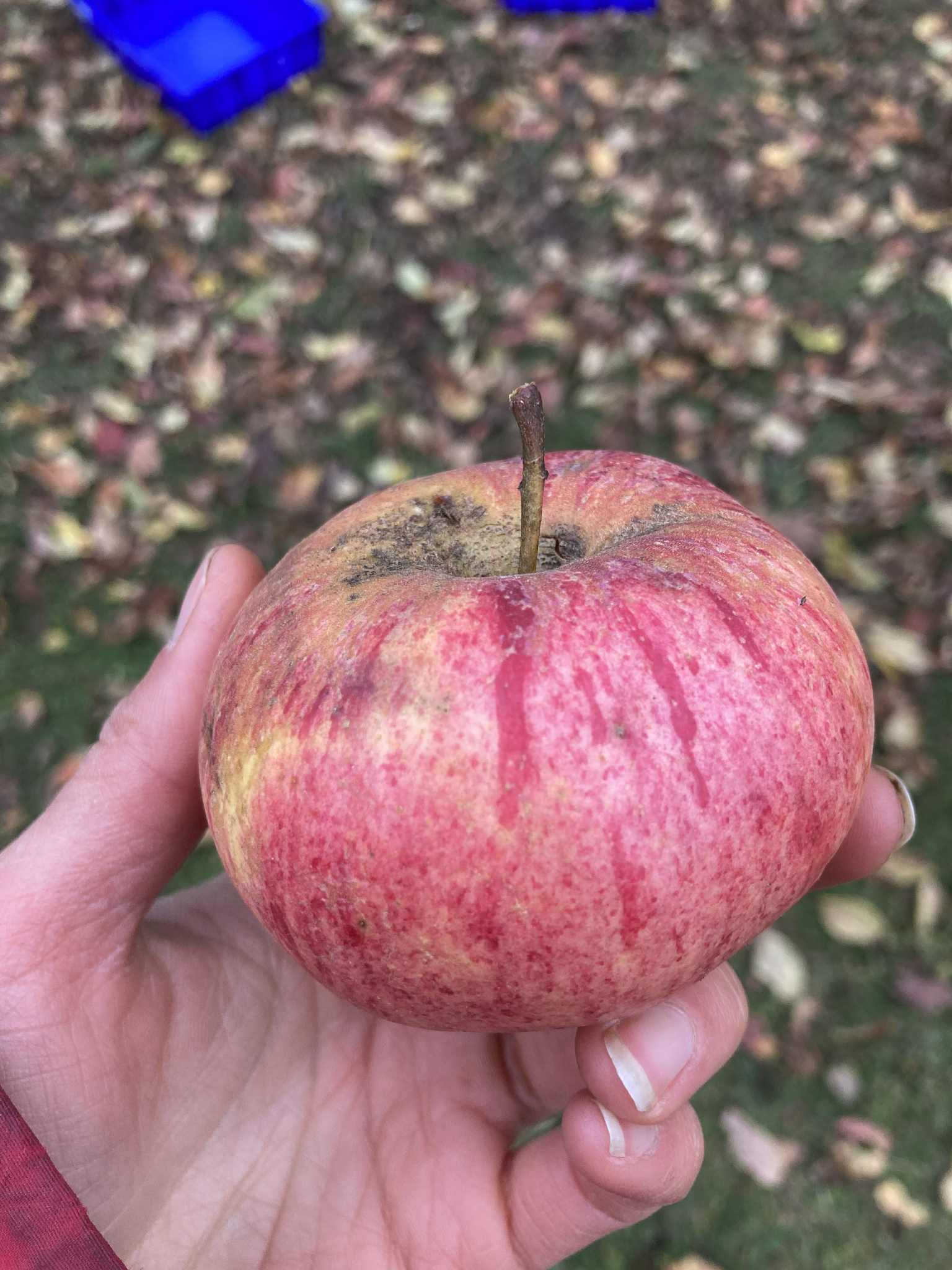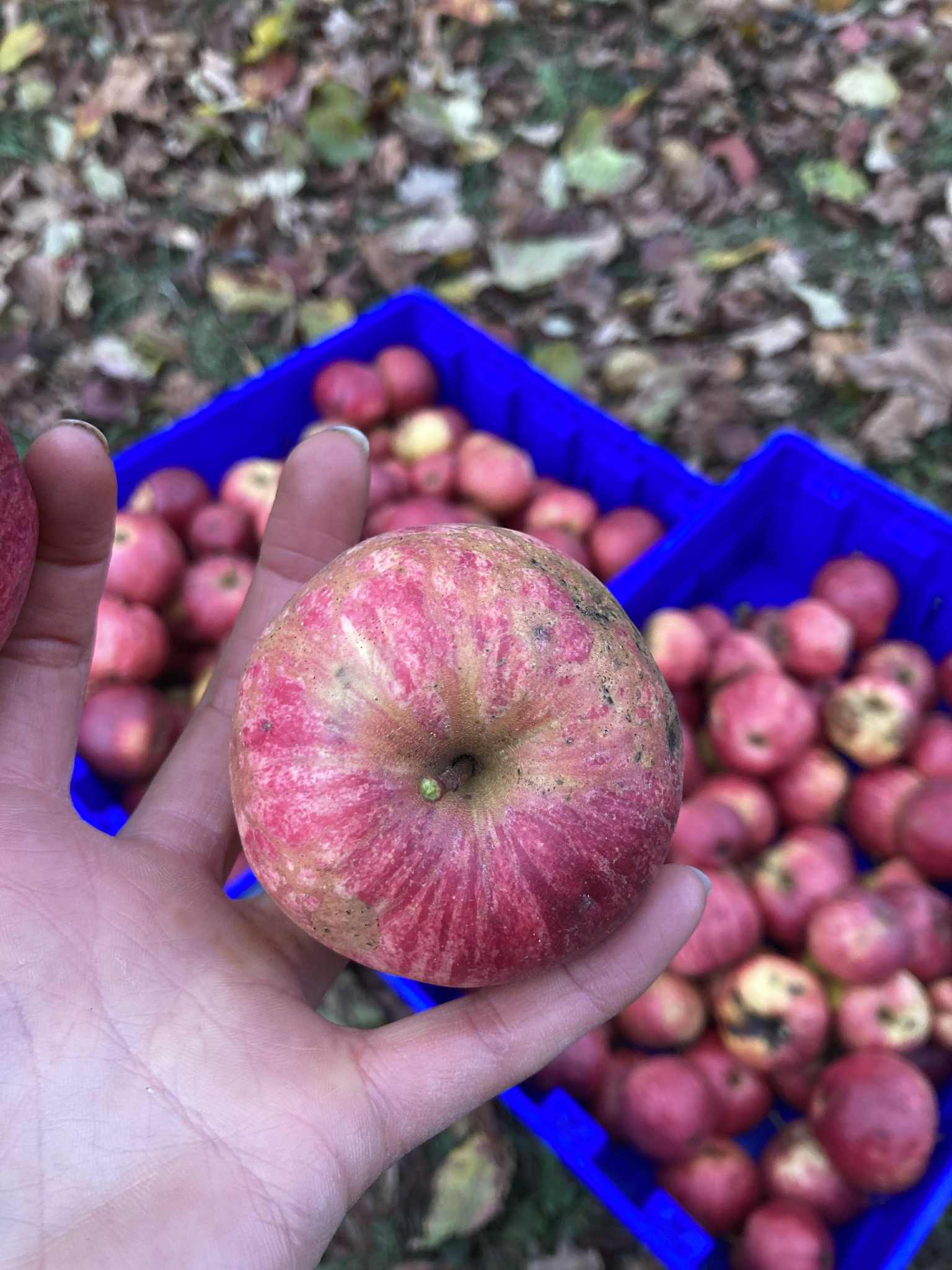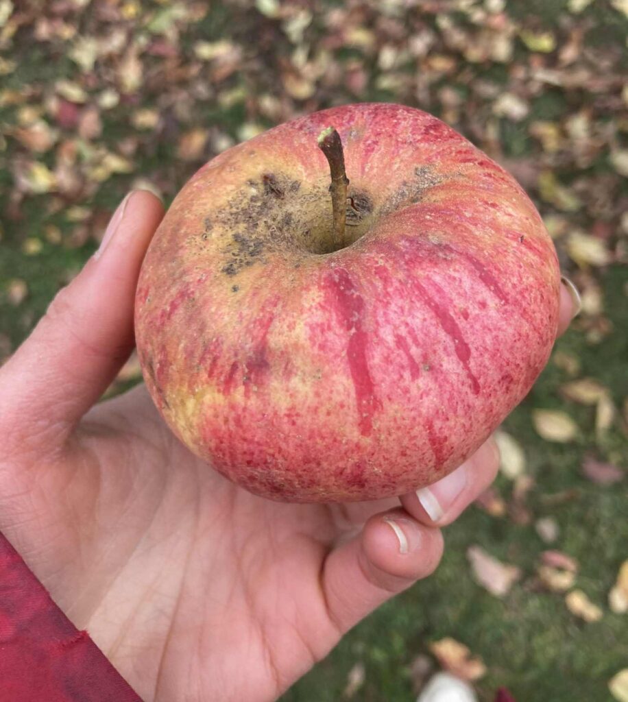 Cet automne je me suis de nouveau présenté à la porte de la maison au bout d’un certain « draïvoué », où j’étais allé cogner quelques fois, sans succès ces dernières années… Une dame enfin m’a ouvert, nouvelle propriétaire depuis environ un an, et suite à ma brève présentation m’a accordé la permission de récolter des fruits de l’imposant pommier que j’avais spotté dans un coin de sa cour. Je n’en avais même pas encore regardé de près les fruits, encore moins pris une croquée dans l’une de ses pommes. Seulement, je voyais bien, de cette route de campagne où je passe souvent l’automne, que l’arbre était chargé de beaucoup de rougeâtres fruits, jusqu’alors « défendus ».
