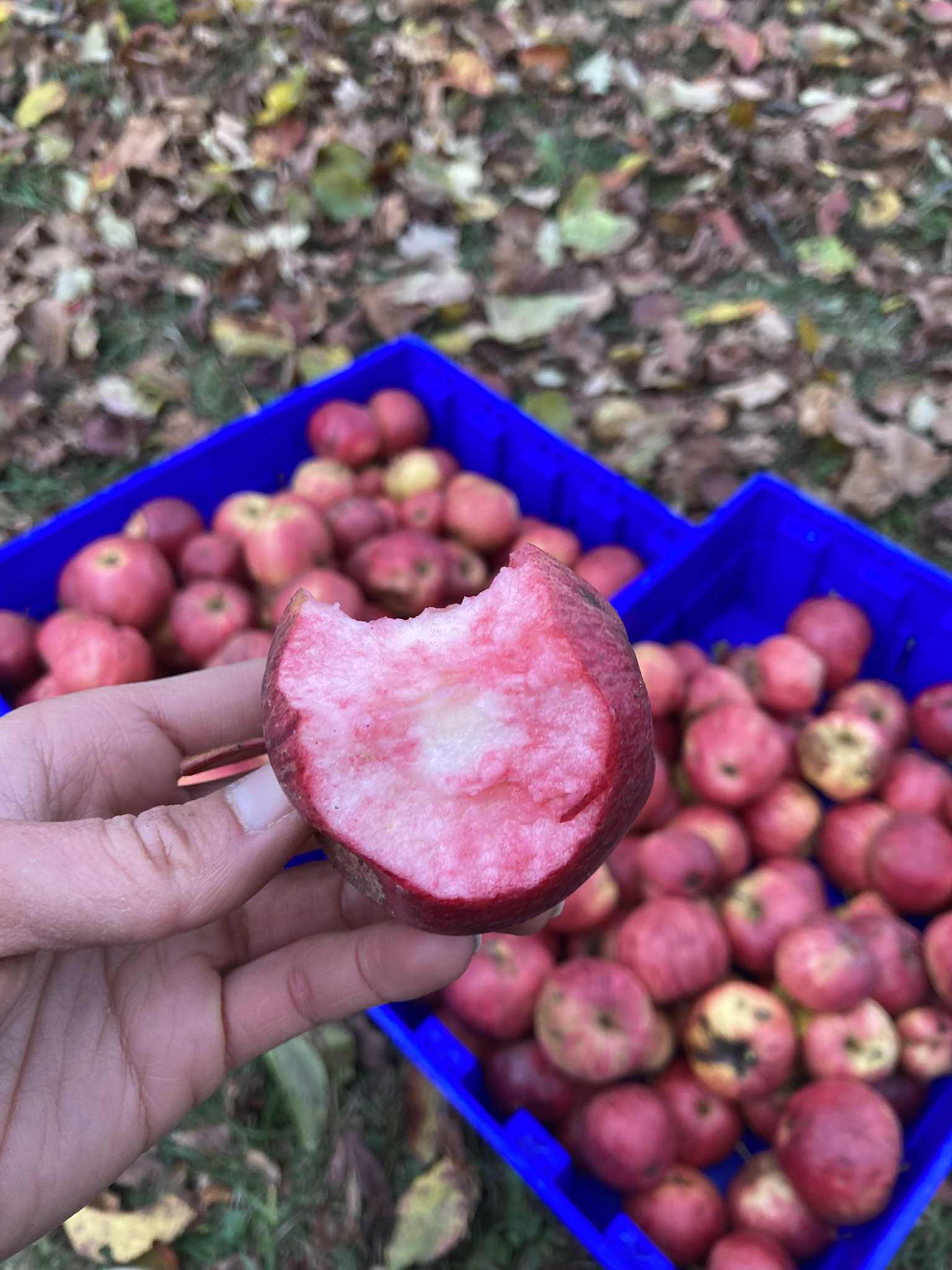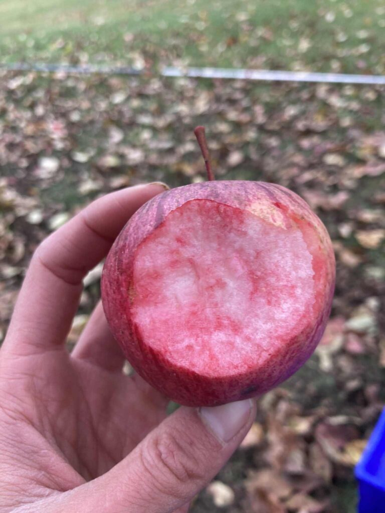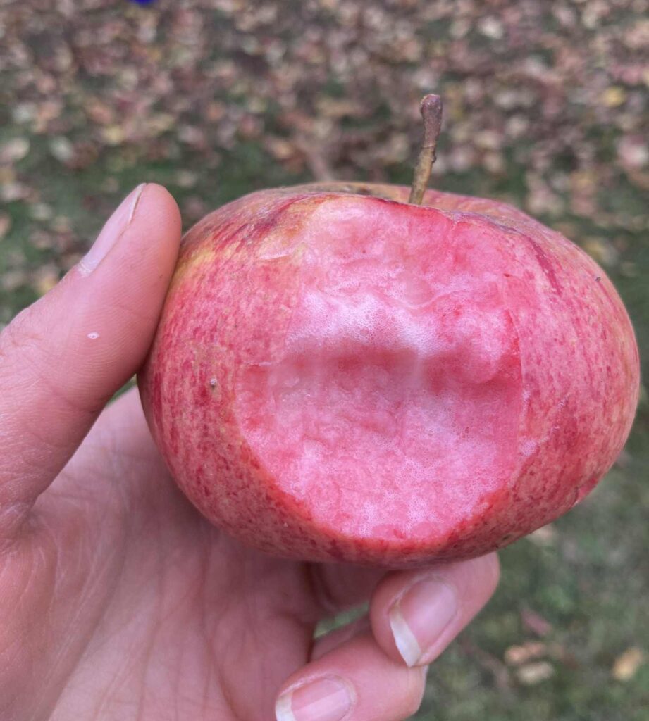 Surprise et joie au moment de la révélation : la chair des pommes est très rosée, juteuse, passablement sucrée, avec une acidité probante – mais qui ne fait pas grimacer, et une légère astringence. Des pommes saines, à peu près pas piquées, fermes, sans doute en mesure de se conserver longtemps. Sans hésitation, j’y vois une pomme à expérimenter avec l’intention d’en tirer un cidre rosé, probablement en l’assemblant avec une proportion de pommes douces-amères (plus sucrées, ayant peu ou pas d’acidité, et des tanins amers plus prononcés).