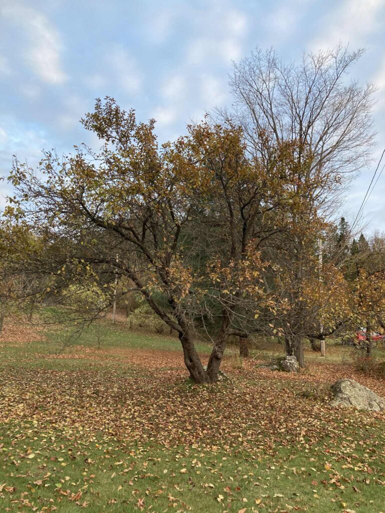 L’arbre a deux troncs principaux partant du sol, fait plus de 20 pieds d’hauteur, a des charpentières solides et saines et n’a visiblement pas été taillé depuis des années. Il portait des pommes en quantité jusqu’à sa cime. J’ai brassé les branches, grimpé dedans en hauteur comme un ours, mais des fruits échappaient à ma portée.