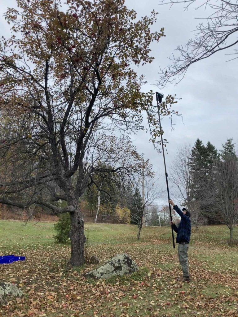 J’y suis retourné trois fois au fil des semaines d’octobre, cueillir les fruits en différentes séquences. La dernière fois, il y a quelques jours, j’avais le plaisir d’être accompagné par la coordonnatrice de l’organisme Les Fruits Défendus (Montréal), l’amie Simone Chen. Elle est arrivée équipée de deux longues perches télescopiques – dotées de crochets et d’un petit sac pouvant contenir quelques pommes -, formidables outils de récolte pour des pommiers géants comme celui auquel nous avions affaire. On a pu ainsi secouer les branches fruitières du haut, et récolter jusqu’au dernier fruit !