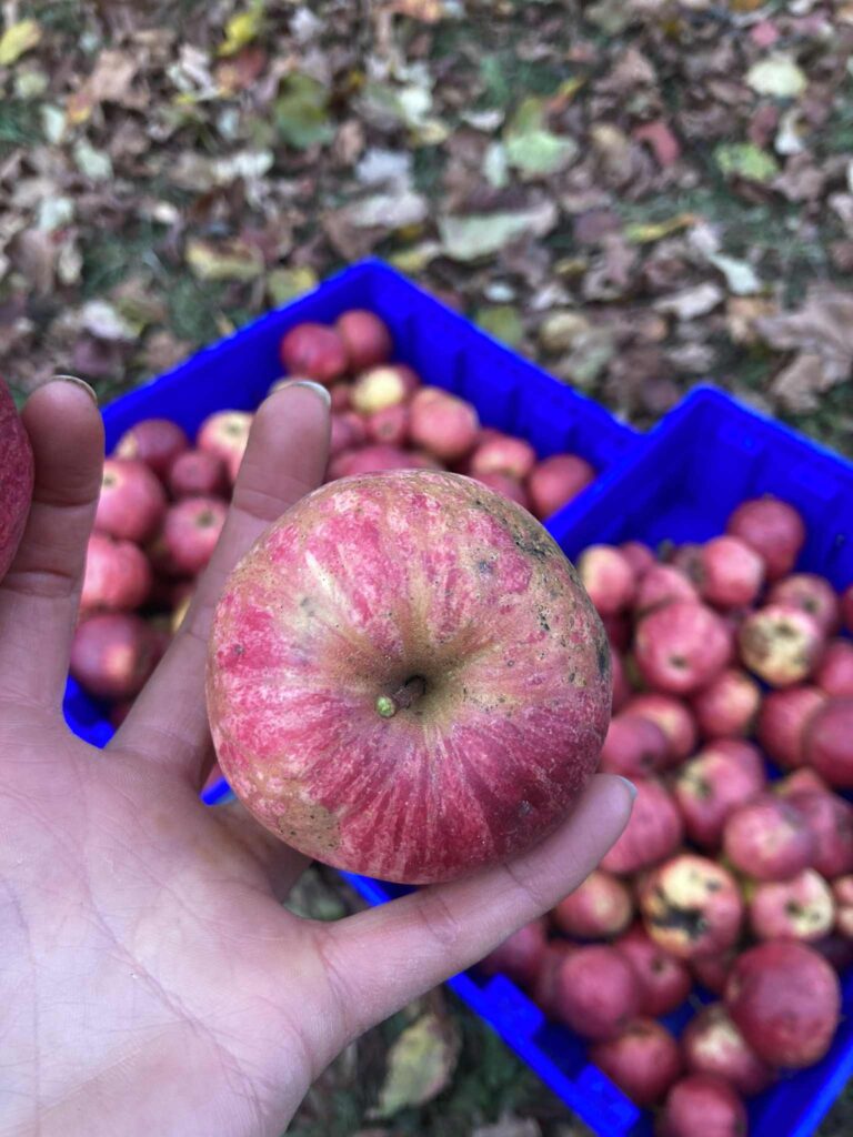 Réjouissances de partager la trouvaille, le travail, et l’enthousiasme pour la découverte d’une variété aux caractéristiques inusitées, cela à travers des échanges philosophiques sur la transformation d’arbres et de lieux privés en Communs, sur la valeur d’usage qui devrait primer sur la valeur marchande, nous amusant à trouver des noms savoureux pour des sauvageonnes cueillies ensemble ce jour-là. En se disant que ce qui compte d’abord et avant tout dans cette aventure pomologique, c’est la joie partagée, les rencontres significatives, les relations humaines, les richesses de l’histoire locale et les mystères poétiques derrière ces arbres et fruits uniques – certainement des œuvres collectives !