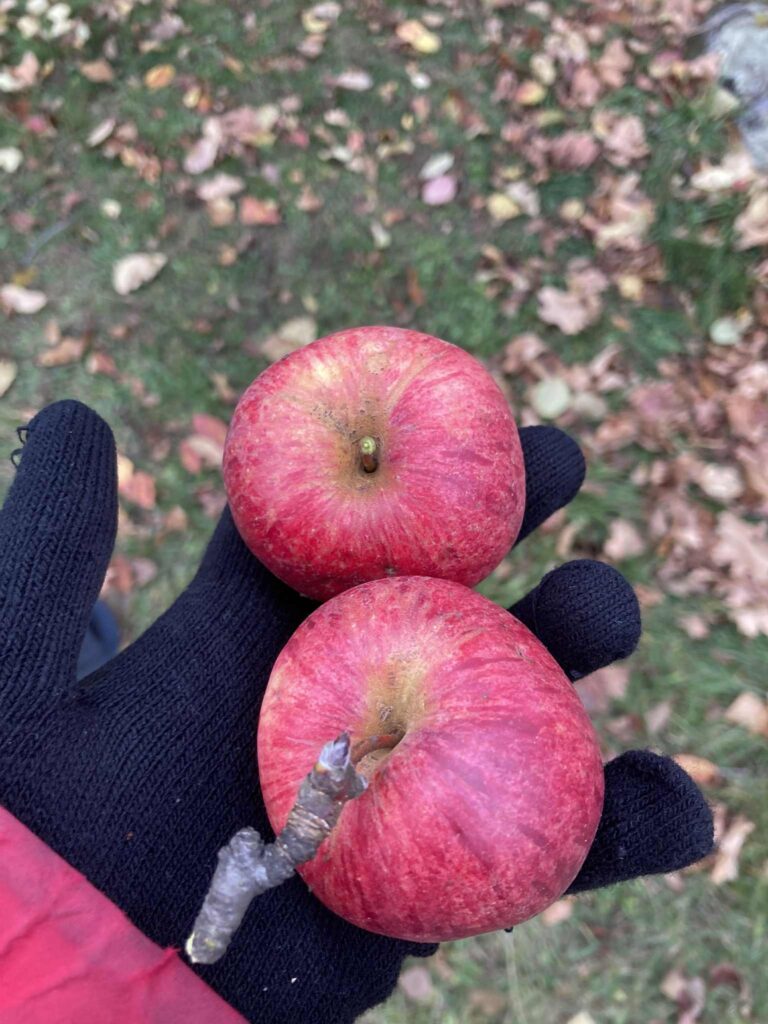 Nous retournerons y récolter des scions le printemps prochain, dont certains seront certainement partagés avec un ami commun, l’hybrideur de pommes Roland Joannin de La Pomme de demain. Tsé veux dire, des pommes à chair rose ou rouge (et pas seulement des veinures) véritablement nées au Québec, c’est rare en « sacréfice » !