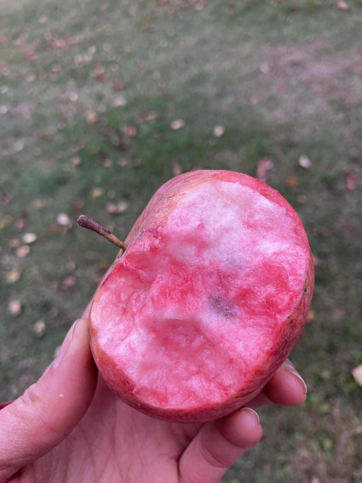 C’est comme ça qu’elle est provisoirement nommée, cette pomme à chair rosée, dont l’arbre, très fort probablement un arbre issu de semis, auquel nous donnons au moins une soixantaine d’années de vie, se trouve en empruntant un vieux rang de Ste-Béatrix (si si, je laisse planer le mystère de son emplacement précis…). Un autre de ces vénérables pommiers devenu un bien commun de notre ruralité, issu de la place, sans véritable propriétaire. Les humains possédant les titres de propriété des terrains où prolifèrent ces pommiers sauvages ne portent souvent aucun intérêt aux fruits qui abondent, années après années.